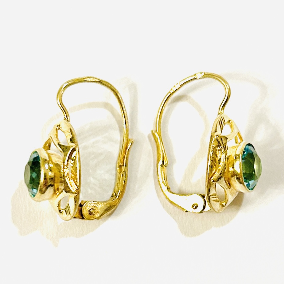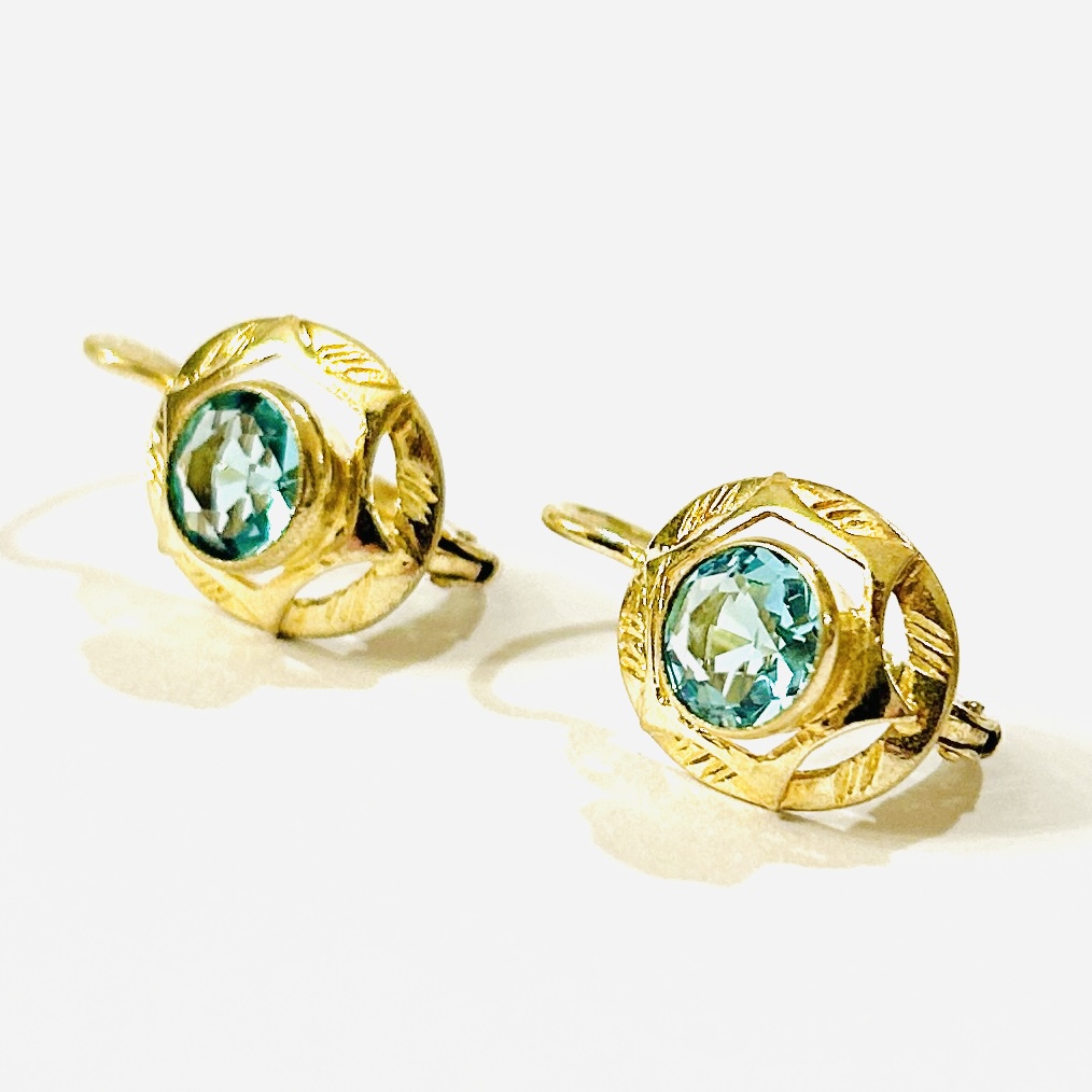 Elegantní náušnice v bruselském stylu, oválná hlavice s hvězdicovou aplikací zdobena rytím a osazena v hladké obrubě skleněným modrým kamenem kulatého brusu. Práce klenotnického podniku Kovozávody Turnov z 60. let 20. století.