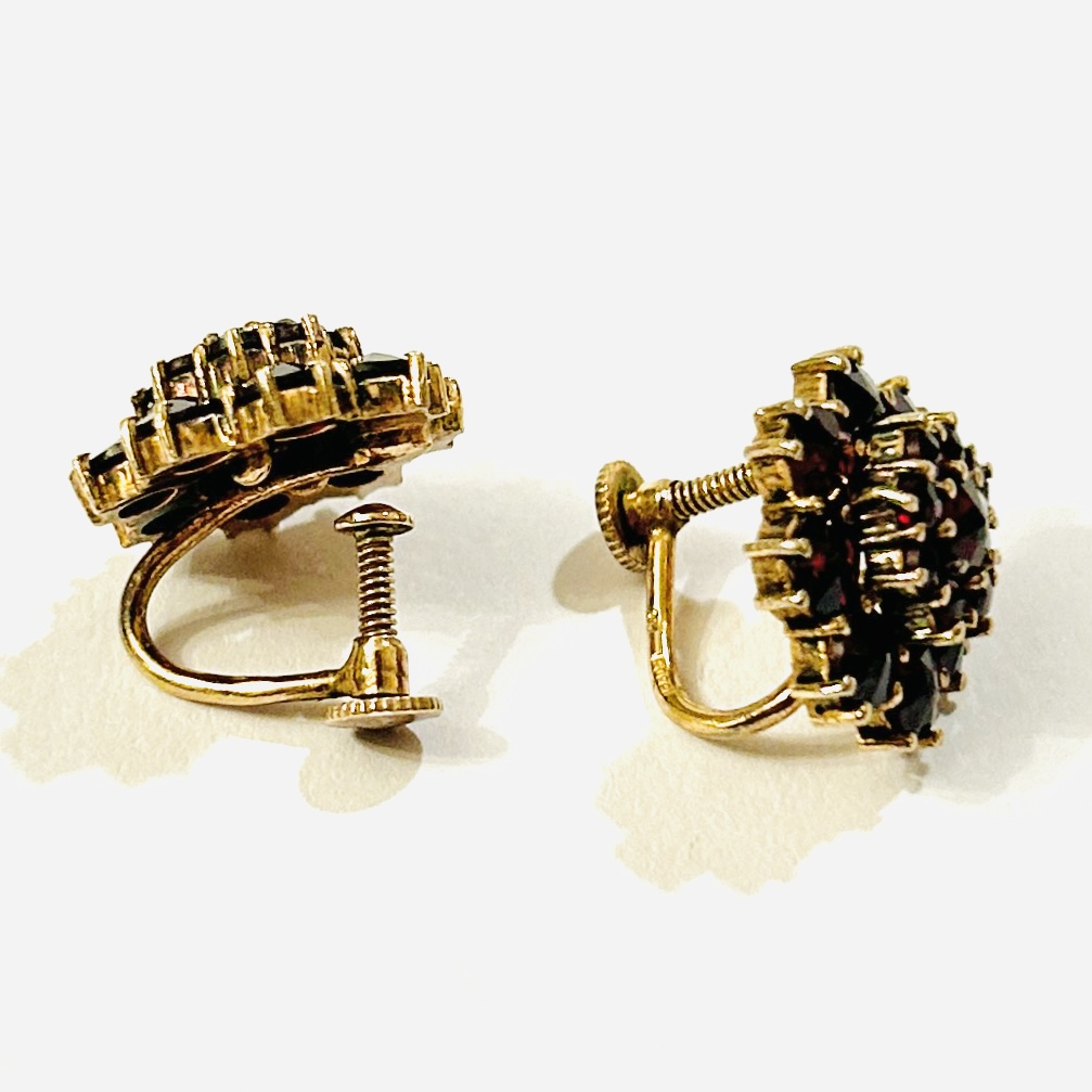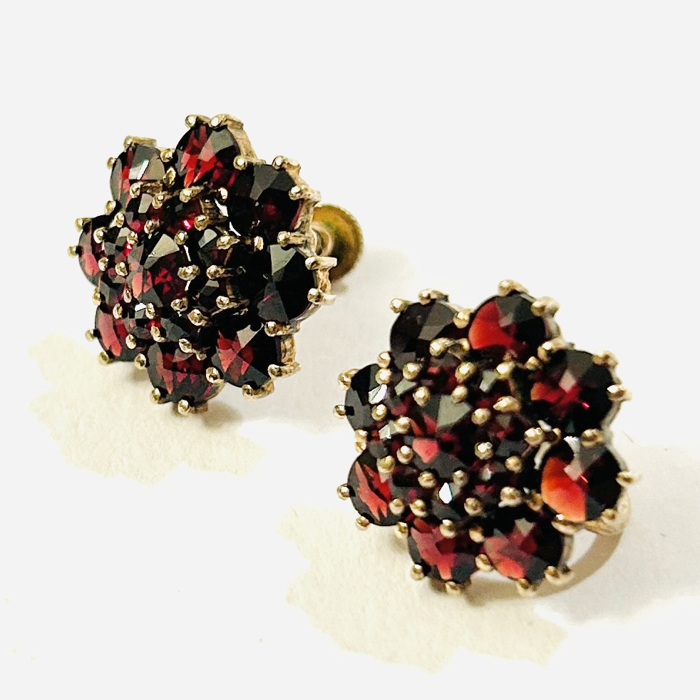 Elegantní náušnice s hlavicí v podobě kulatého květu, v řadách a stupních osázeno českými granáty kulatého hvězdicového brusu, fasováno zrnkovou technikou. Tradiční design, kvalitní granátnická práce DUV Granát v Turnově z poloviny 50. let 20. století, exportováno do Švédska na objednávku stockholmského klenotníka Heriberta Engelberta.