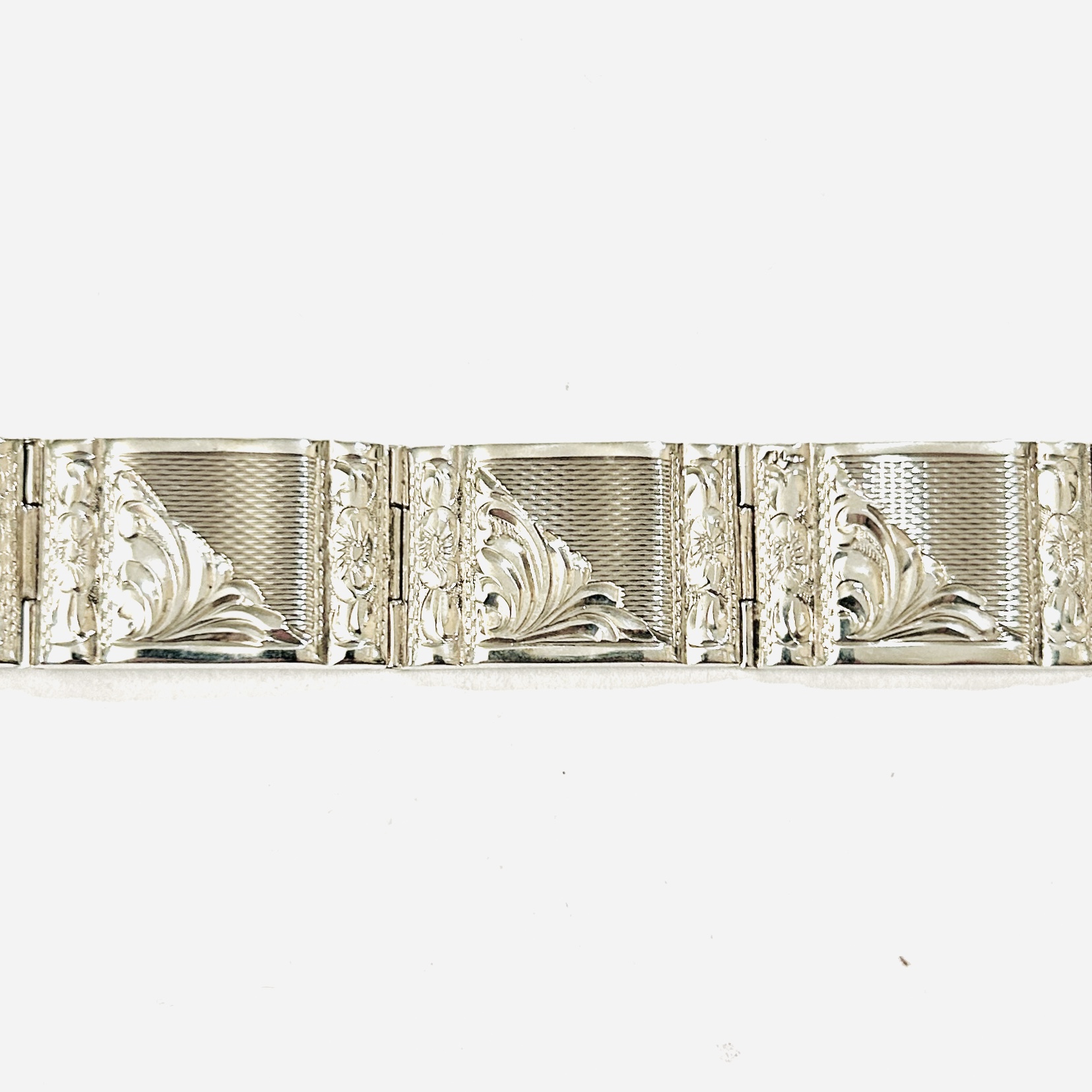 Výrazný, dekorativní náramek z období pozdního art-deco, skládající se z úzce sesazených vlnitě tvarovaných obdélných článků, jež jsou zušlechtěny v geometrickém členění lineárním gilošováním a stylizovaným florálním gravírováním. Kvalitní zlatnická práce košického klenotníka Henrika Amsela ze 40. let 20. století.