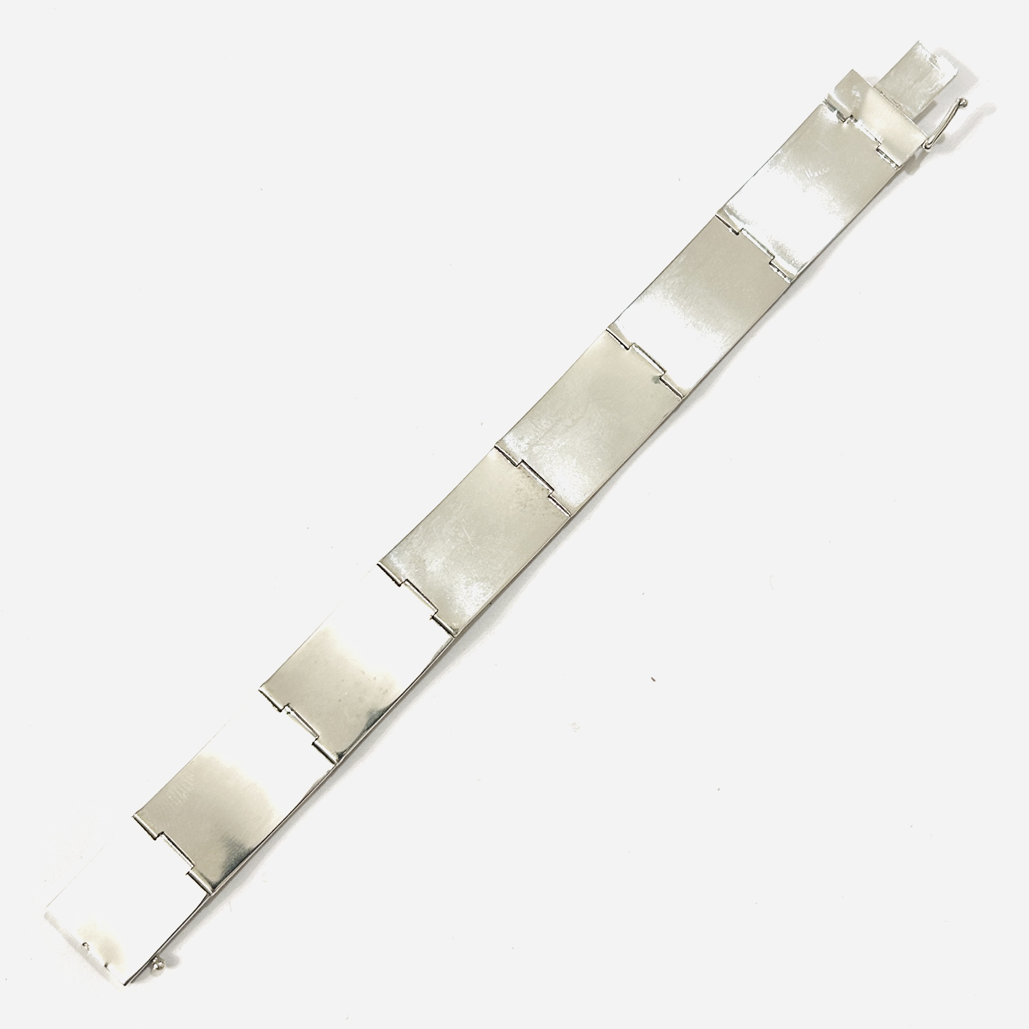 Zhotoveno z nezlaceného stříbra o ryzosti 900/1000; dobově slovenský punc S-62 (kozlík 3), ryzostní číslo a mistrovská značka \“HA\“ na zapínání. Hmotnost 26,46 g, délka 18,6 cm, šířka 17 mm. Jazýčkové zapínání včetně \“8\“ pojistky v pořádku. Ve velmi zachovalém stavu, odborně vyčištěno a vyleštěno zlatníkem.