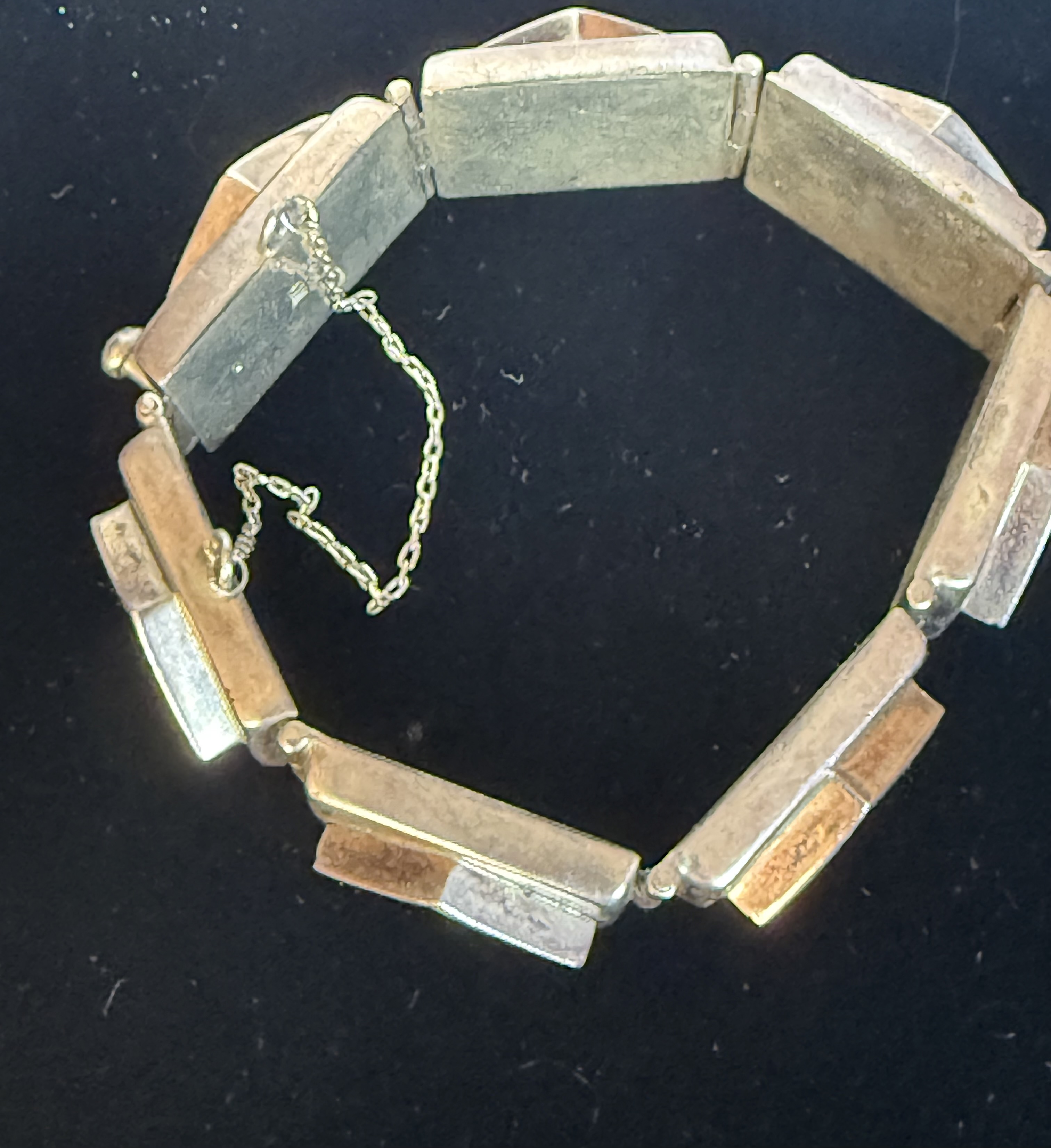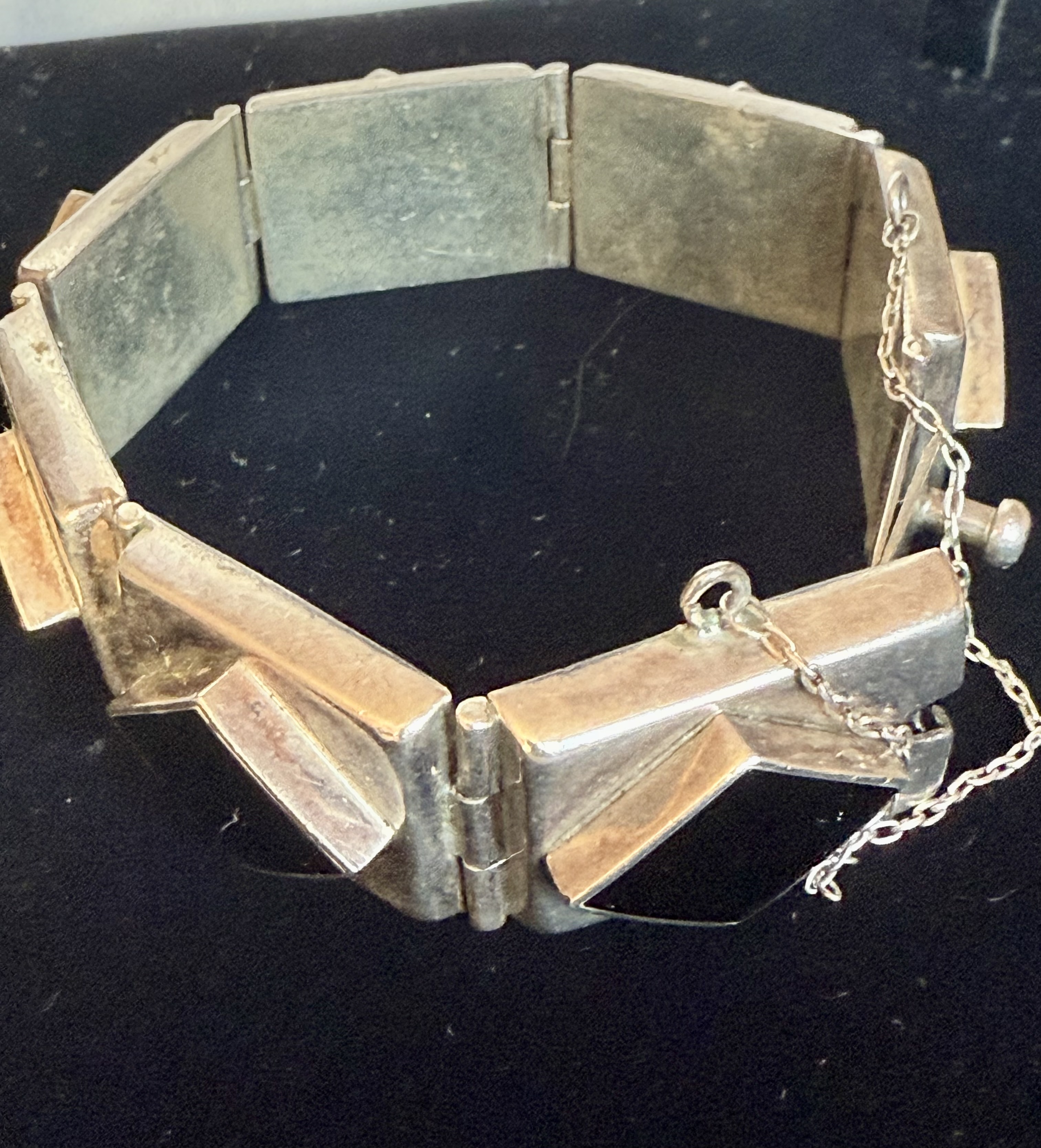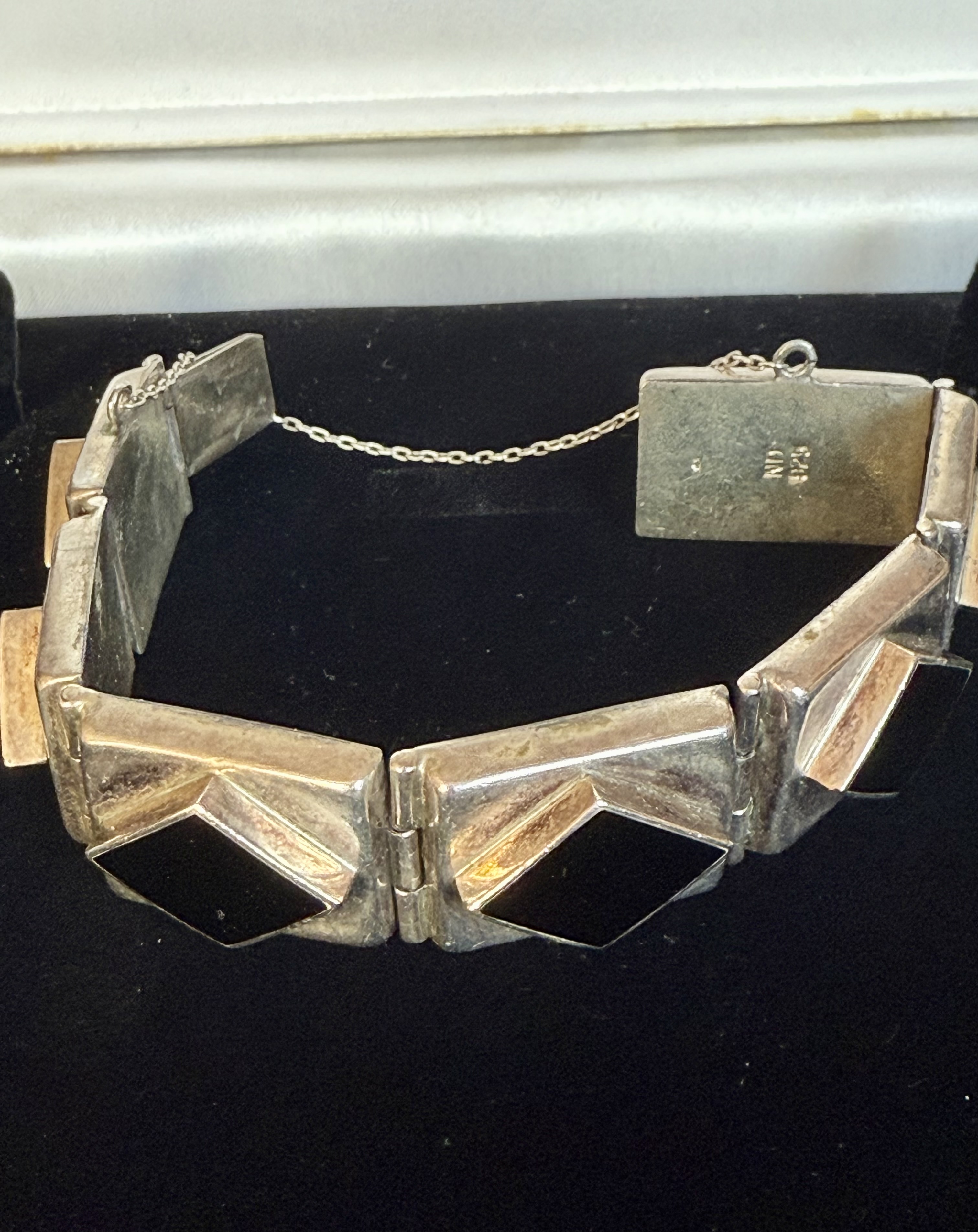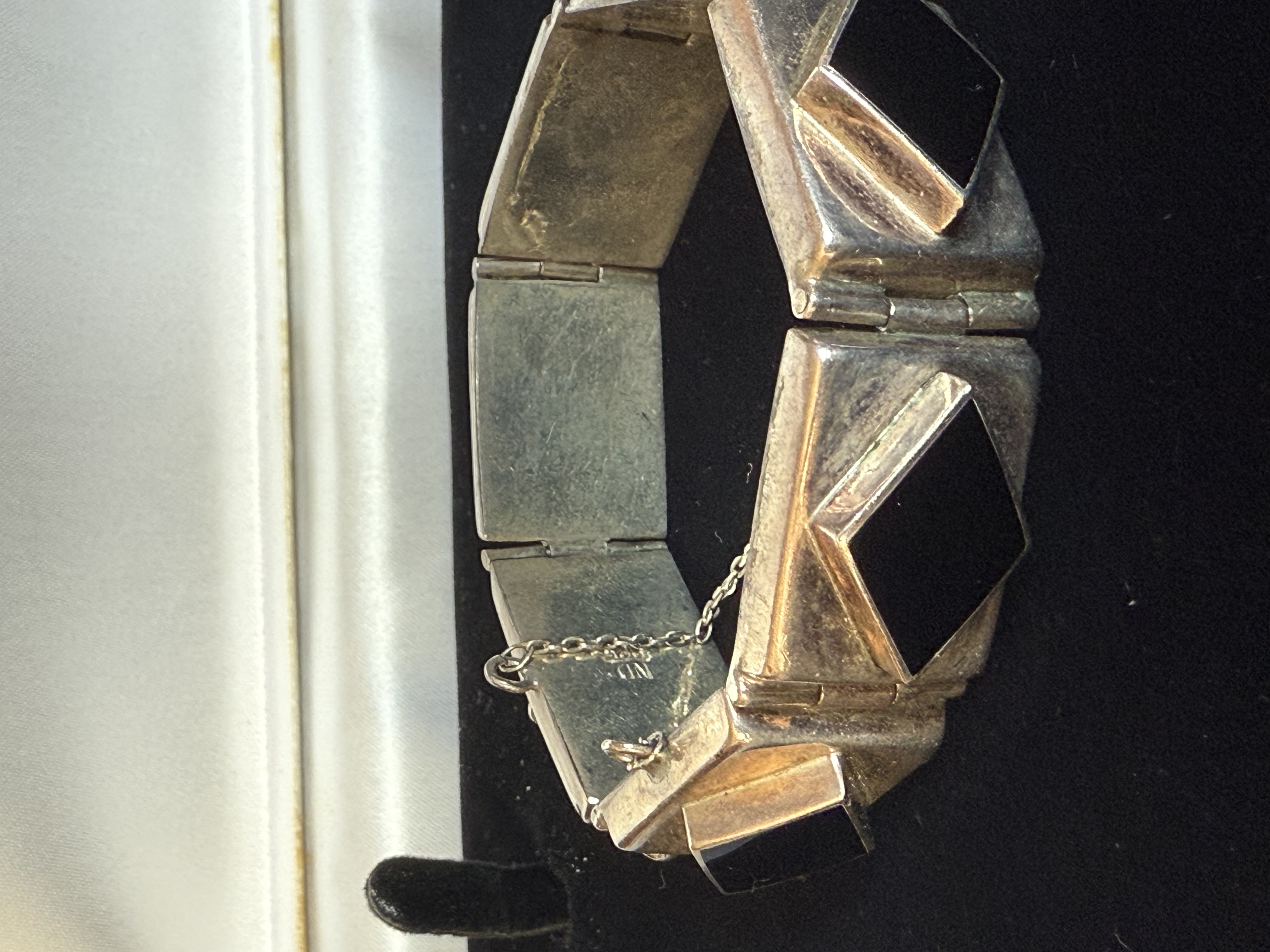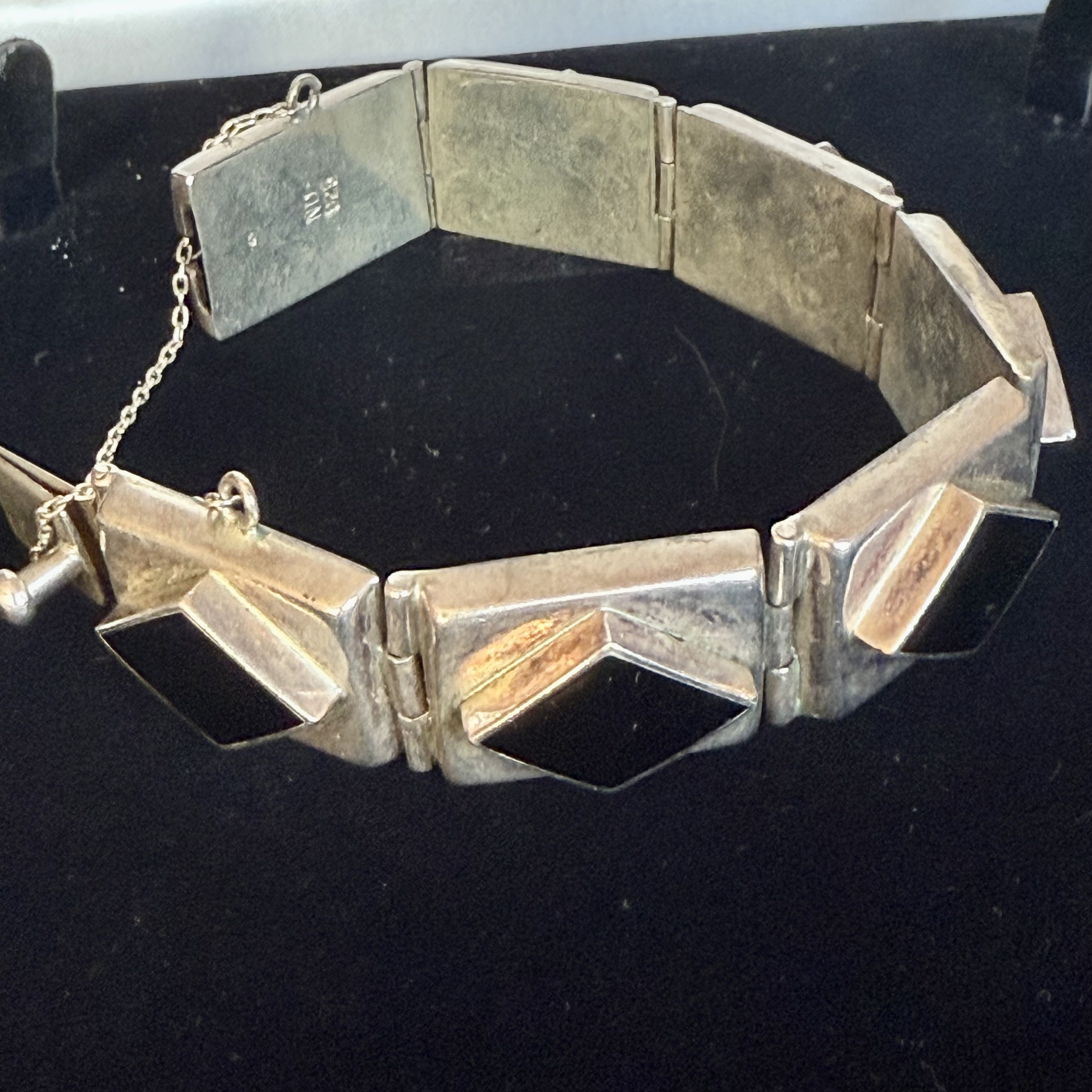 Stříbrný Art DÉCO náramek s onyxy , ryzost 925/1000 , váha 43,5 g, délka 19 cm. Šířka článku 1,5 cm.