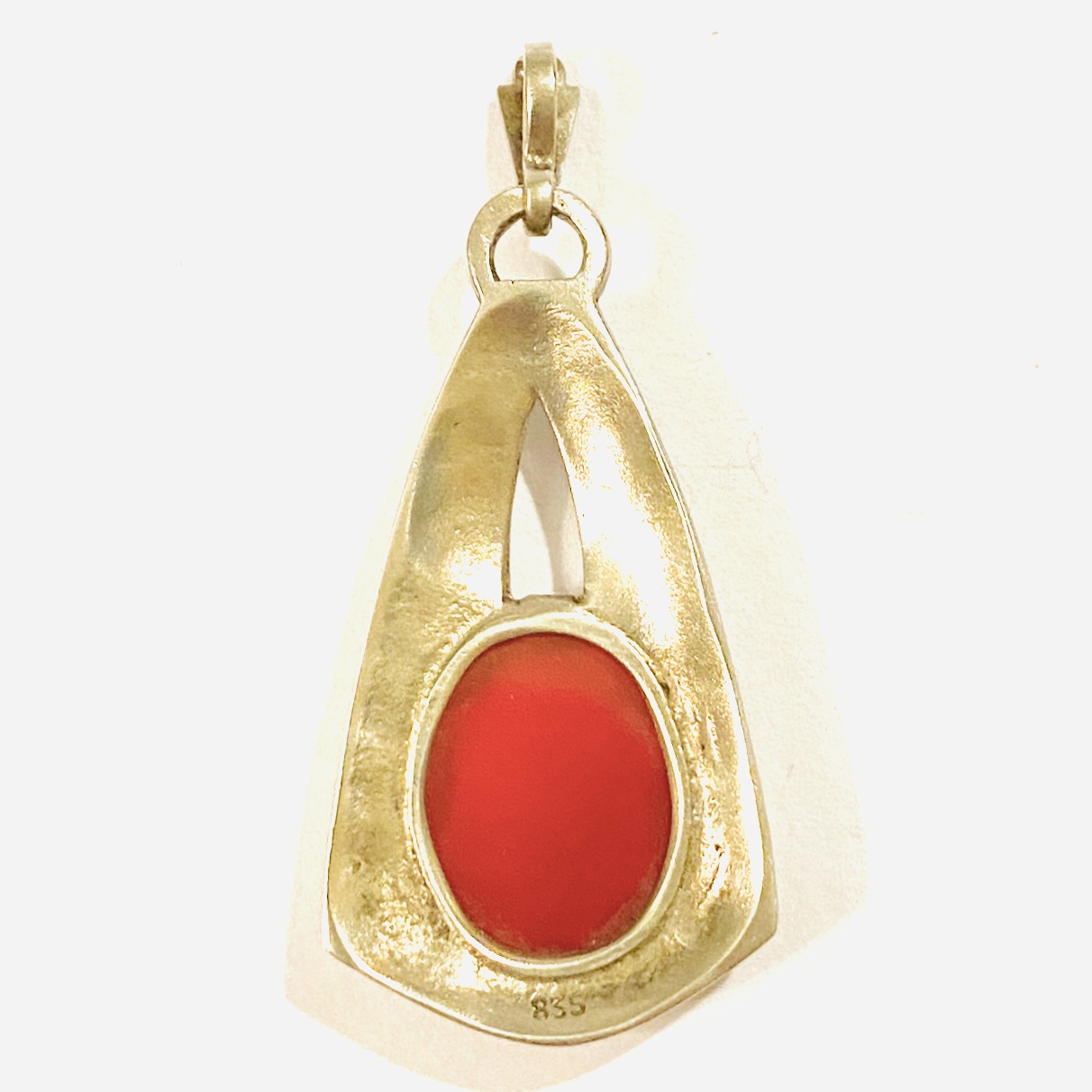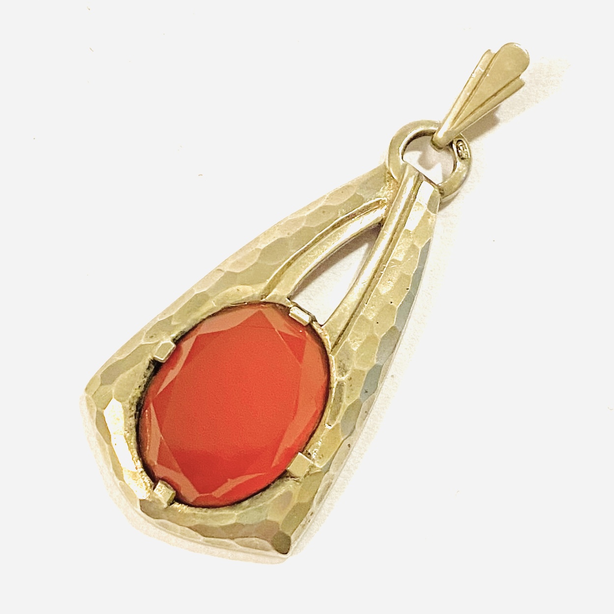 Půvabný, vysoce elegantní stříbrný přívěšek z období raného art-deco, který je osazen přírodním červeným karneolem oválného plochého brusu se zkoseným fasetovaným obvodem. Kámen lehce zapuštěný a perfektně fasován čtyřmi krapnami. Tělo závěsu ve spodní polovině tvoří rozšiřující se hmota, v horní polovině se dynamicky sbíhají dvě ramena, kde se jedno provléká závěsným očkem a překrývá druhé z ramen, velmi nenápadný avšak promyšlený efekt. Ramena jsou při vnitřních krajích lemována rytými liniemi, mezi nimiž se vytváří vzdušný průhled. Celé tělo je poté zušlechtěno technikou „kladívkování“, jež se však typicky užívá pro stolní stříbro a její aplikace na šperky je velmi netradiční, dodává mu však organičtější ráz. Provlékací očko pro řetízek v tradičním art-deco názvosloví s ozdobnými rytými liniemi. Velmi vkusný s decentní šperk z raných 20. let 20. století, který zaujme svým detailním a nezvyklým zpracováním. Velmi kvalitní autorská a zlatnická práce s německou, patrně pforzheimskou, proveniencí. Sběratelsky zajímavý kousek.
