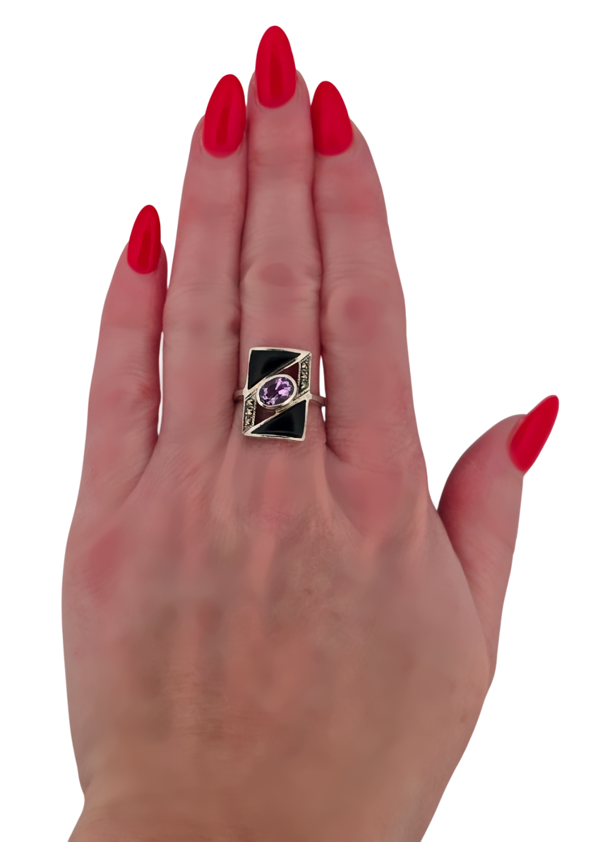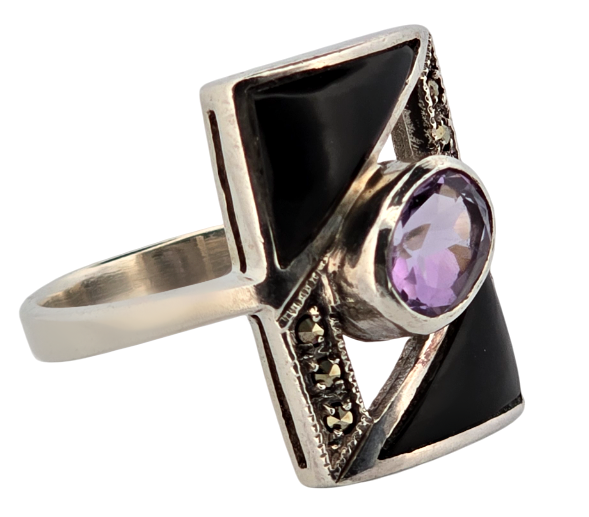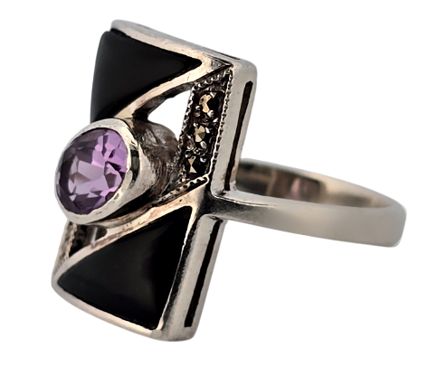 Popis: Starožitný stříbrný prsten s ametystem, vykládaný markazity a zdobený černým emailem. Designový šperk.