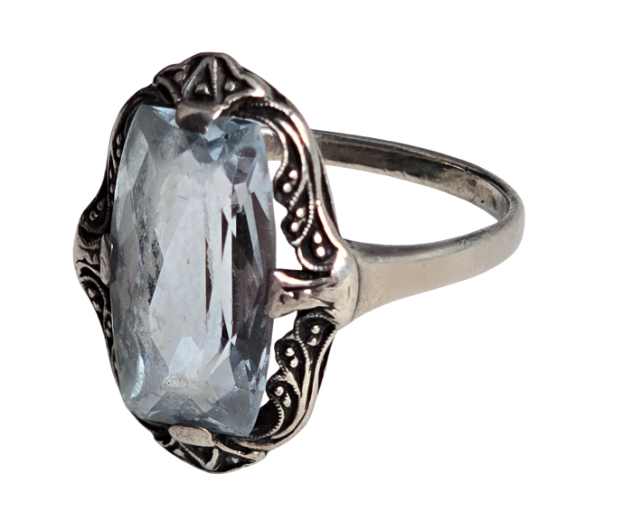 Popis: Stříbrný art deco prsten se synt. spinelem modré barvy se zdobným lemem kolem vsazeného kamene.