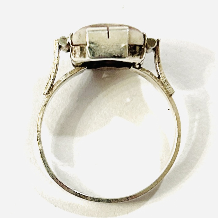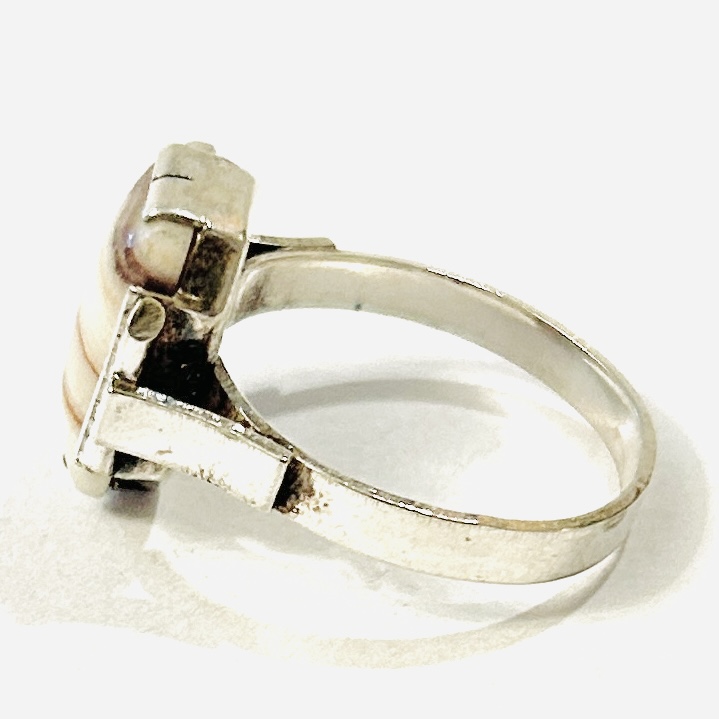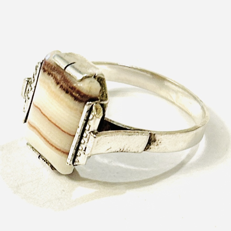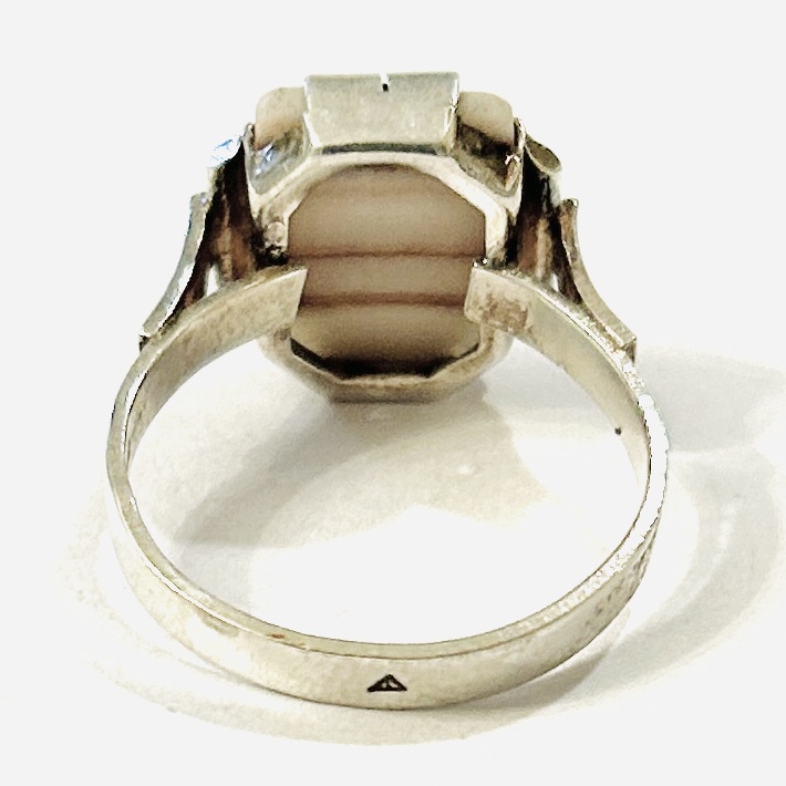 Elegantní prsten z období art-deco osazený přírodním karlovarským vřídlovcem obdélného plochého zaobleného brusu, lišty hlavice jemně ryty. Kvalitní zlatnická práce turnovského klenotníka Josefa Hokeho z 30. let 20. století.
