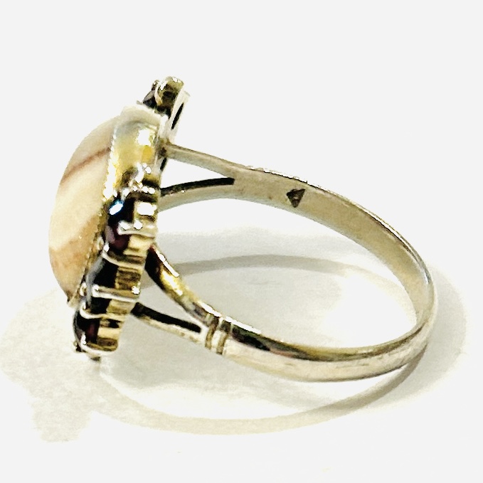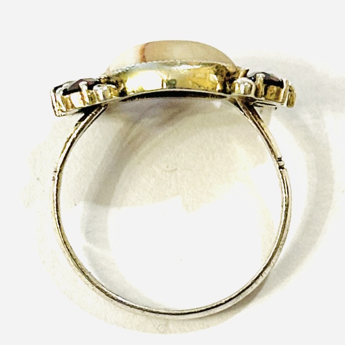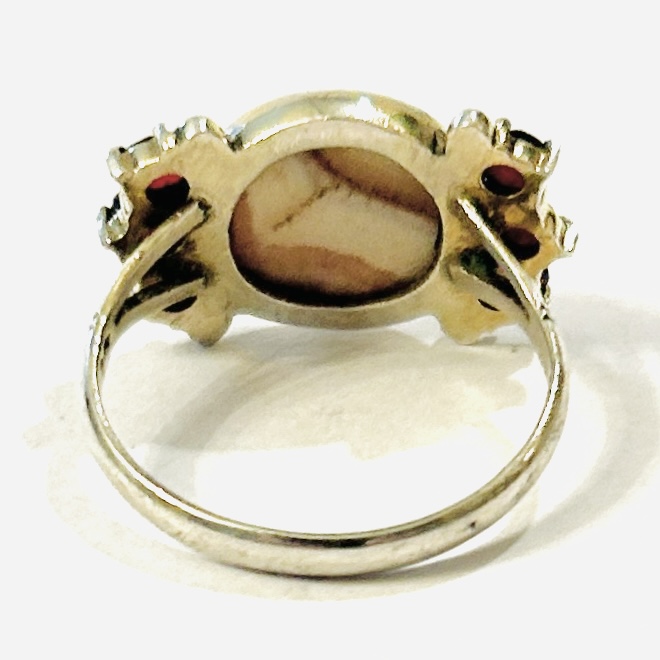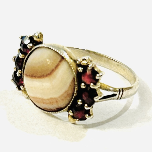 Elegantní prsten z období art-deco, hlavici dominuje kulatá mugle přírodního vřídlovce, po stranách doplněno českými granáty kulatého šachovnicového brusu a granulovanými kuličkami, fasováno zrnitou obrubou a zrnkovou technikou. Moderní design v kombinaci dvou typických českých minerálů, tuzemská granátnická práce z 30. let 20. století.