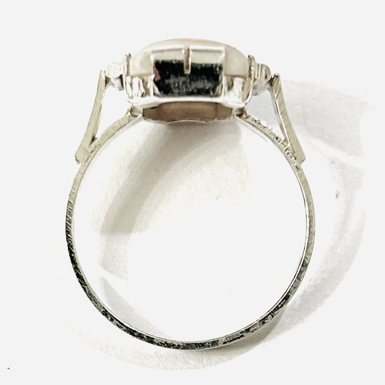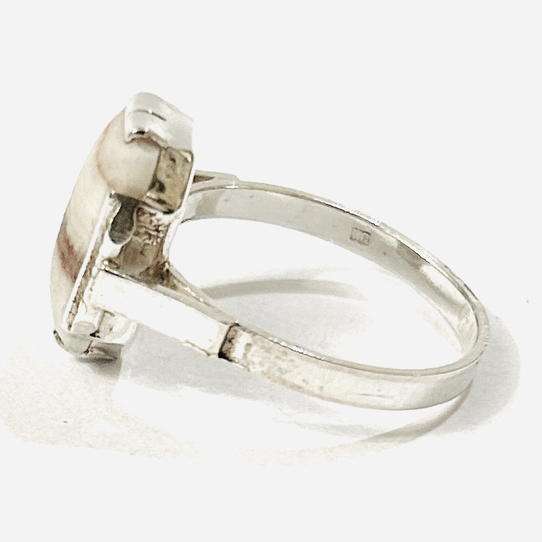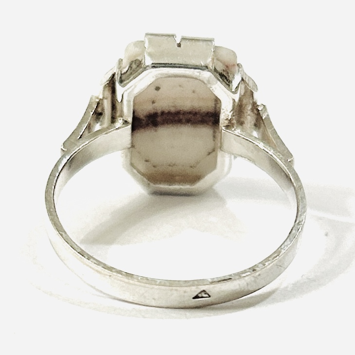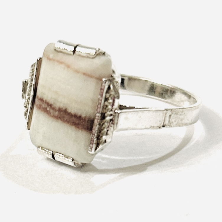 Elegantní prsten z období art-deco osazený přírodním karlovarským vřídlovcem obdélného plochého zaobleného brusu, lišty hlavice jemně ryty. Kvalitní zlatnická práce turnovského klenotníka Josefa Hokeho z 30. let 20. století.