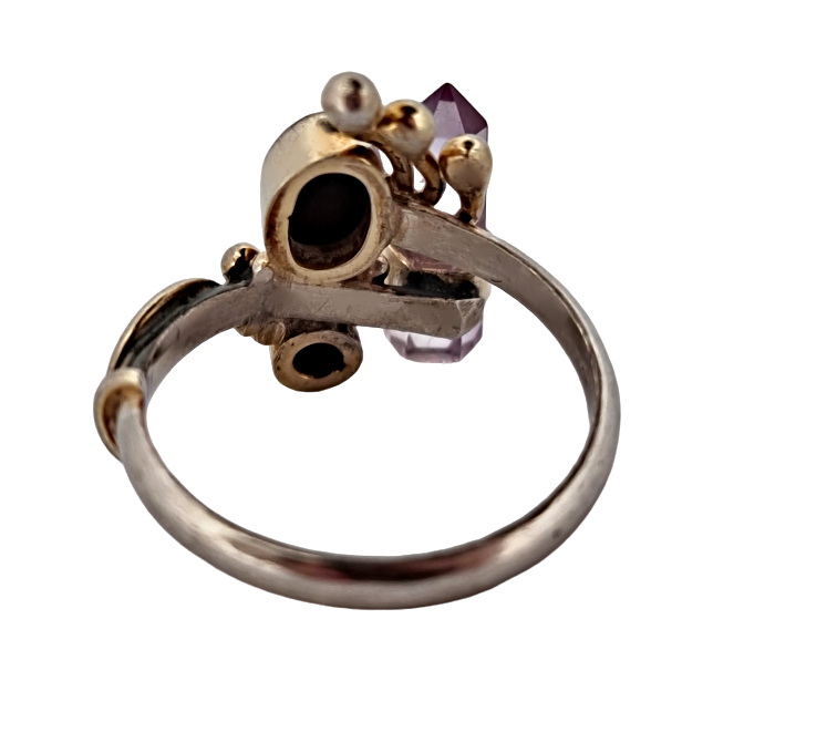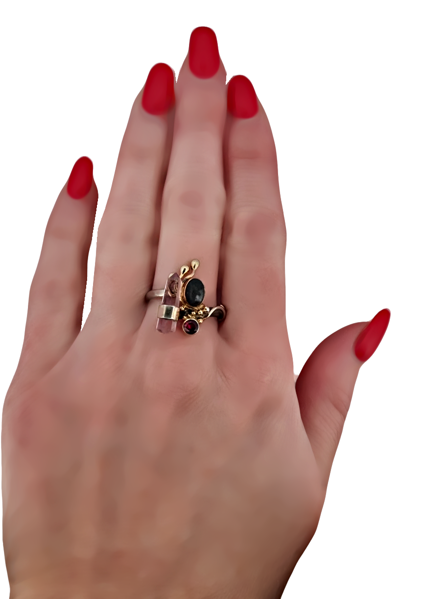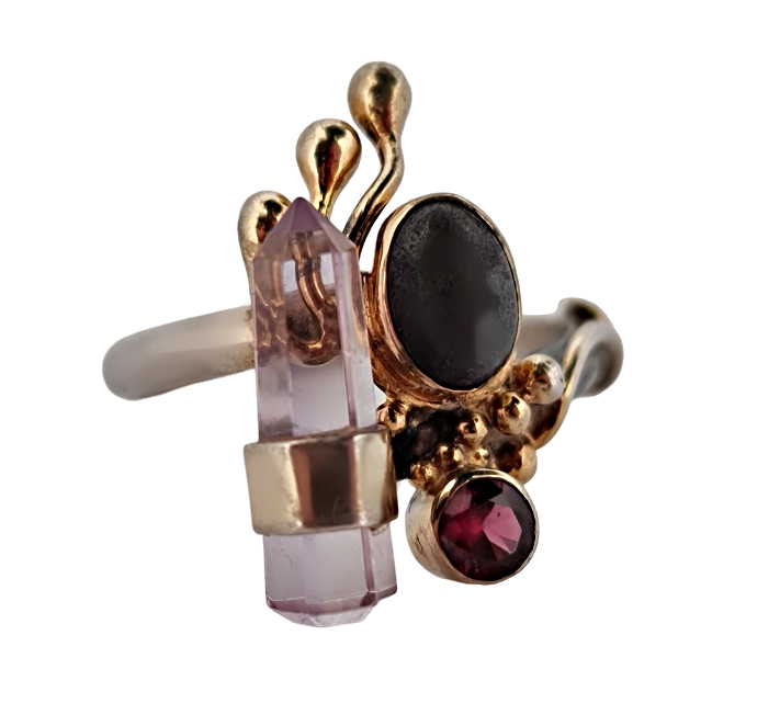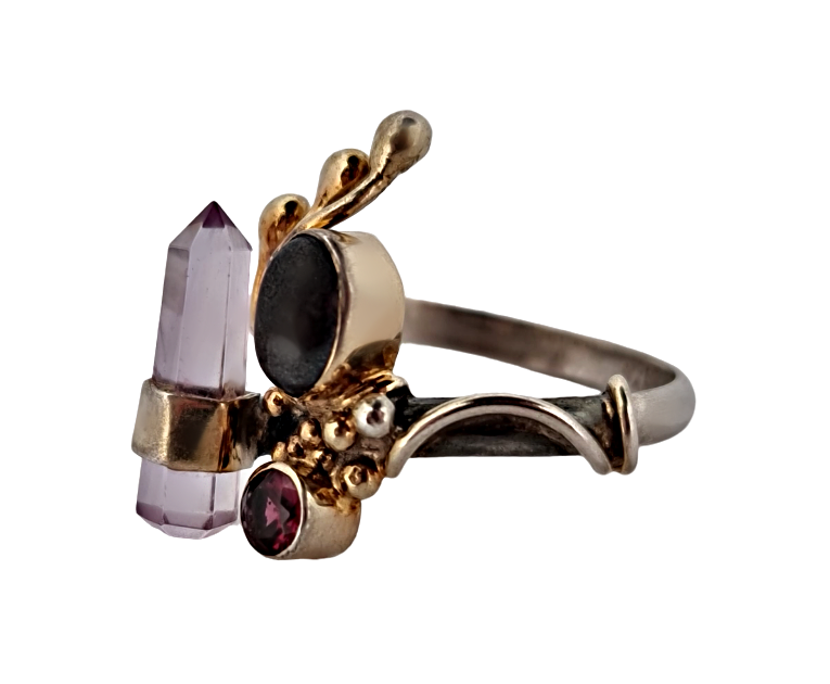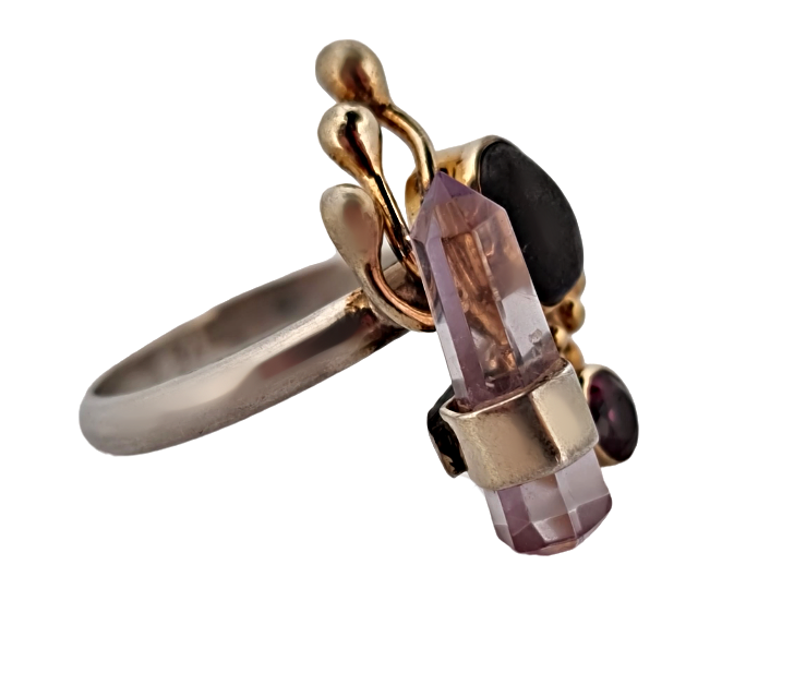 Popis: Unikátní prsten s drahými kameny – přírodní krystal ametystu, turmalín a magnetit. Přední strana prstenu pozlacena.