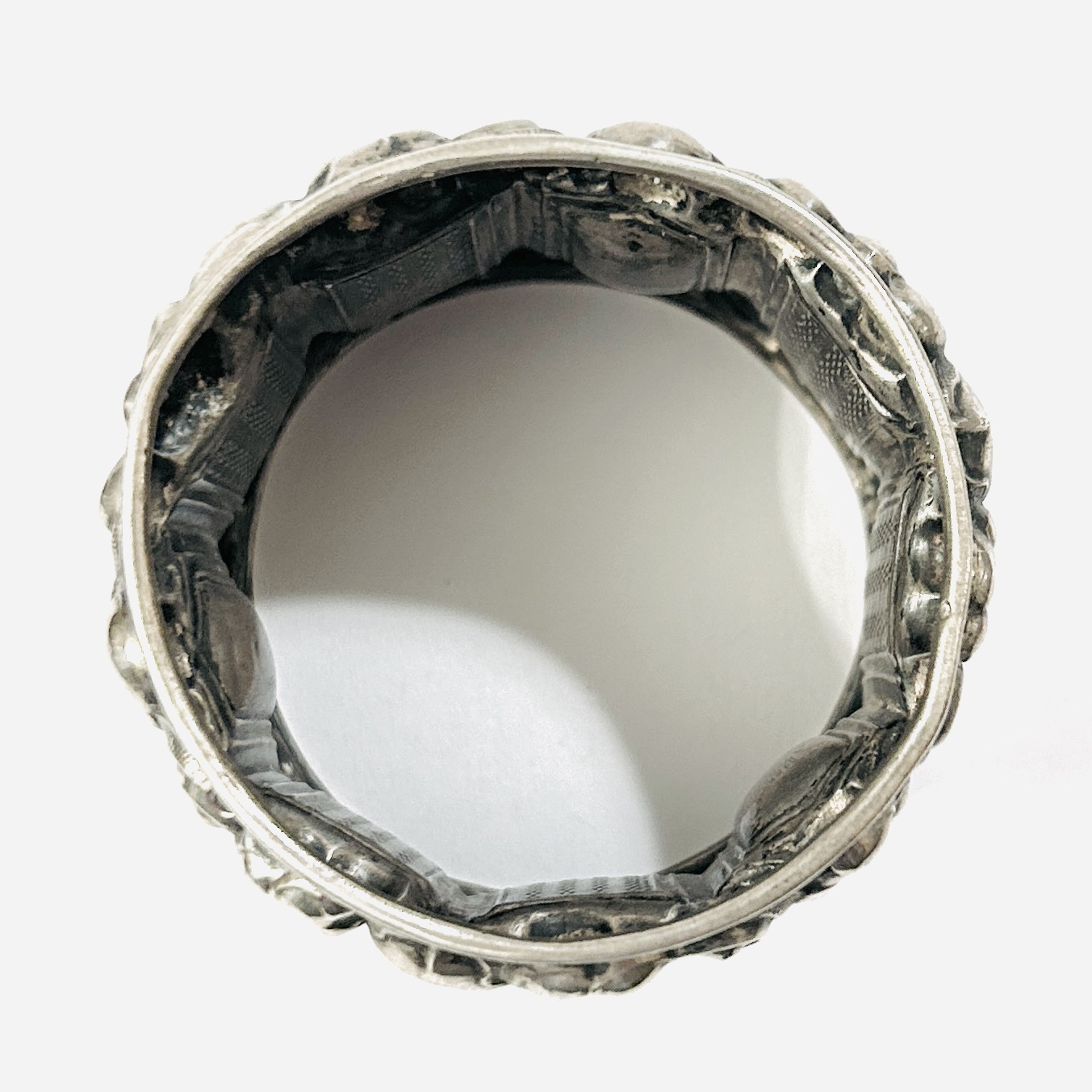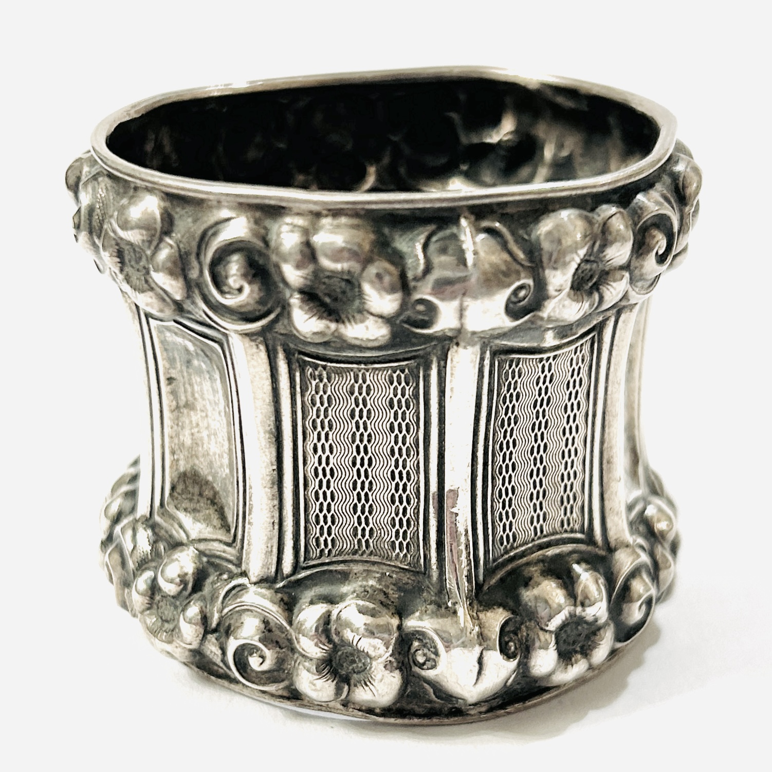 Velký, dekorativní kroužek na ubrousky z období biedermeieru, bohatě plasticky tvarováno, obdélné kartuše zdobeny pásovým gilošováním, prázdné ponechány pro případný monogram, objemný stylizovaný florální ornament při okrajích. Kvalitní západoevropská stříbrnická práce ze 3. pětiny 19. století.