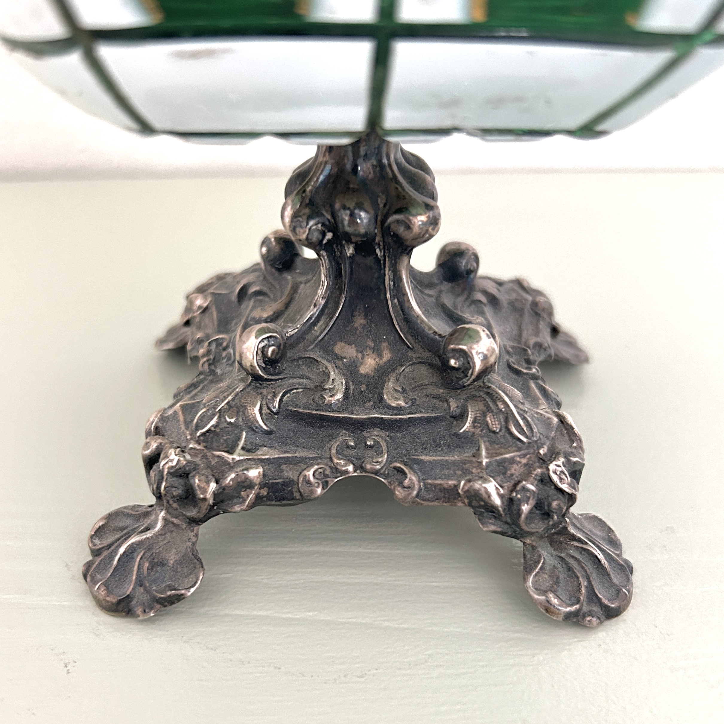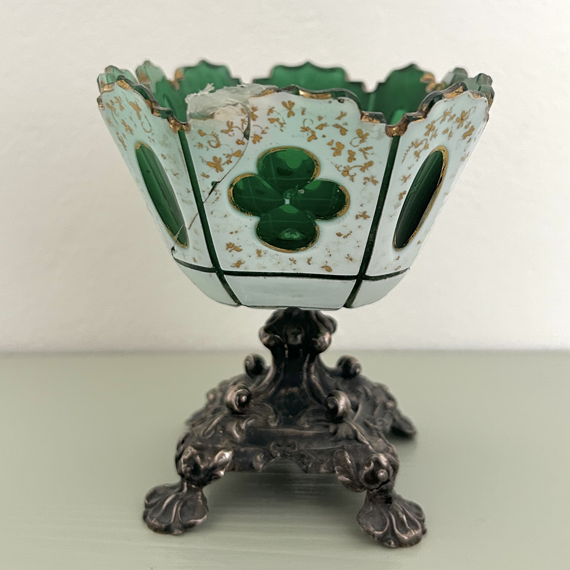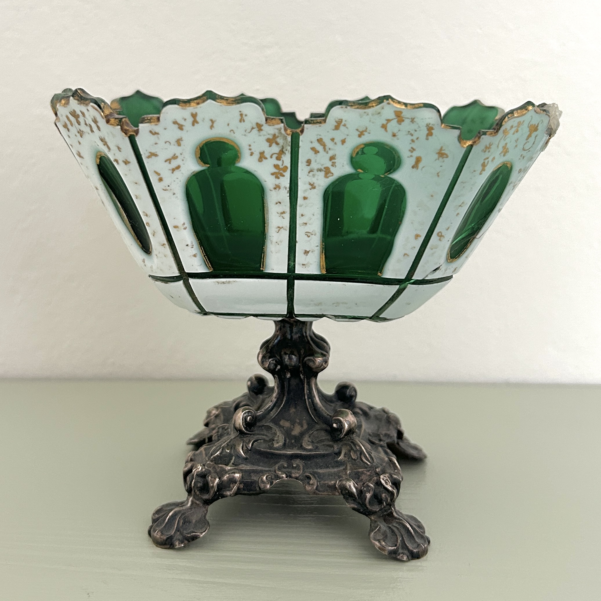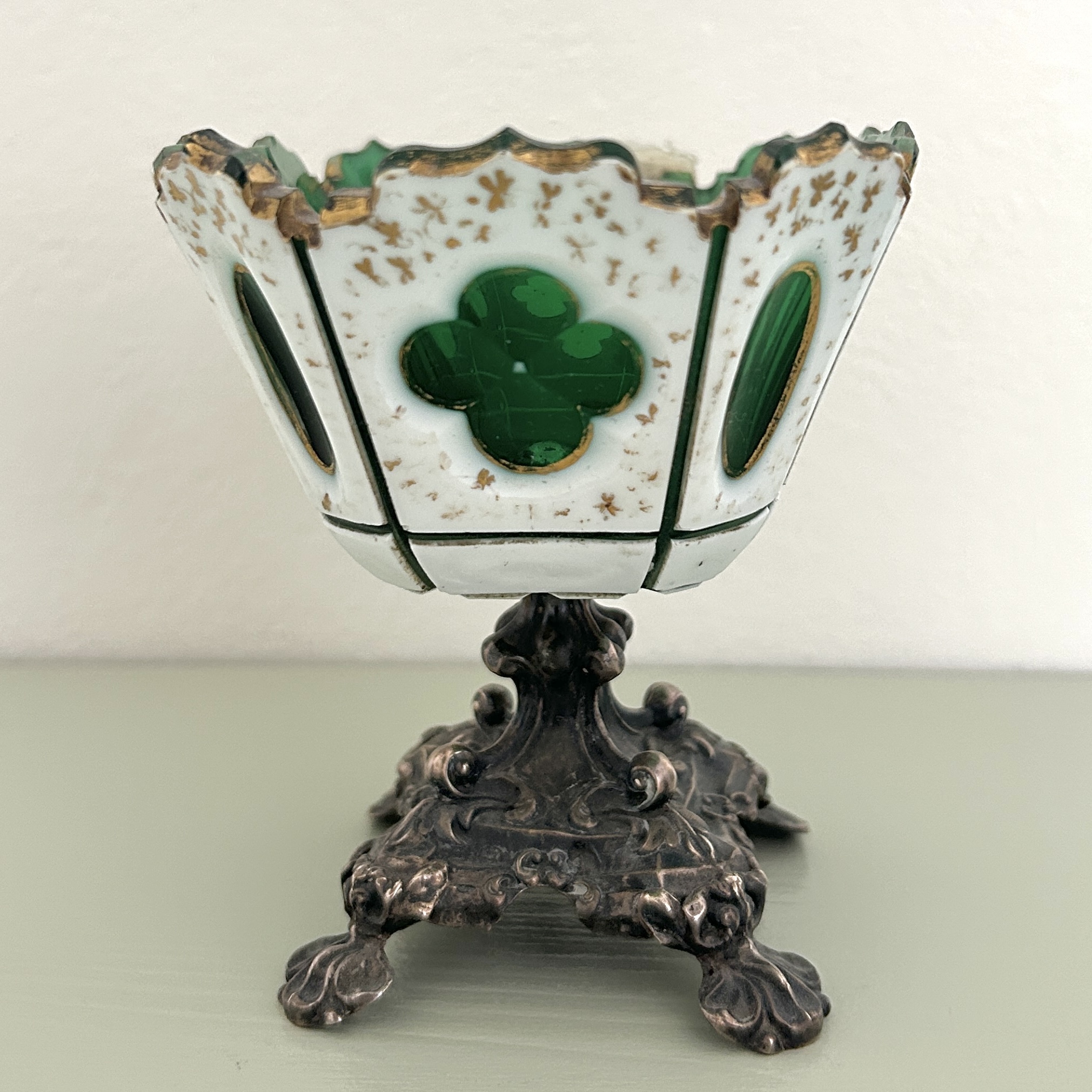 Dekorativní nástolec z období biedermeiru, na bohatě plastické noze v novorokokovém stylu je usazena kónická miska z přejímaného bílo-zeleného skla. Její kraj je zdobně probrušován, stejně jako různě tvarované čočky, zdobeno ručně malovanými zlatými florálními motivy a linkami. Kvalitní středoevropská stříbrnická a sklářská práce z 50. let 19. století.