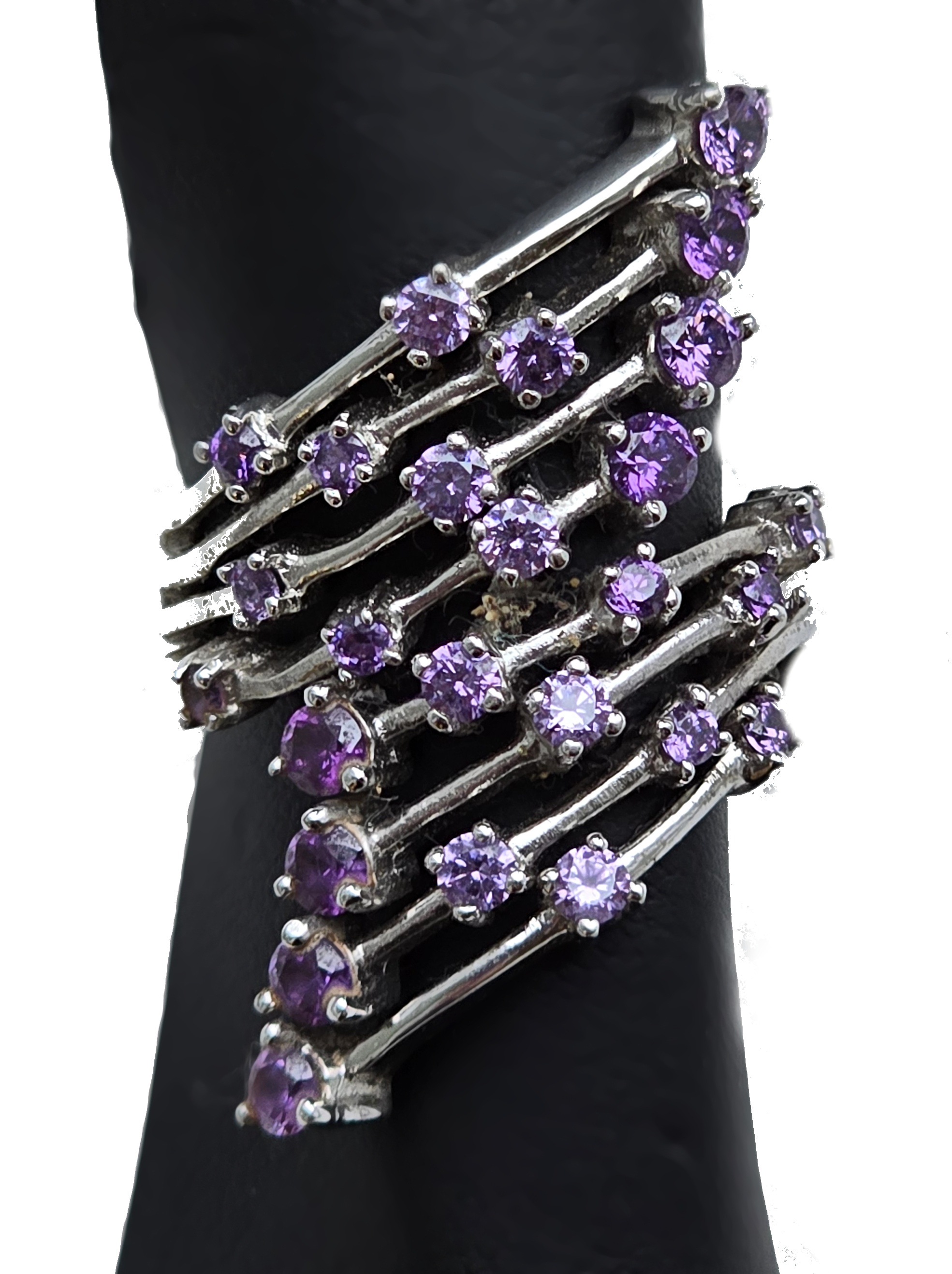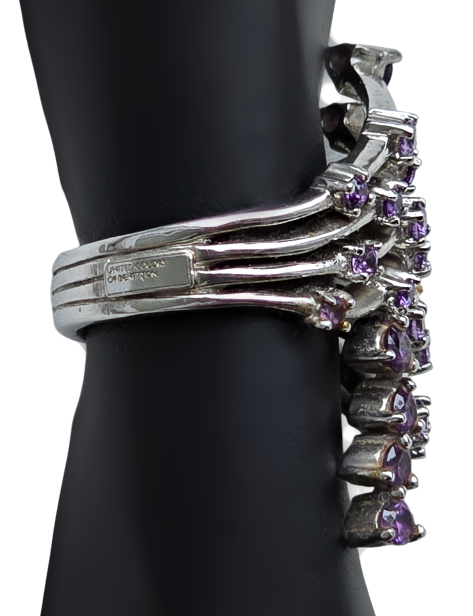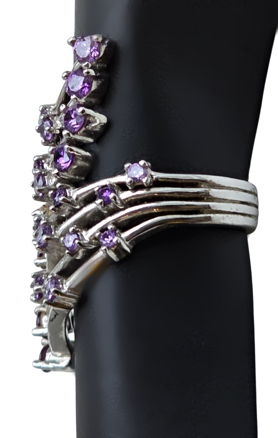 Popis: Stříbrný prsten extravagantního netypického tvaru italské značky United Colours of Benetton. Vykládaný broušenými ametysty. Obroučka je ze čtyř pevně spojených kroužků. Ze strany stříbrný štítek s vyraženým názvem značky. Výjimečný šperk.