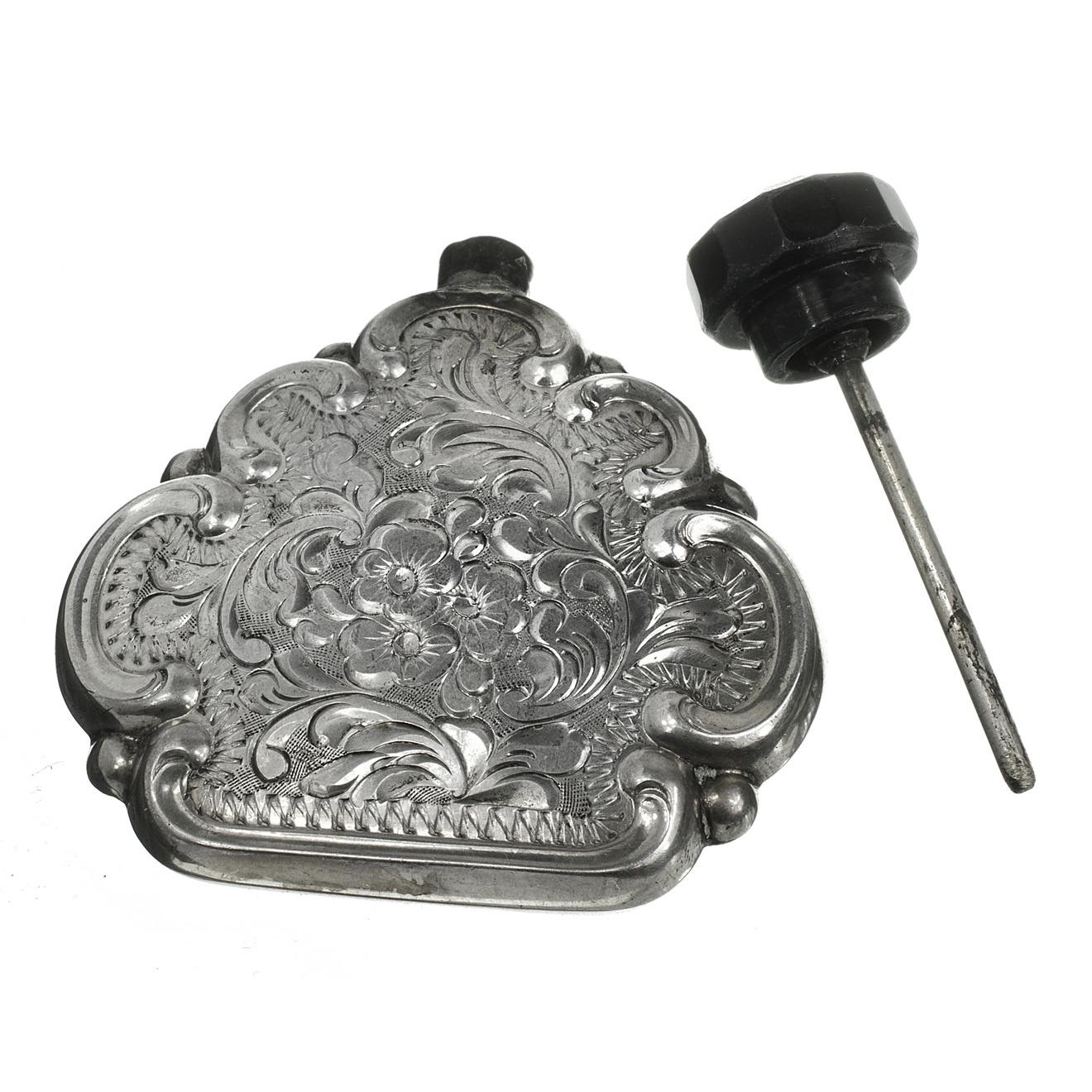 Stříbrný flakon na parfém zdobený gravírováním s plastovým černým uzávěrem a se zachovanou aplikační tyčinkou.