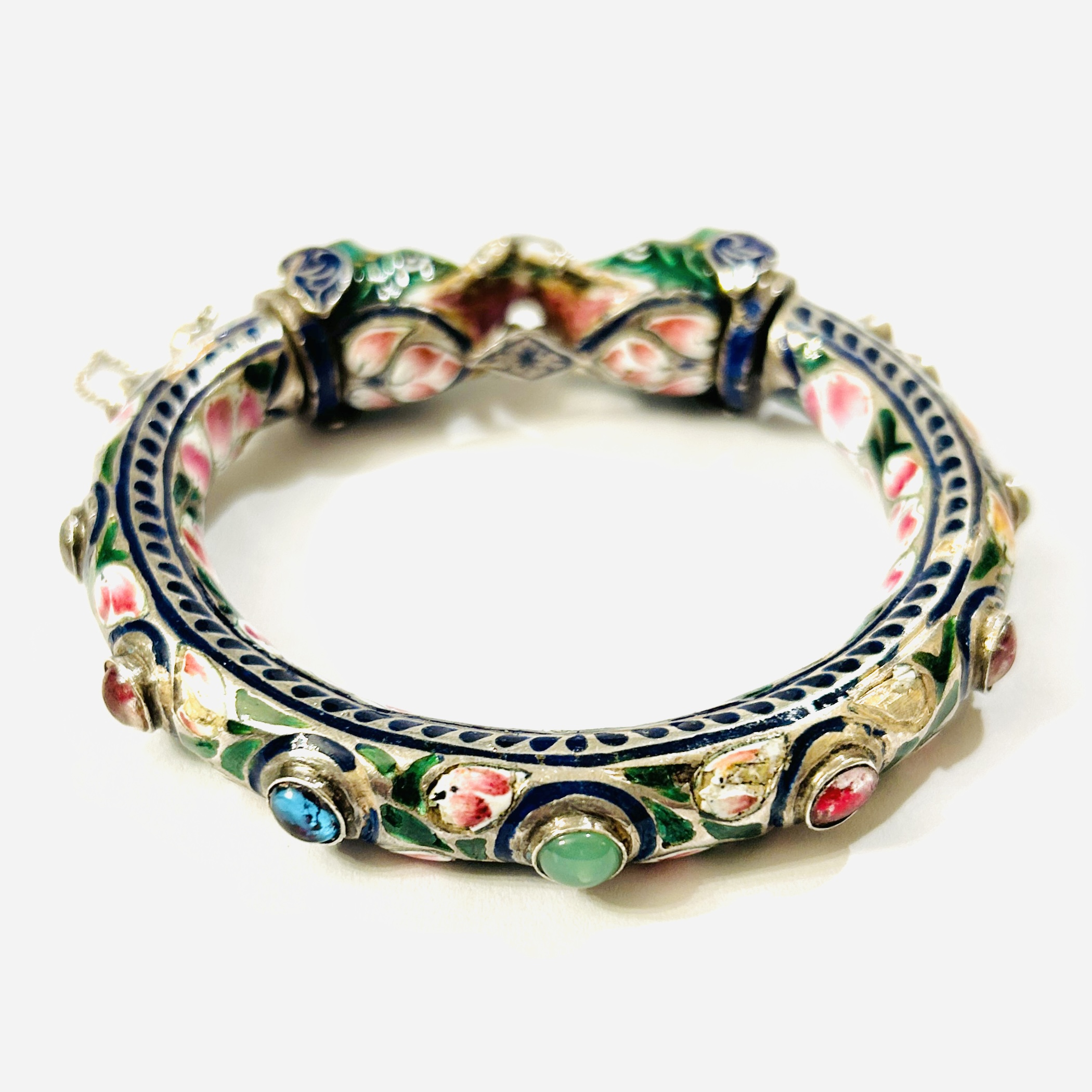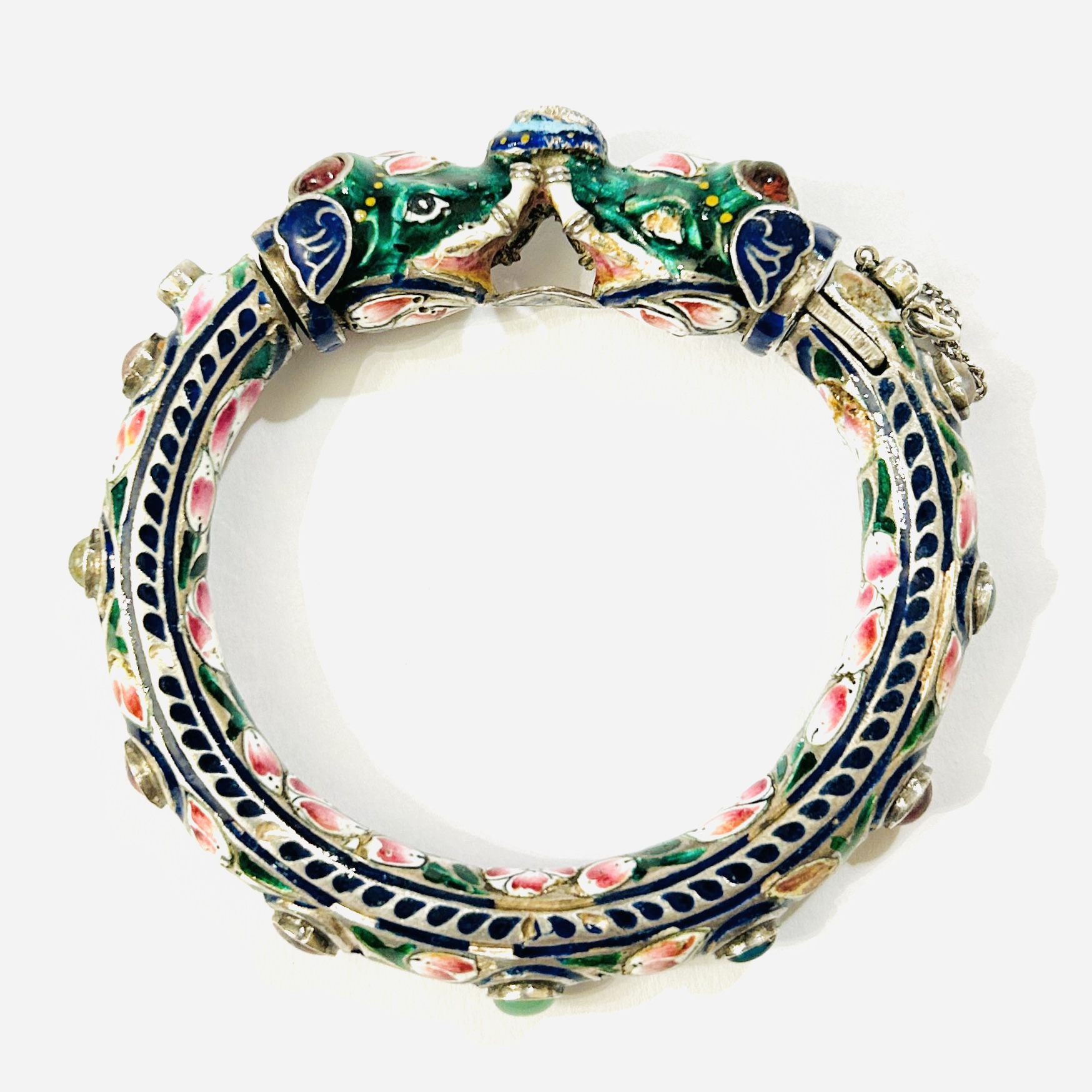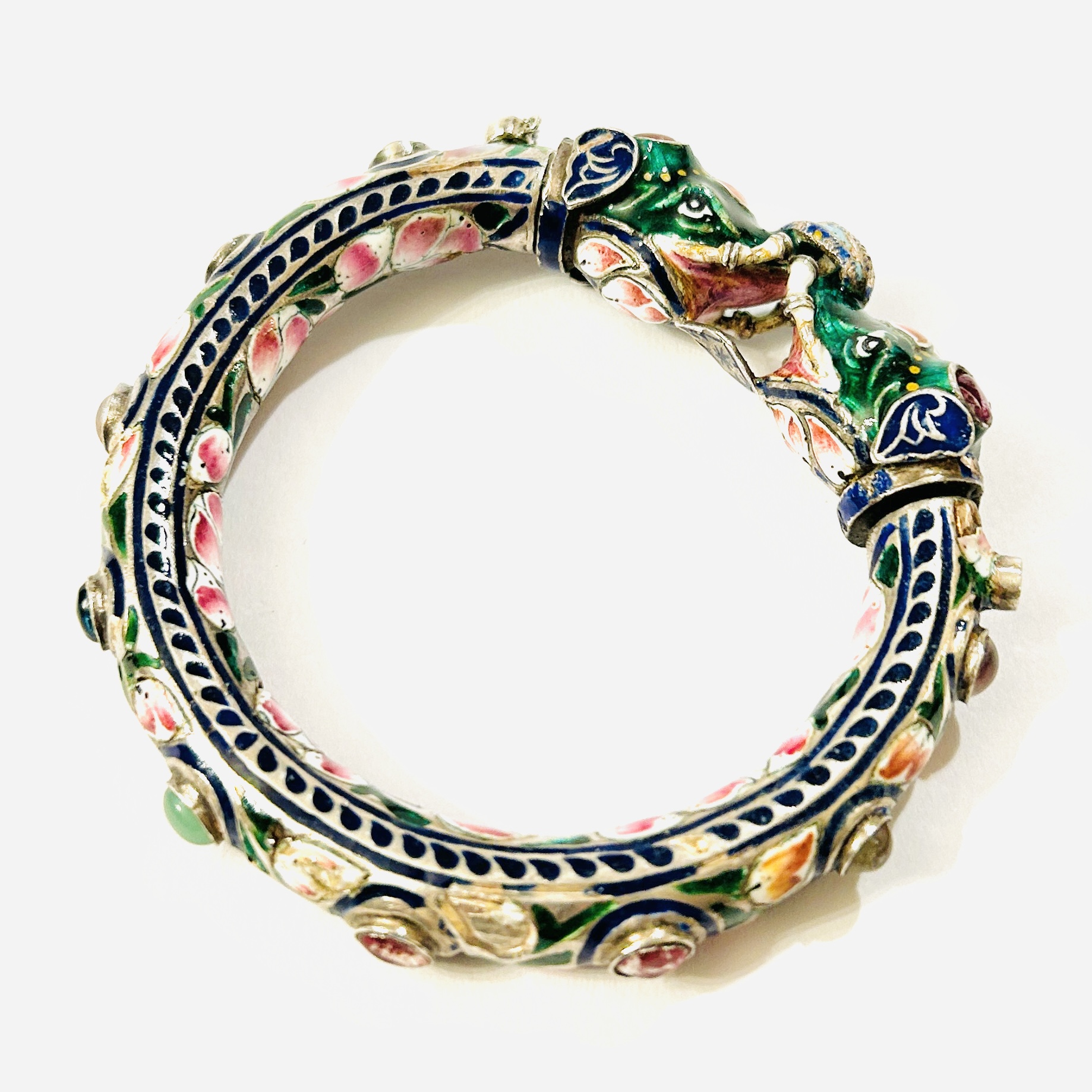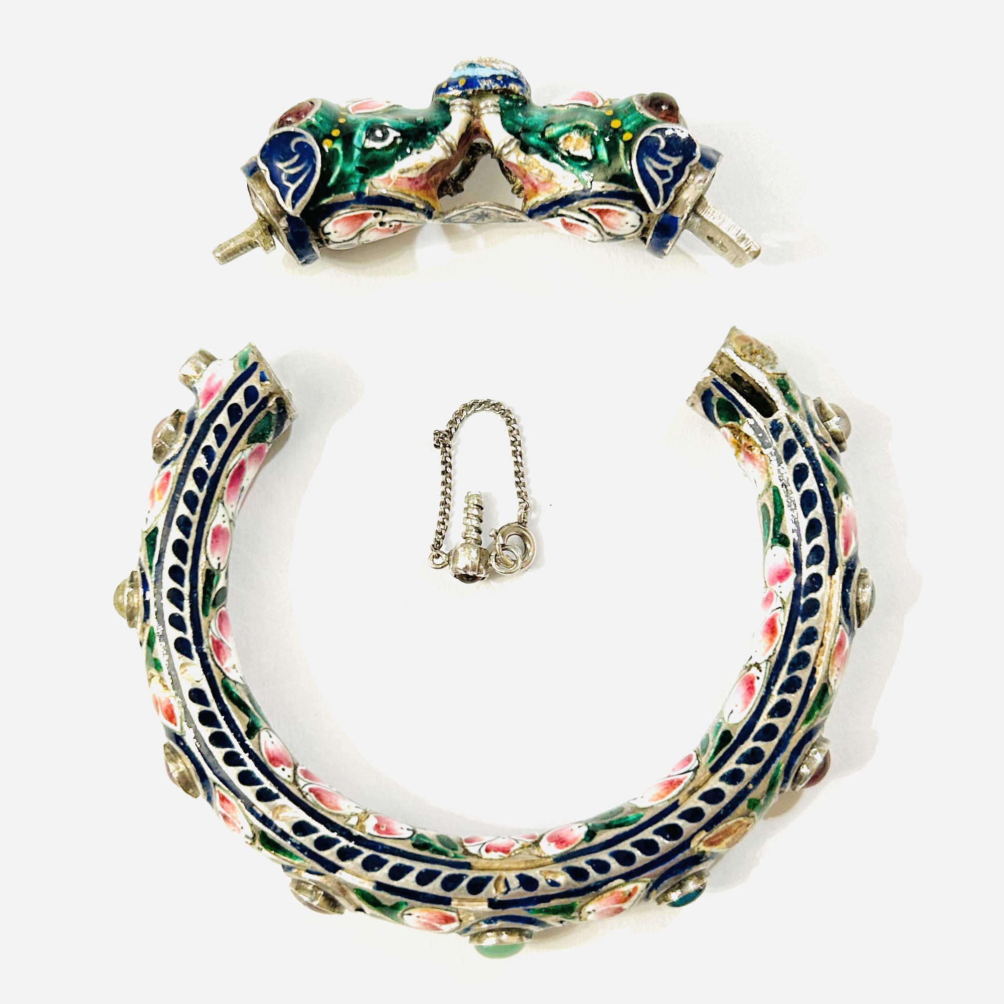 Nepřehlédnutelný, extravagantní masivní náramek ve tvaru kruhu s odnímatelnou zapínací korunou v podobě dvou sloních hlav. Po vnějším obvodu osazeno 13 kulatými muglemi z barevného skla podloženého fólií (z toho 9 kamenů po obvodu symbolizuje 9 planet (Navagrahas), jež jsou spjaty s hinduistickou ikonografií), bohatě zdobeno pestrobarevným smaltem s motivem růžových květů se zelenými lístky a modrým ornamentem, jež kontrastuje se samotným kovem. Mistrovská indická zlatnická práce z počátku 2. poloviny 20. století.