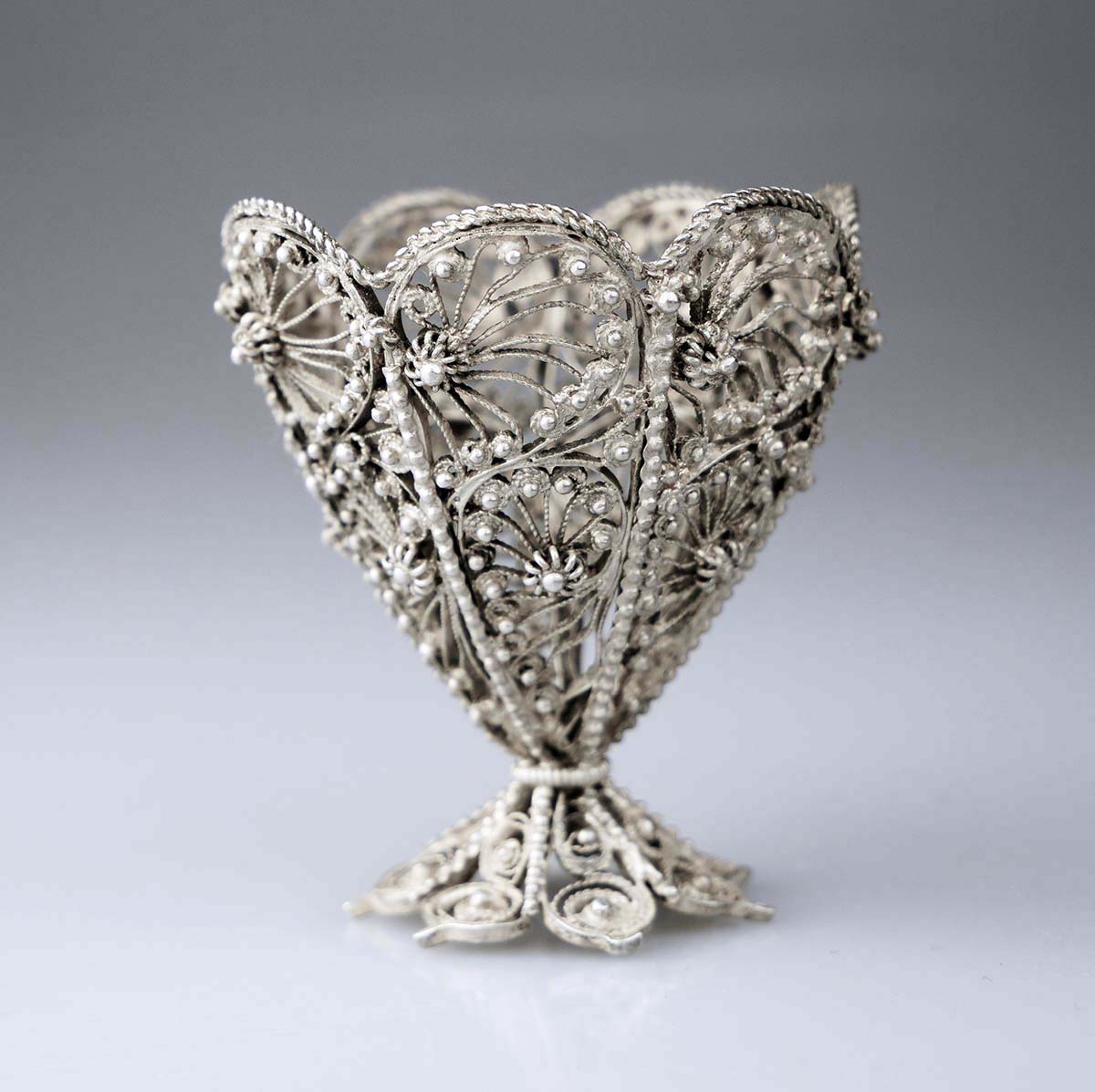 stříbrný košíček ručně tažený z drátu s mistrovskými filigrány, granulací, radiální květinové rozety, typická práce ze slavného období balkánských stříbrníků se silným osmanským vlivem, konec 19. století, Ag 30,39 g/925/1000, osvědčení Puncovního úřadu, průměr 4,5 cm, výška 5,2 cm