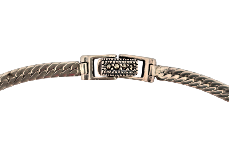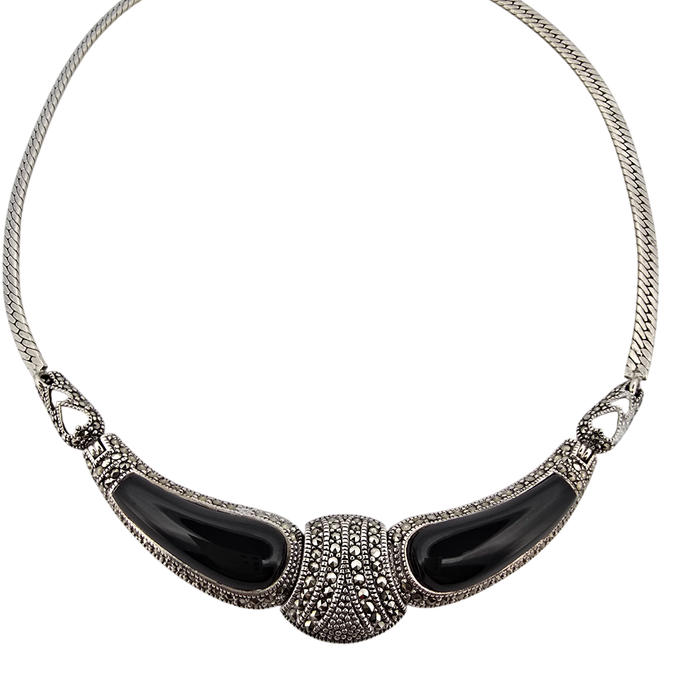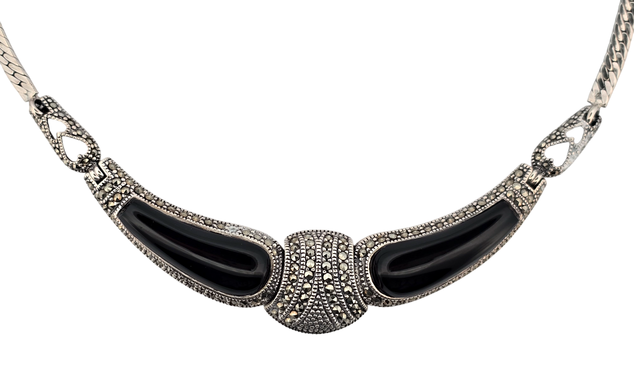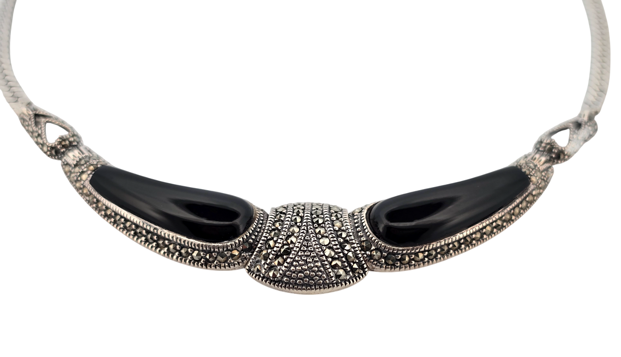 Popis: Starožitný stříbrný náhrdelník Art Deco. Zdobený dvěma masivními přírodními onyxy a jemnými markazity. Zapínání je také zdobeno markazity. Nadčasový design, luxusní šperk.