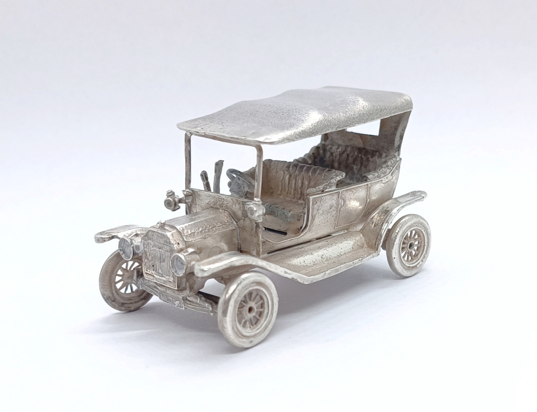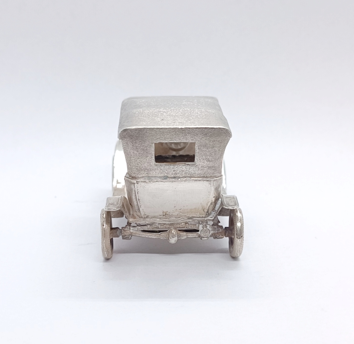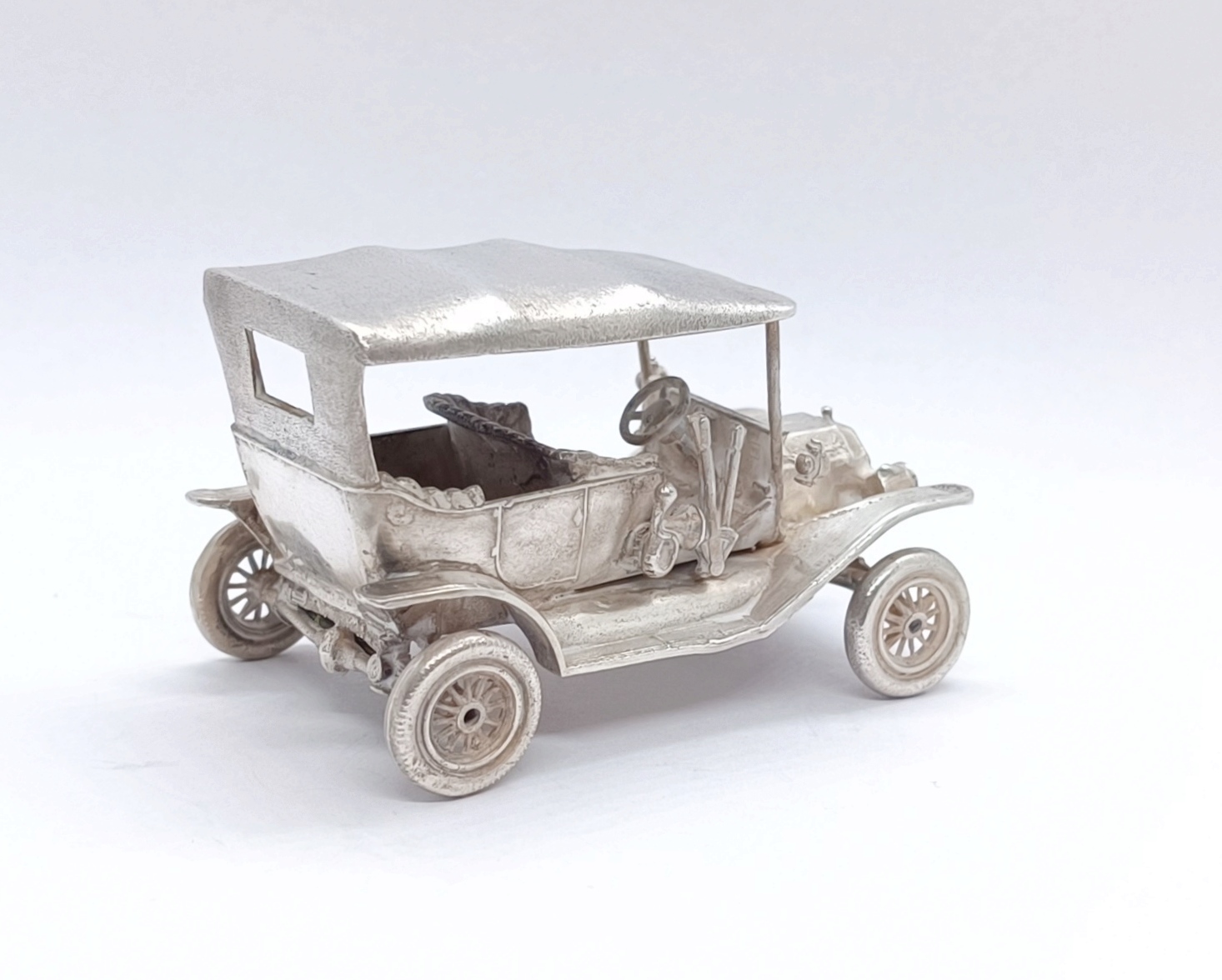 Stříbrný model auta, na spodní straně značeno 1911 Ford model T, Ag btto 128,78g/800/1000, 2. polovina 20. století; délka 7 cm, šířka 4,2 cm, výška 4,5 cm