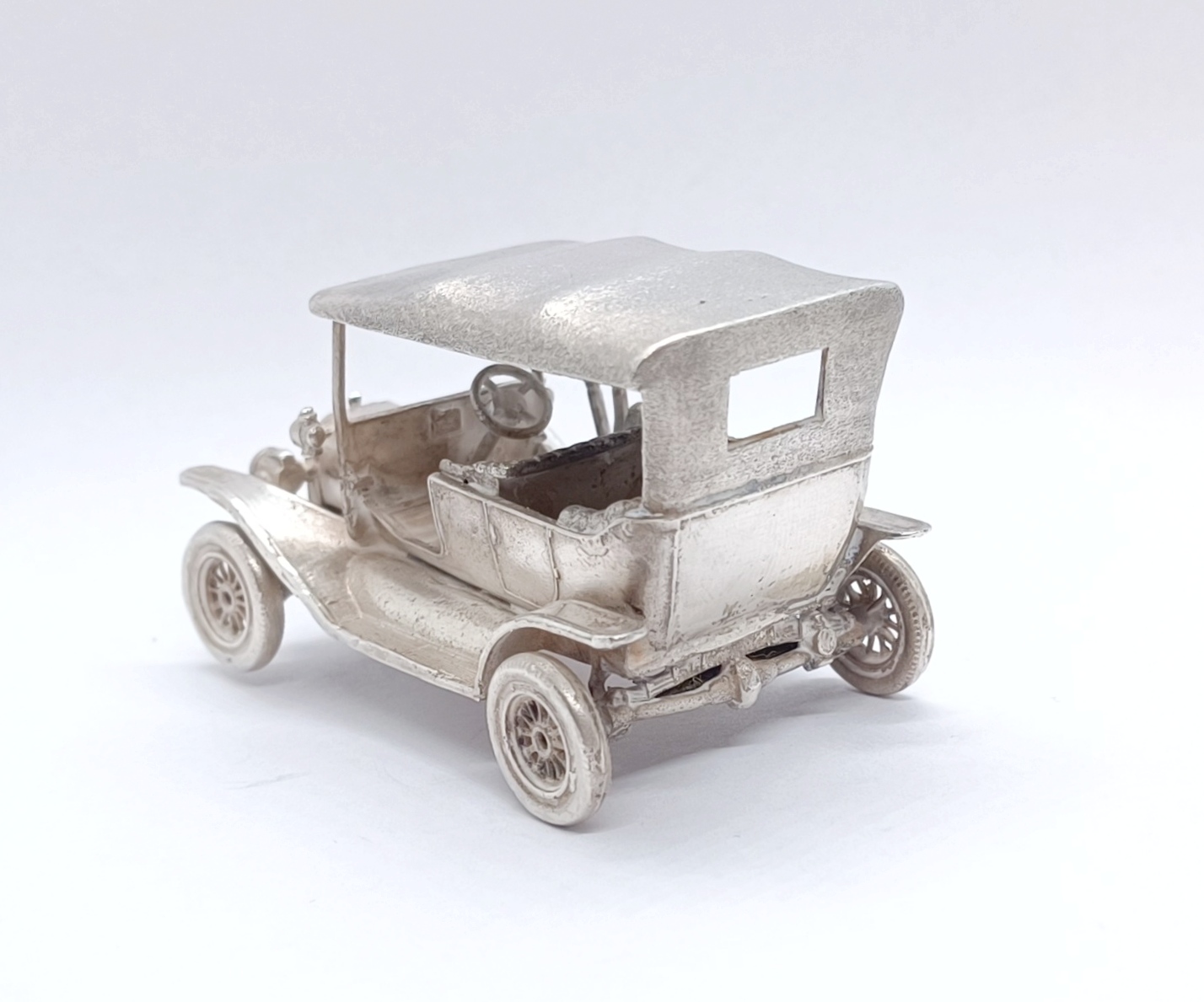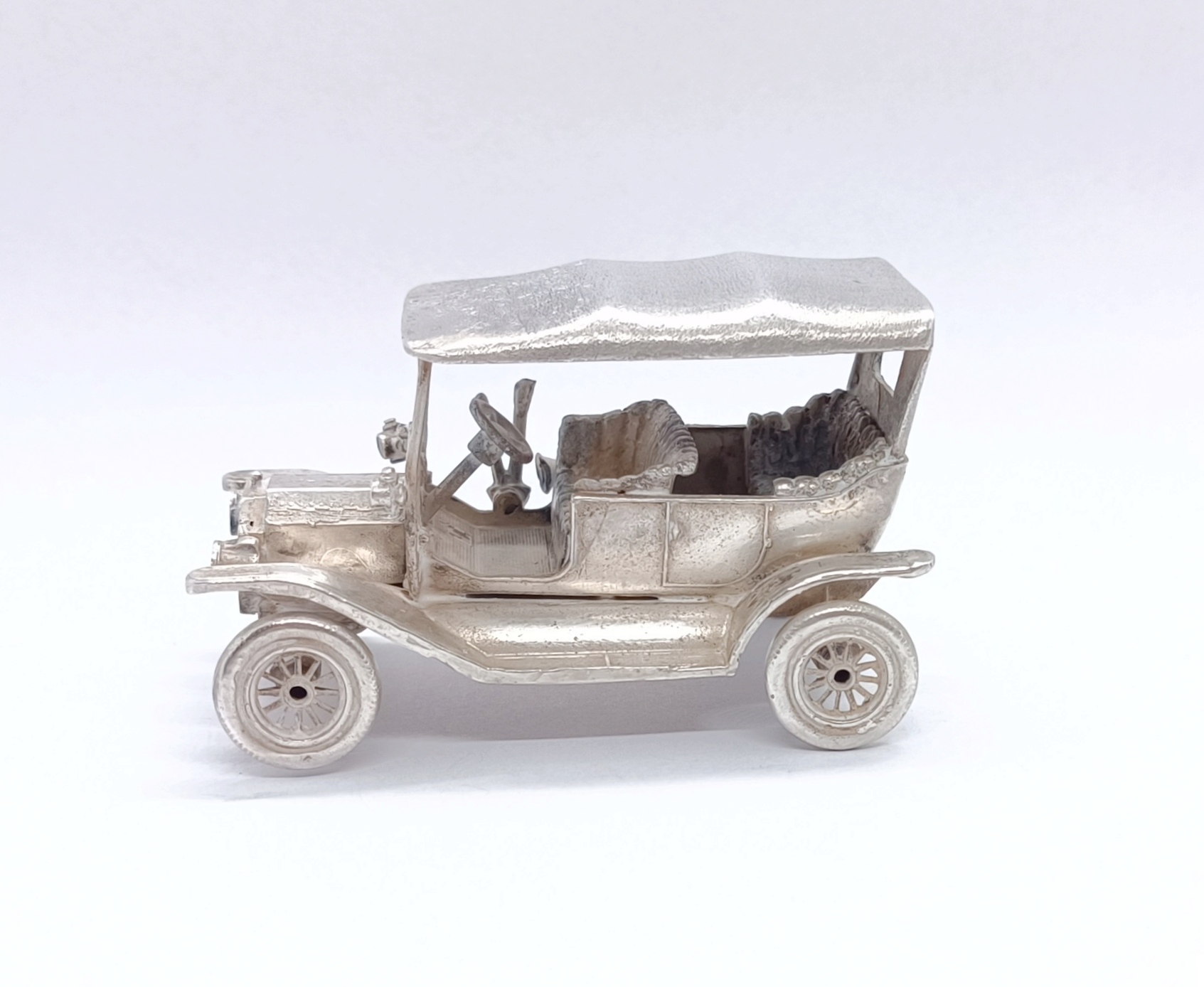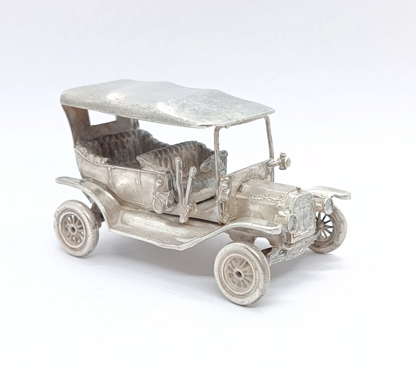 Stříbrný model auta, na spodní straně značeno 1911 Ford model T, Ag btto 128,78g/800/1000, 2. polovina 20. století; délka 7 cm, šířka 4,2 cm, výška 4,5 cm