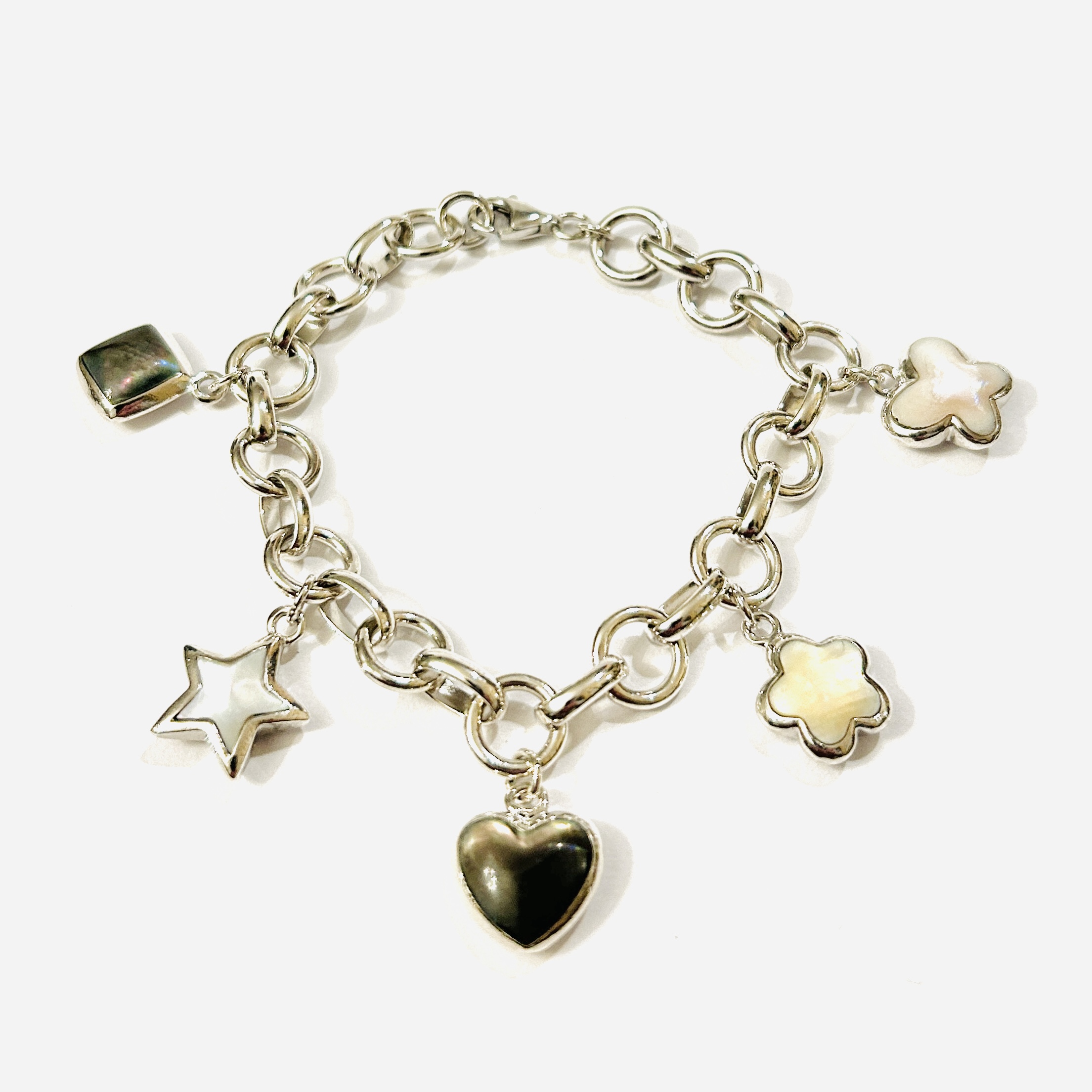 Moderní řetízkový náramek z masivnější vazby \“anker\“ z kulatých a oválných článků. Po vzoru tzv. \“žebráckých náramků\“ zavěšeno 5 přívěšků osazených tvarovanou přírodní perletí od bílé, přes narůžovělou, žlutou po černou, přívěšky ve tvaru kosočtverce, pětihroté hvězdy, srdce, pětilistého květu a motýla. Solidní zlatnická práce italského výrobce Bossano Collection z počátku 21. století.