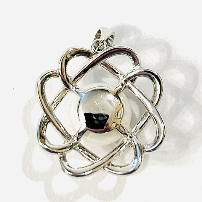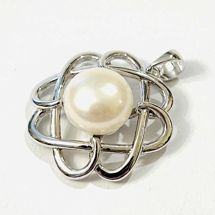 Moderní, nový přívěšek ve tvaru spletitého květu, ve středu osazeno přírodní kultivovanou bílou perlou. Západoevropská zlatnická práce z 10. let 21. století.