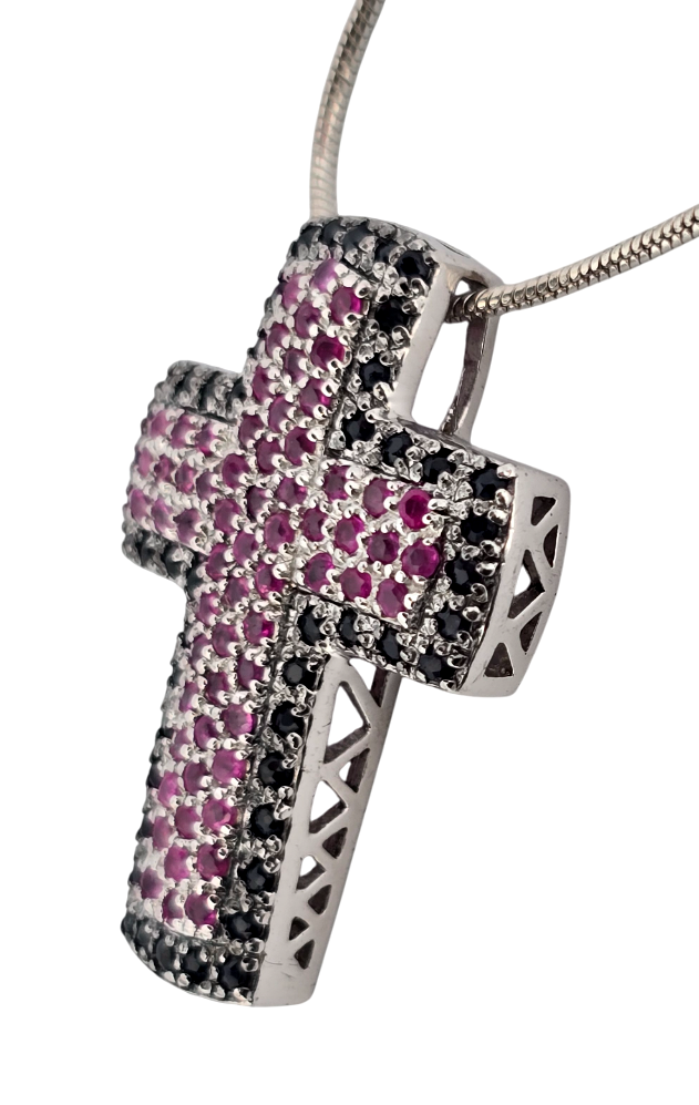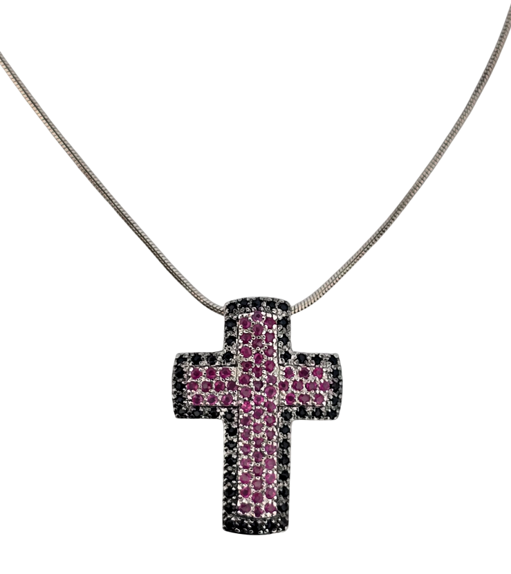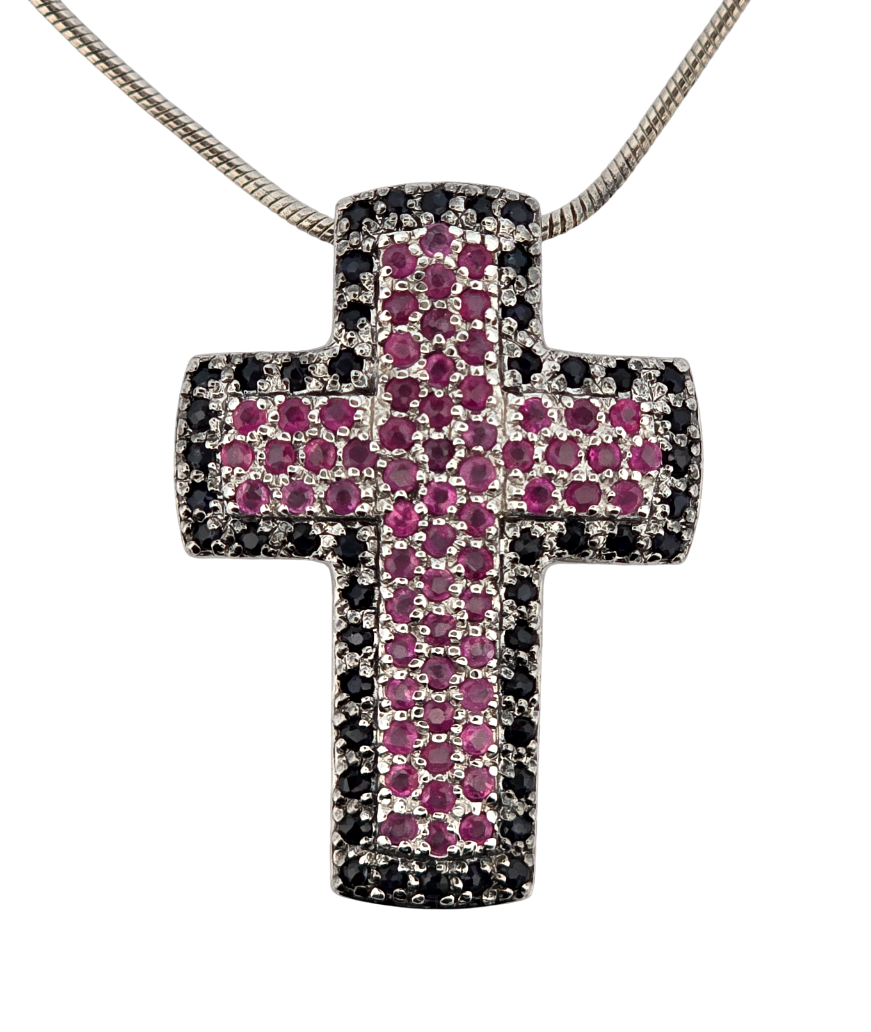 Popis: Přívěsek ve tvaru robustního kříže na stříbrném řetízku. Křížek je osázen přírodními rubíny a safíry. Celkem přívěs obsahuje 63 kusů růžového rubínu kulatého briliantového brusu o celkové váze cca 1,26 ct. Dále přívěs obsahuje 48 kusů modrých safírů, kulatého briliantového brusu, o celkové váze cca 0,96 ct.