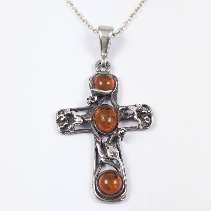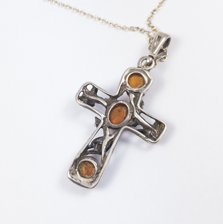 Stříbrný závěs s jantarem ve tvaru křížku se stříbrným řetízkem, jantar, stříbro o ryzosti 900,925/1000 o celkové hmotnosti 6,76 g