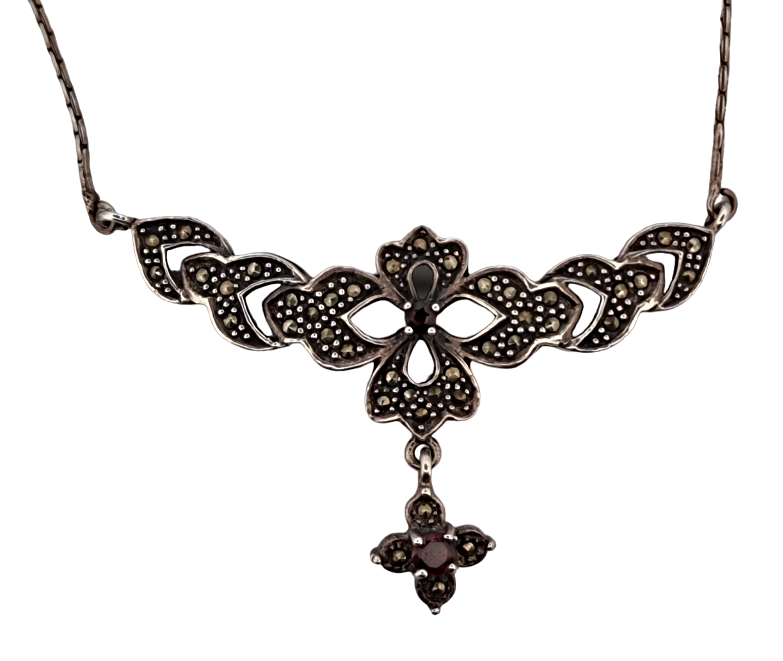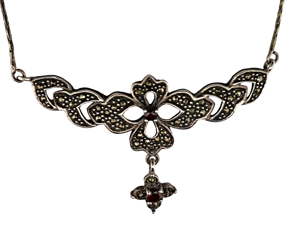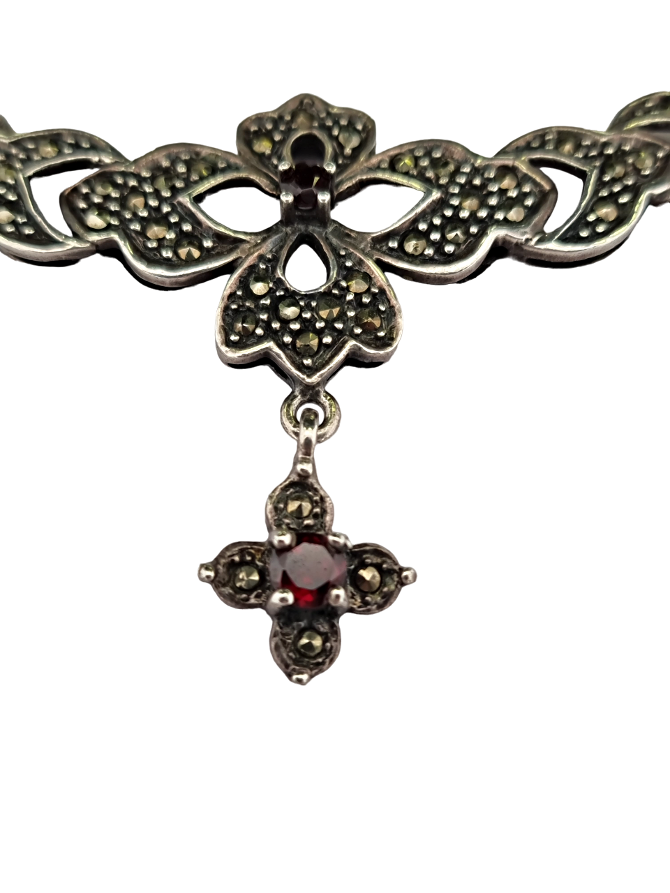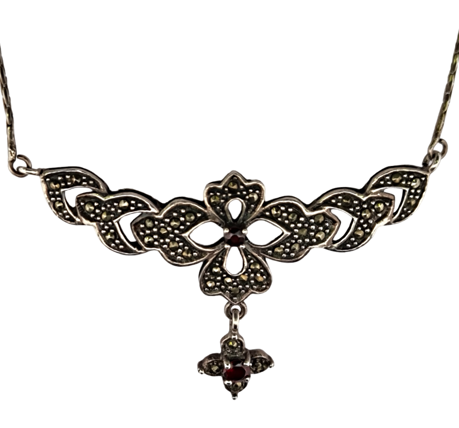 Popis: Stříbrný náhrdelník (collier) s markazity a granáty.