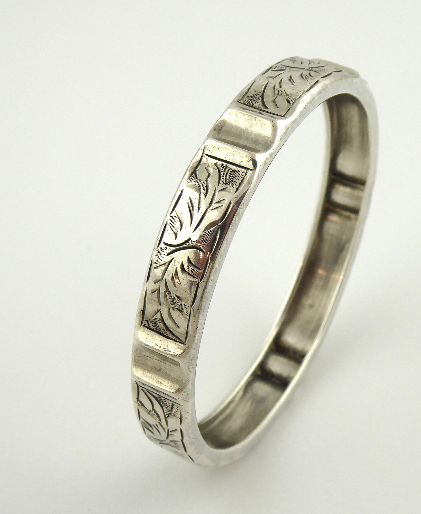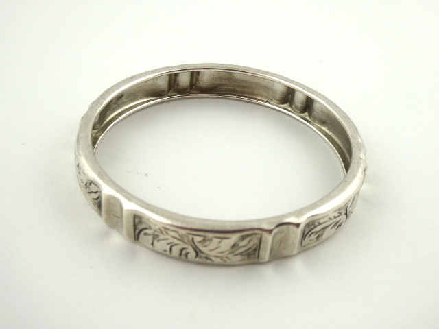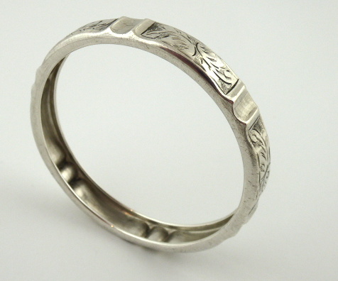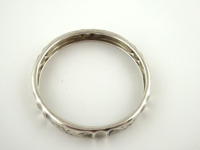 Stříbro. Ryzost Ag 900/1000, celková hmotnost 13,30 g. Stříbrný náramek ve tvaru kruhu zdobeným gravírovaným ornamentem a obloukovitě tvarovanou čelní pohledovou stranou. Značeno platným československým puncem, ryzostí 900, mistrovskou značkou. Československo 1929 – 1949. Průměr: 63 mm.