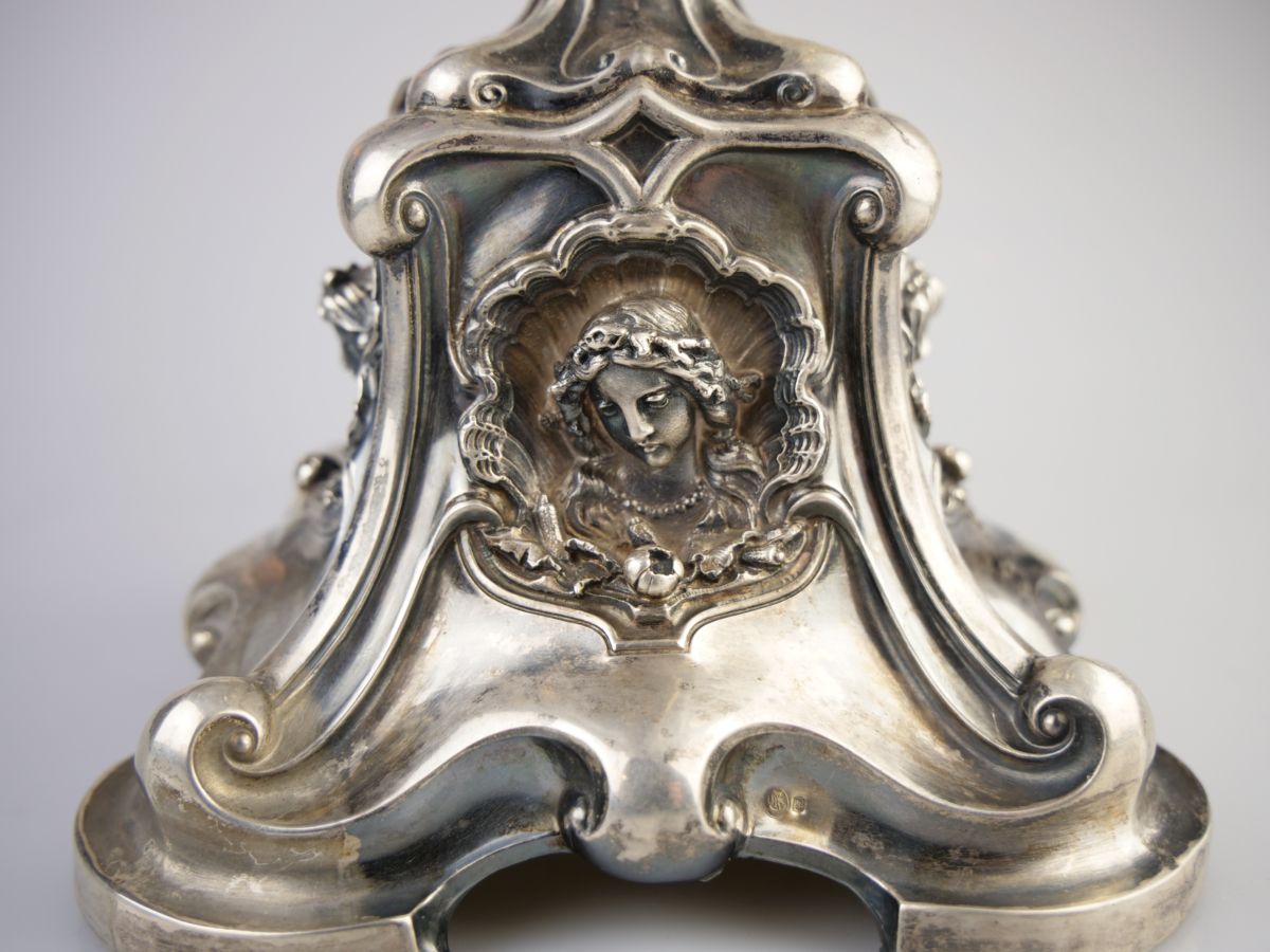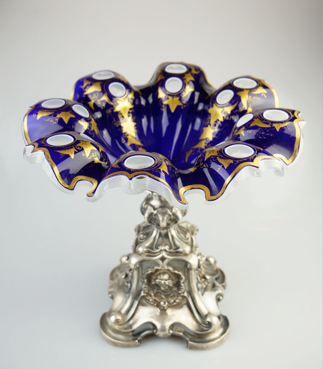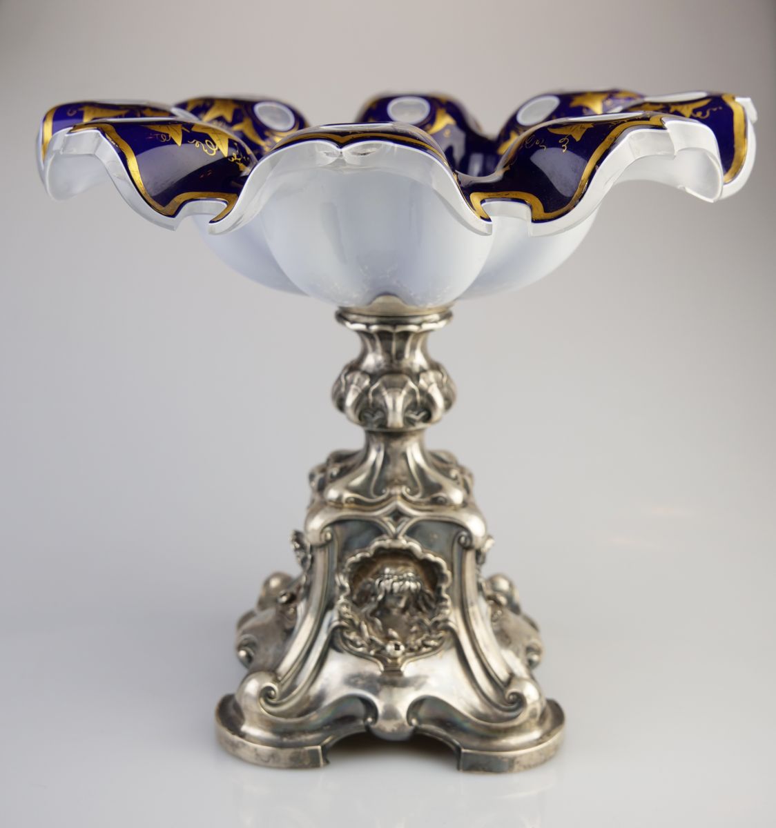 luxusní nástolec z období pozdního biedermeieru, noha z tepaného stříbra zdobená třemi různými dívčími hlavami, hlavou starce, rozmanitými volutami a motivy lastur, mísa z čirého skla vrstveného opakním bílým a kobaltovým sklem, členitě zabrušované okraje a optický brus v plochách mísy, zlatem bohatě malovaný motiv břečťanových stonků, Ag btto 920 g/800/1000, západní Evropa (pravděpodobně Francie), kolem roku 1860, dobový nečitelný punc, pozdější český punc; výška 21,5 cm, průměr skla 24 cm; sběratelsky zajímavé
