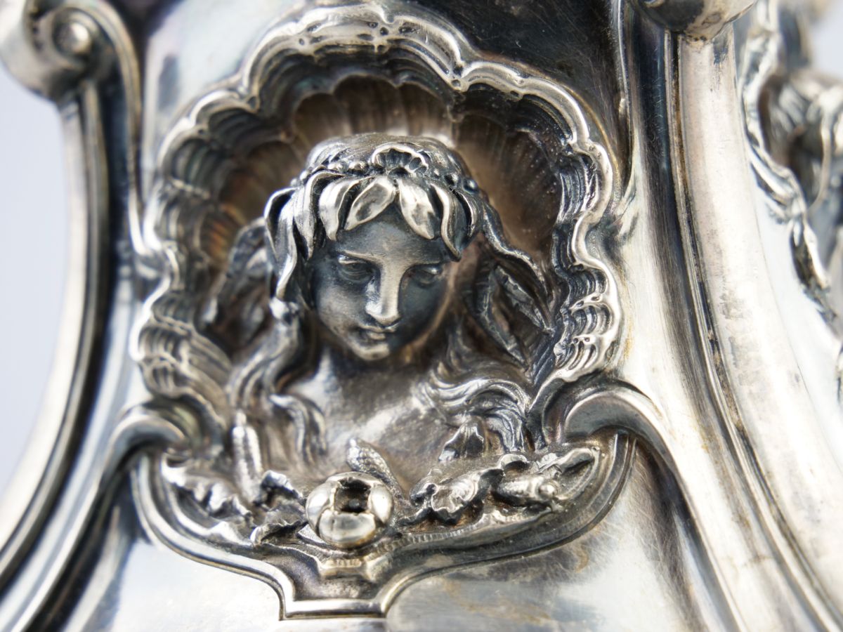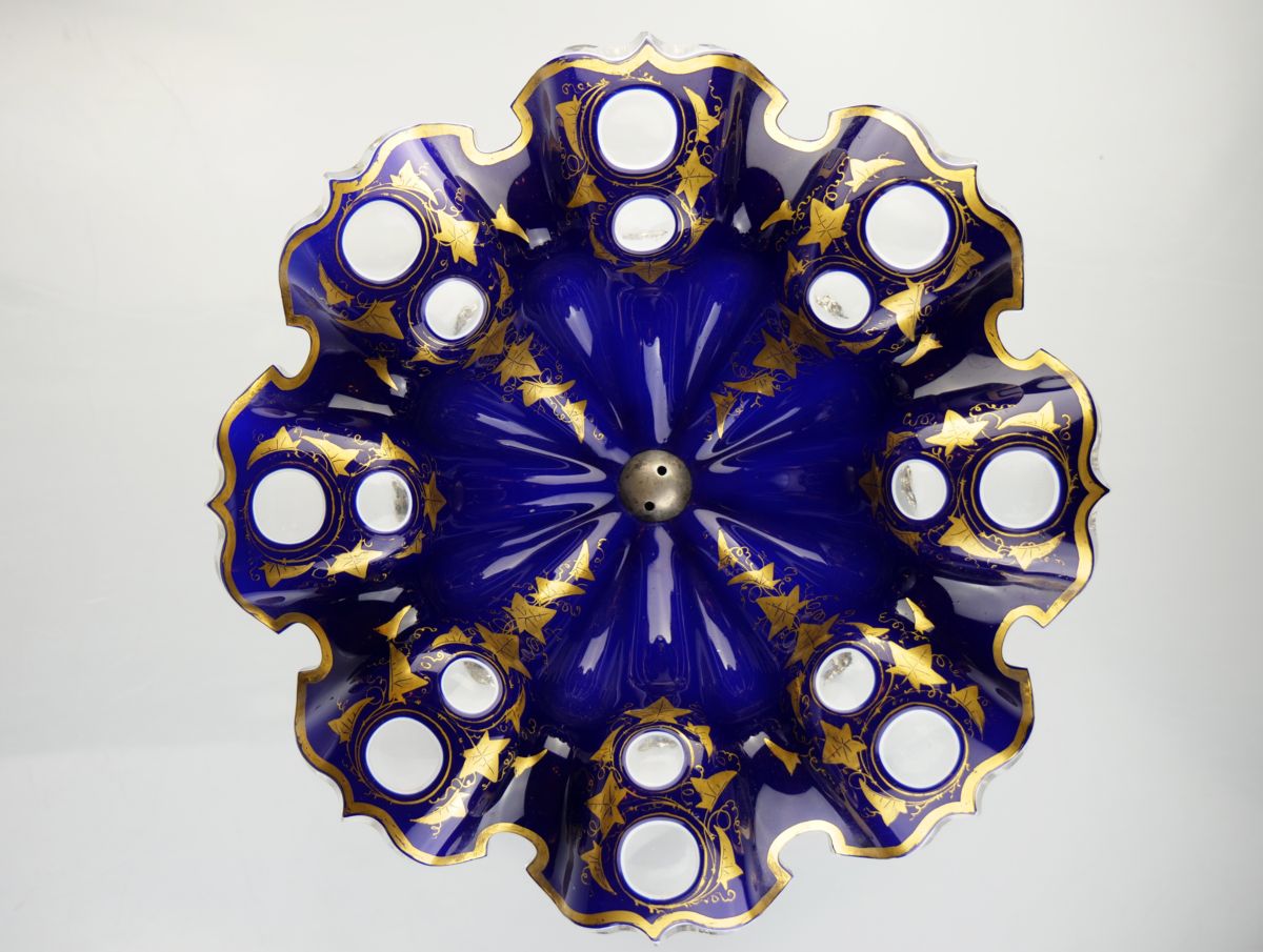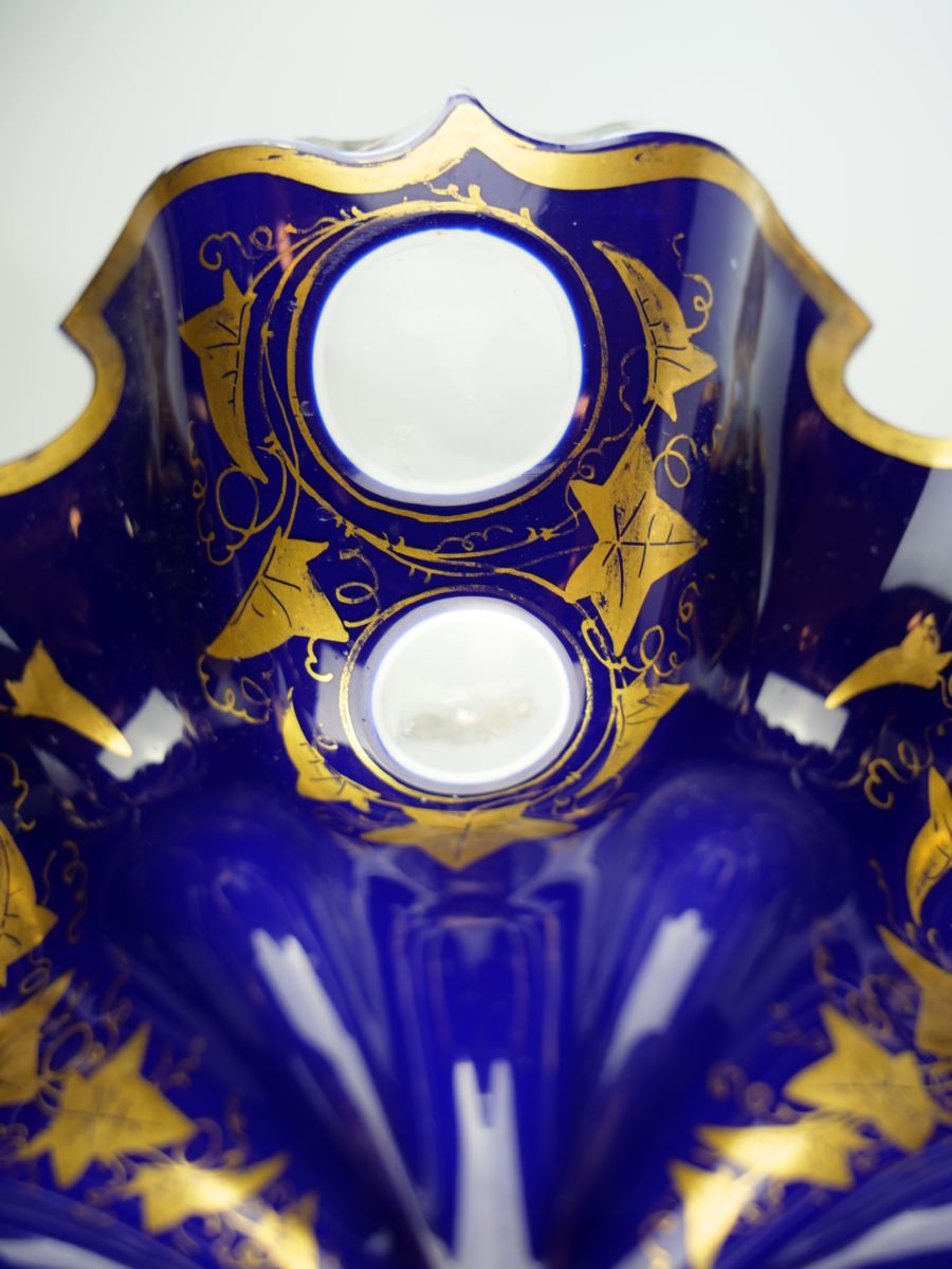 luxusní nástolec z období pozdního biedermeieru, noha z tepaného stříbra zdobená třemi různými dívčími hlavami, hlavou starce, rozmanitými volutami a motivy lastur, mísa z čirého skla vrstveného opakním bílým a kobaltovým sklem, členitě zabrušované okraje a optický brus v plochách mísy, zlatem bohatě malovaný motiv břečťanových stonků, Ag btto 920 g/800/1000, západní Evropa (pravděpodobně Francie), kolem roku 1860, dobový nečitelný punc, pozdější český punc; výška 21,5 cm, průměr skla 24 cm; sběratelsky zajímavé
