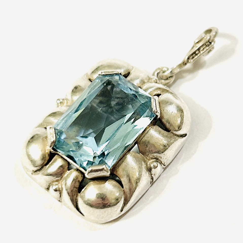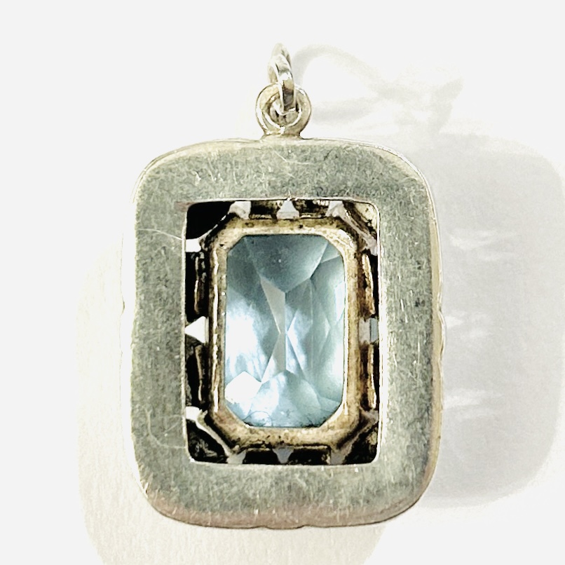 Výrazný přívěšek v novobarokním tvarosloví s centrálním modrým kamenem obdélného brusu, fasováno plochými rohovými krapnami, vinuté očko zušlechtěno zrnkováním. Solidní česko/slovenská zlatnická práce ze 40. let 20. století.