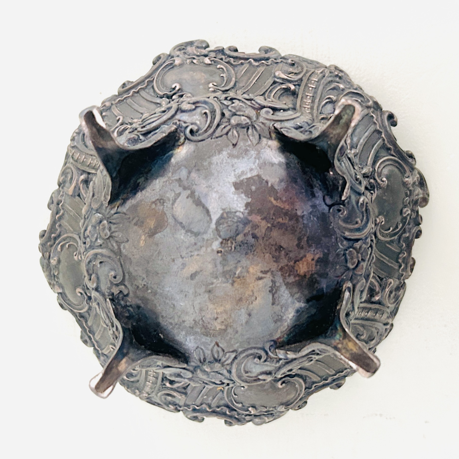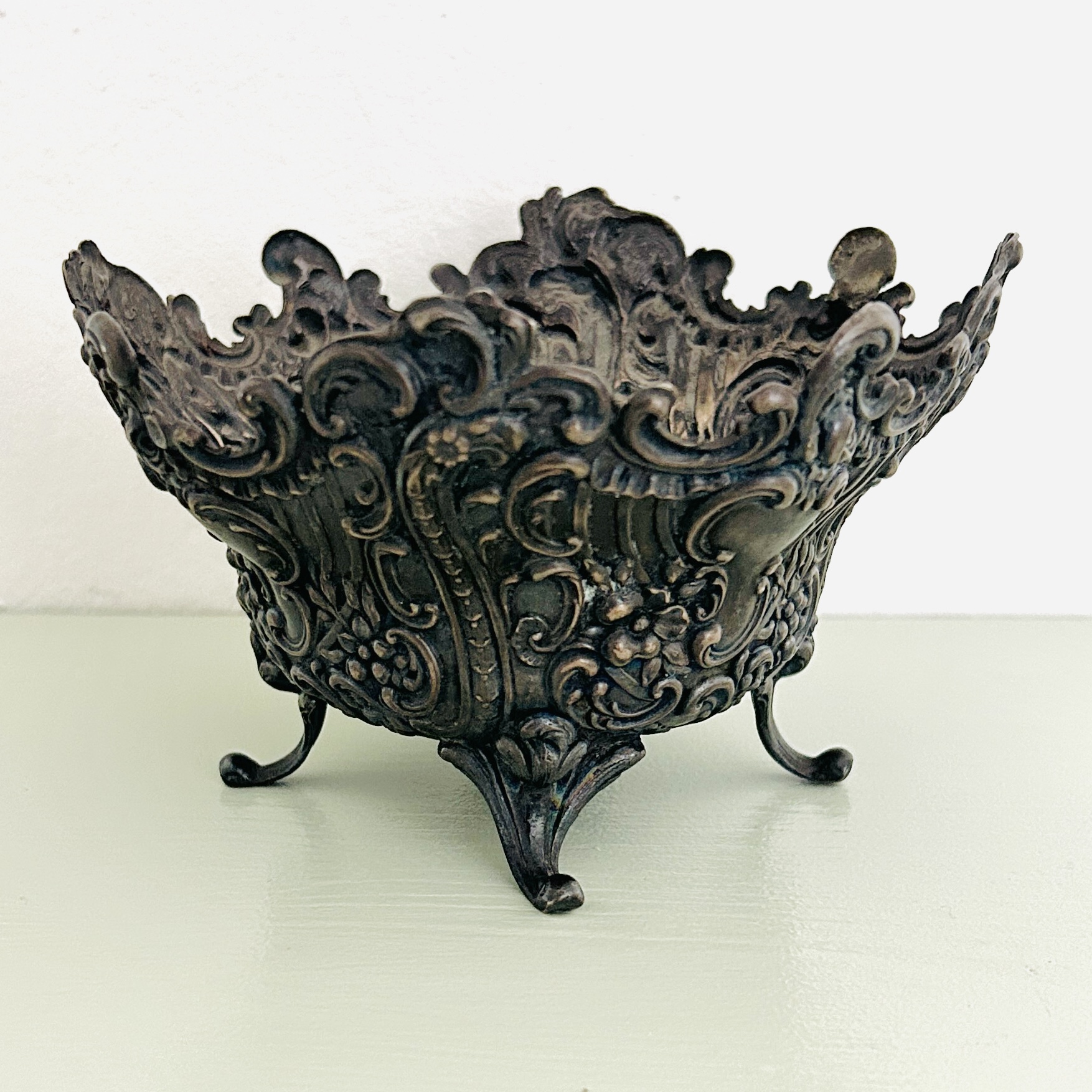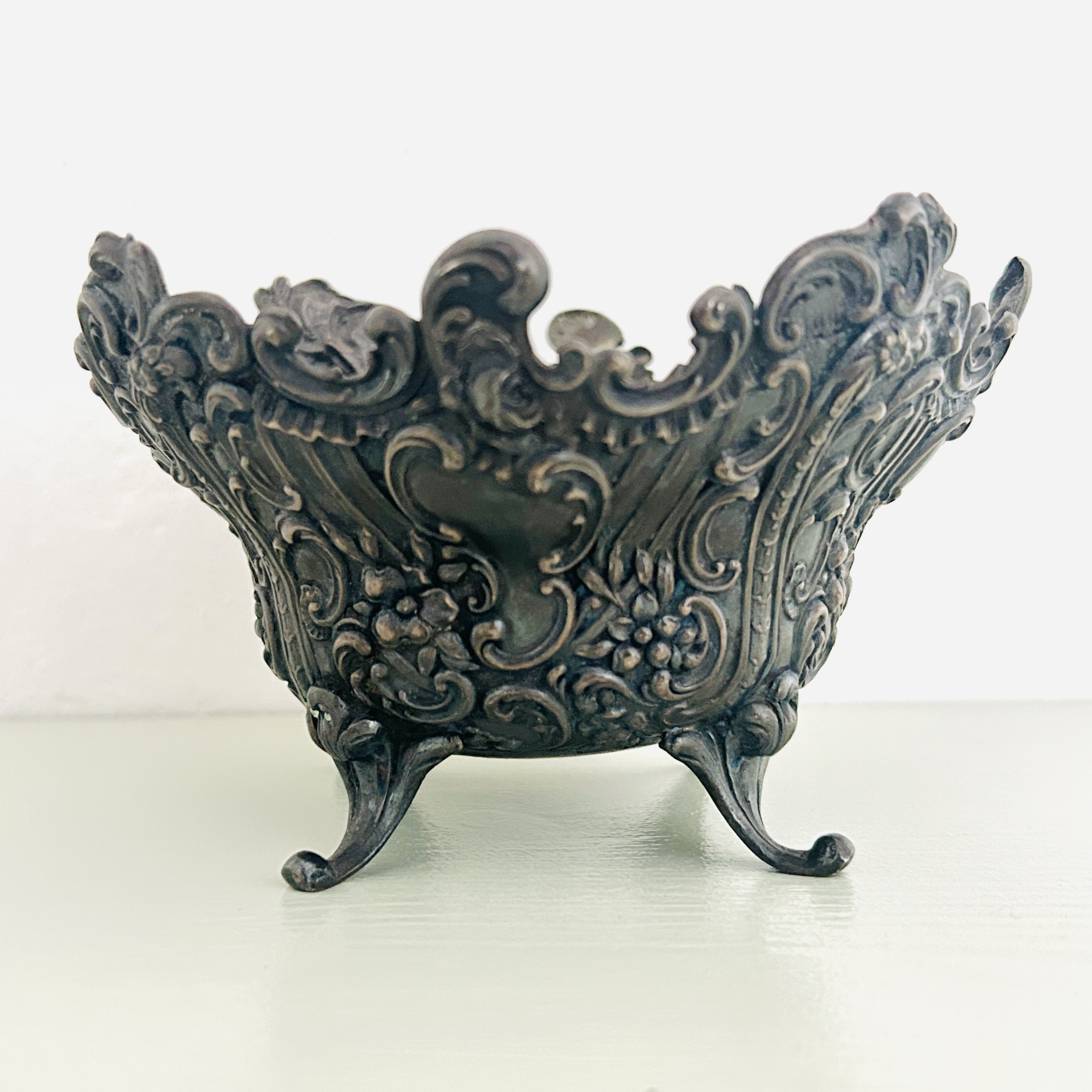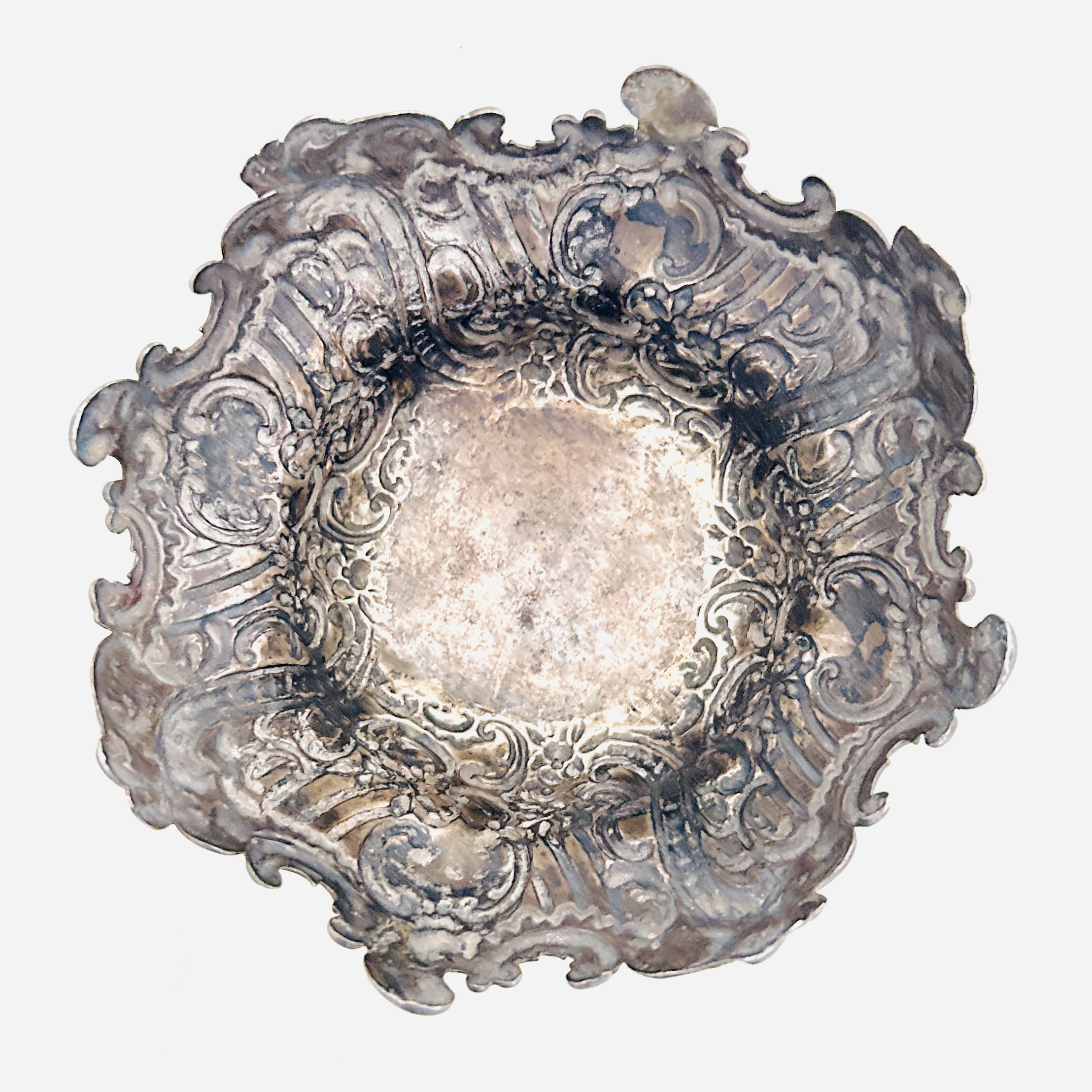 Dekorativní, honosný nástolec či miska na nožičkách pro odkládání nejen drobných předmětů. Plasticky pojatý novorokokový plášť s bohatými dekory (rokaj, rozviliny) s vysoce členitým okrajem. Kvalitní stříbrnická práce hanauské dílny Storck & Sinsheimer z poslední čtvrtiny 19. století, jež svou činností navazovala na historickou tradici výroby zdobného tepaného stříbra v tomto městě.