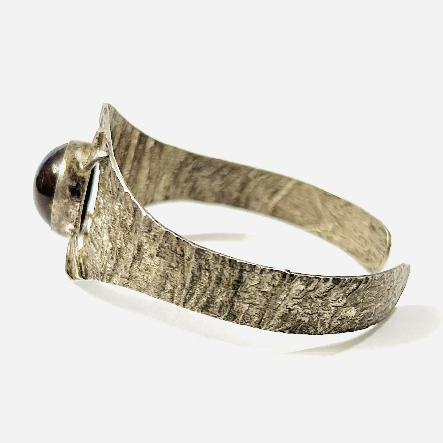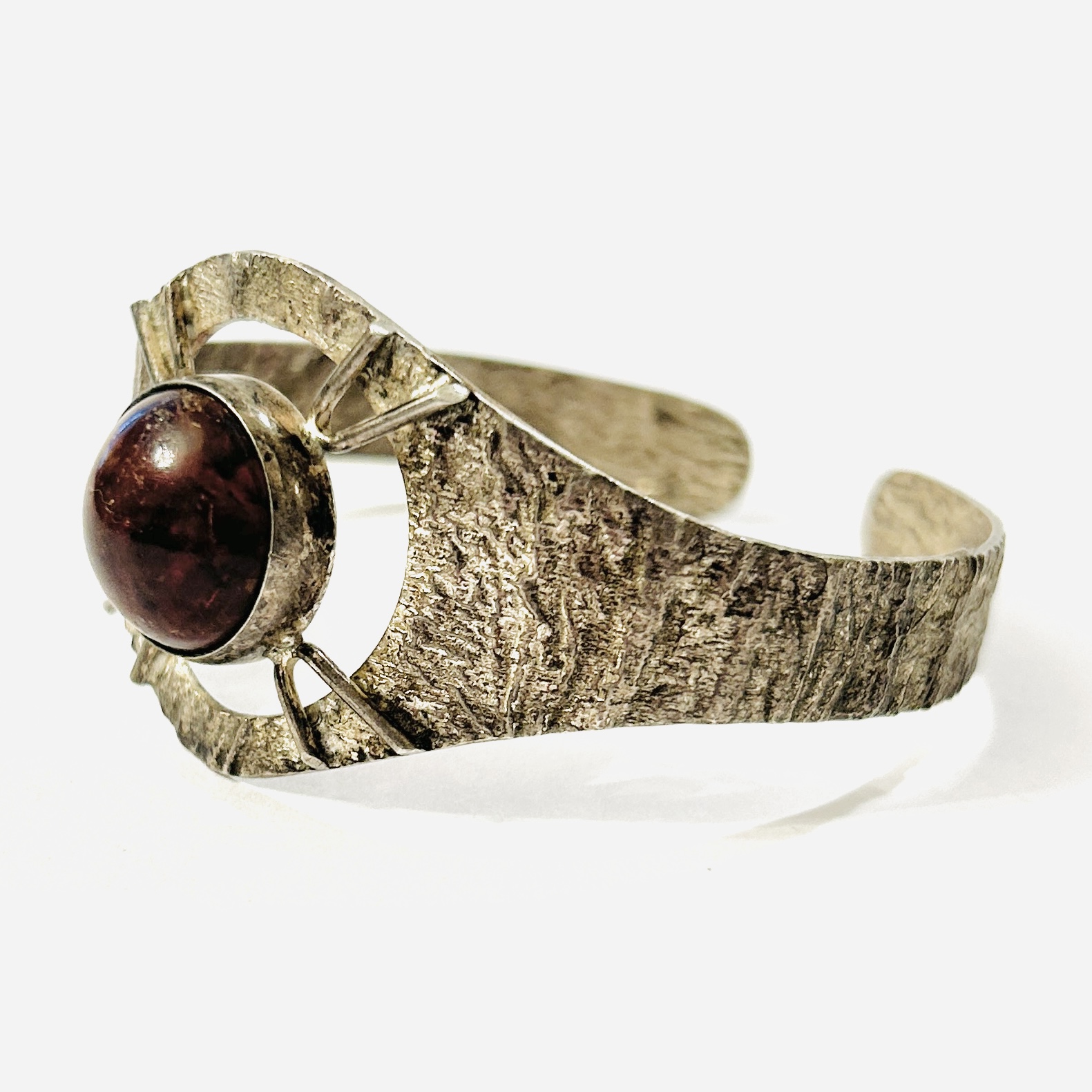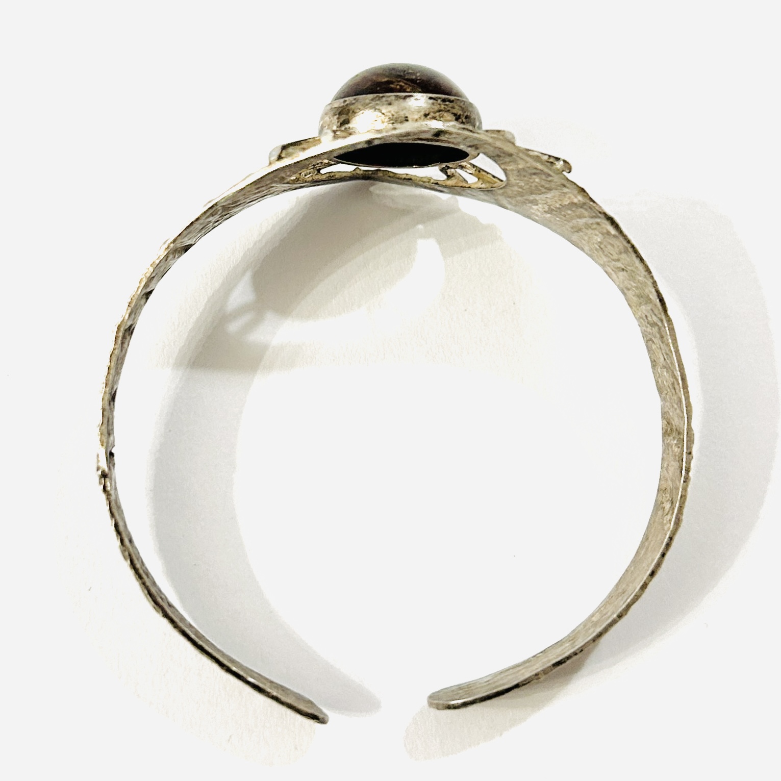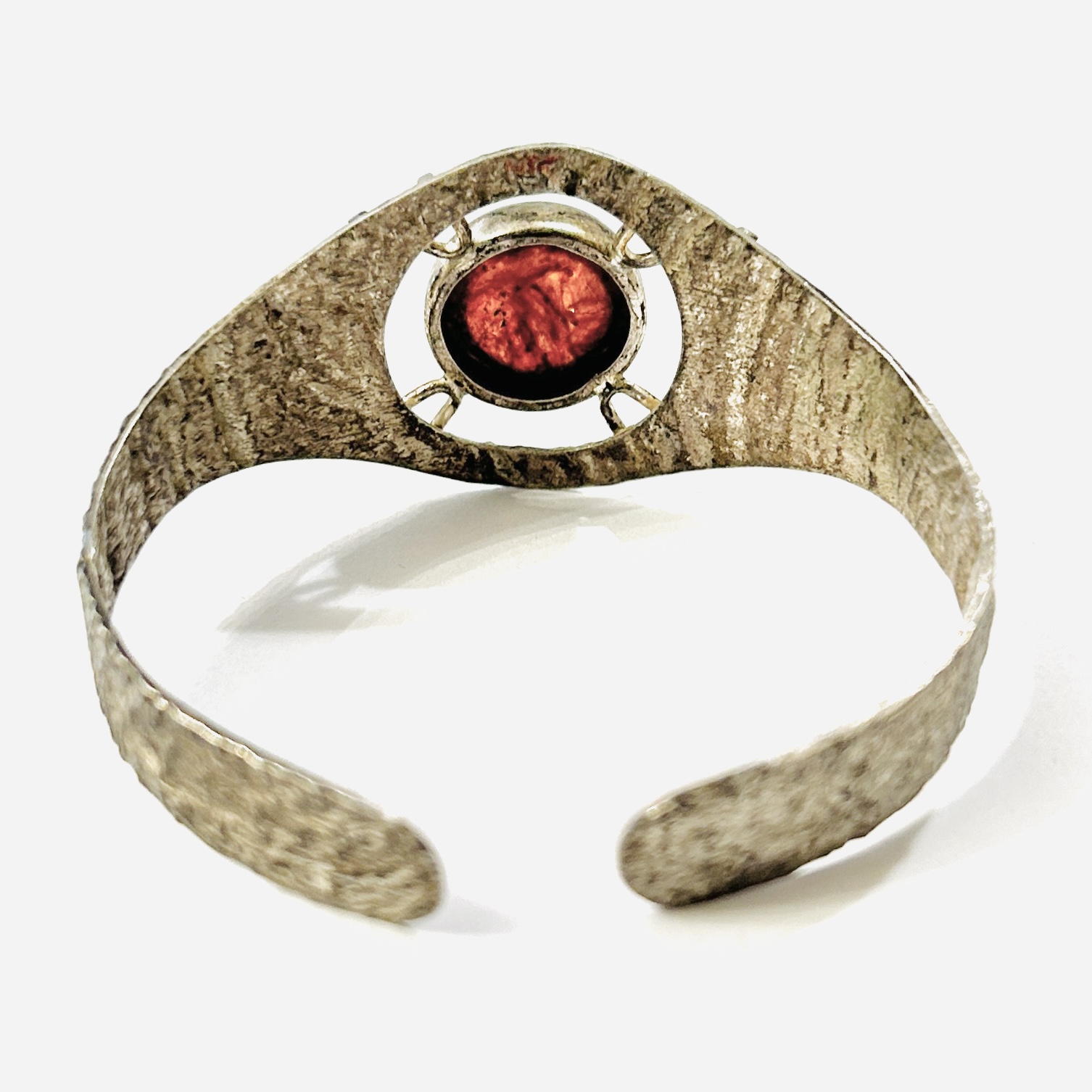 Extravagantní, neotřelý pevný náramek v brutalistním stylu, celý povrch s organickým povrchem, rozšiřující se hlavice s kruhovým výřezem osazena kulatou muglí přírodního jantaru fasovanou v hladké obrubě. Kvalitní německá zlatnická práce z konce 60. či 1. poloviny 70. let 20. století.