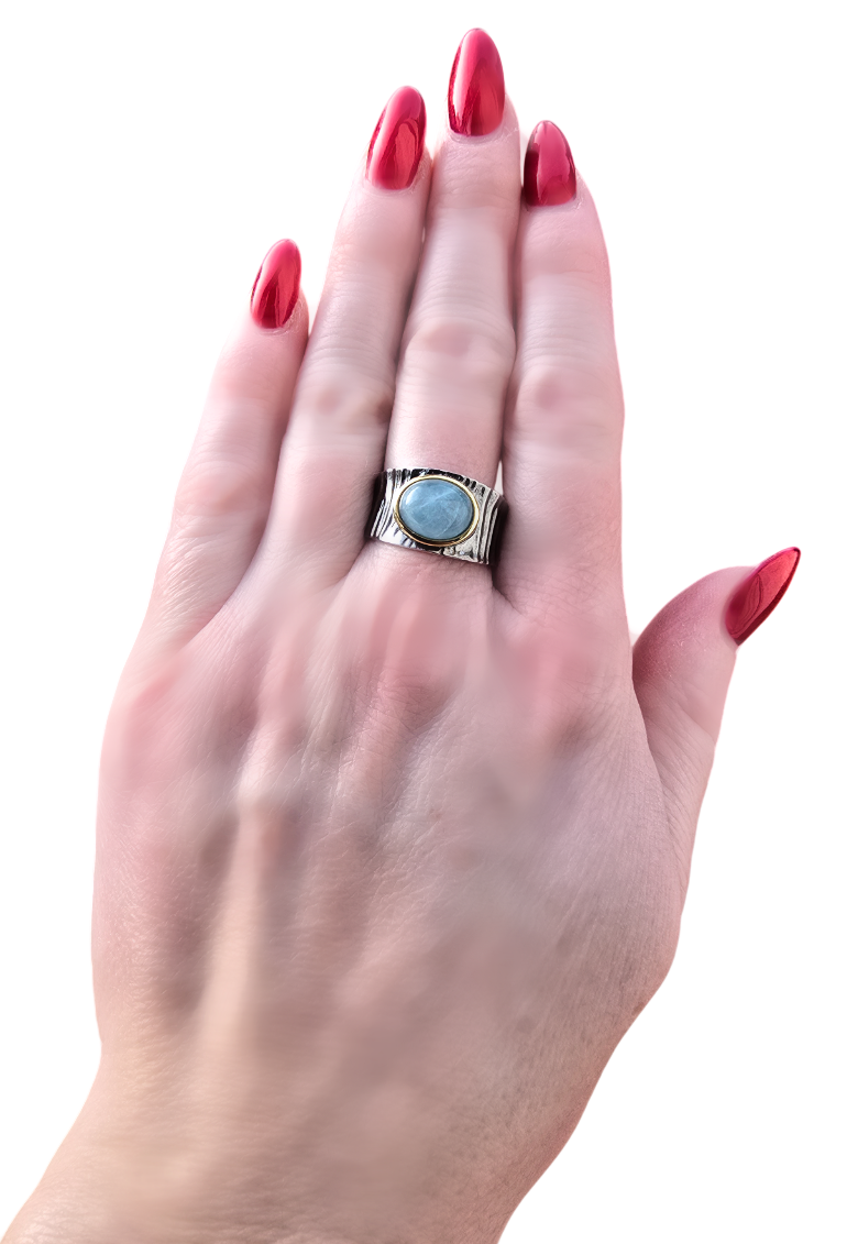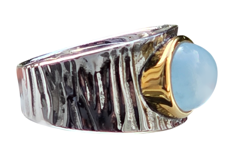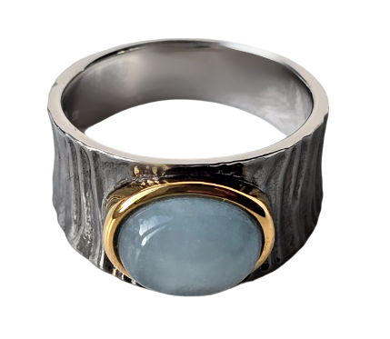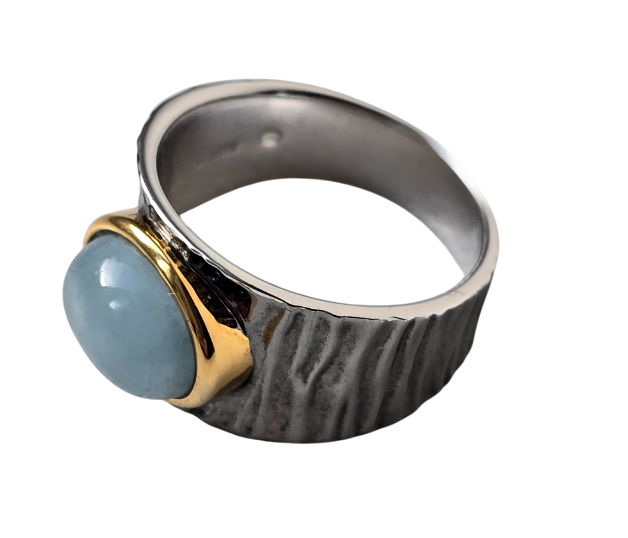 Popis: Stříbrný plasticky zdobený prsten s přírodním mléčným akvamarínem. Jedná se o oválný kabošon 1 x 0,8 x 0,43 cm, o váze cca 2,5 ct. Lem oválného akvamarínu je zdoben silným zlacením. Výjimečný šperk.