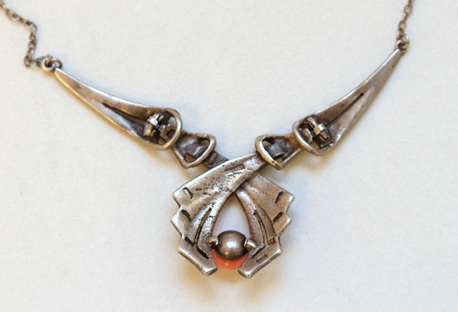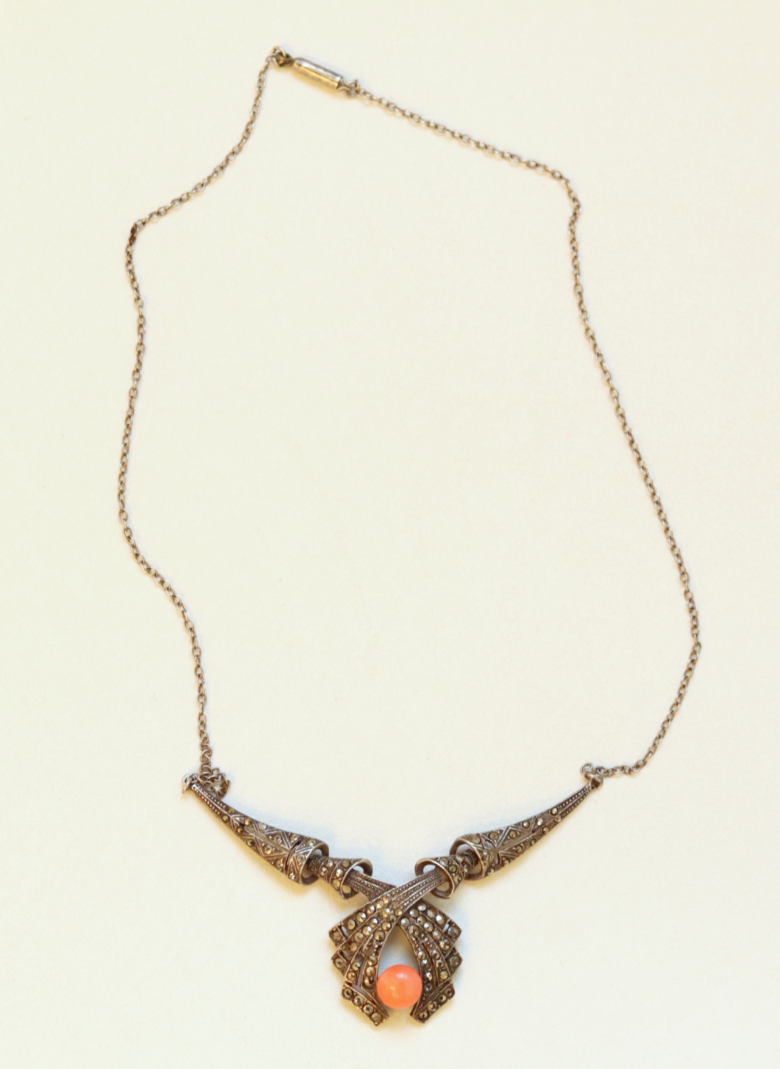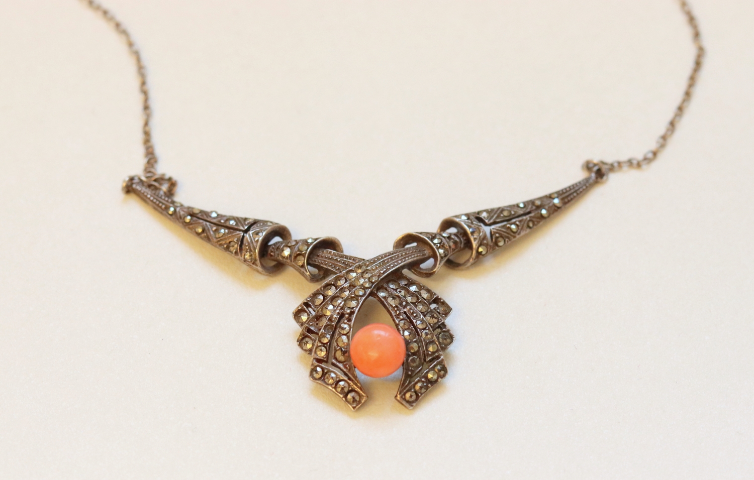 Stříbrný přívěs se středomořským korálem a markazity. Ag 925/000, váha 10,15 g. 1. polovina 20. století. Délka: 21 cm