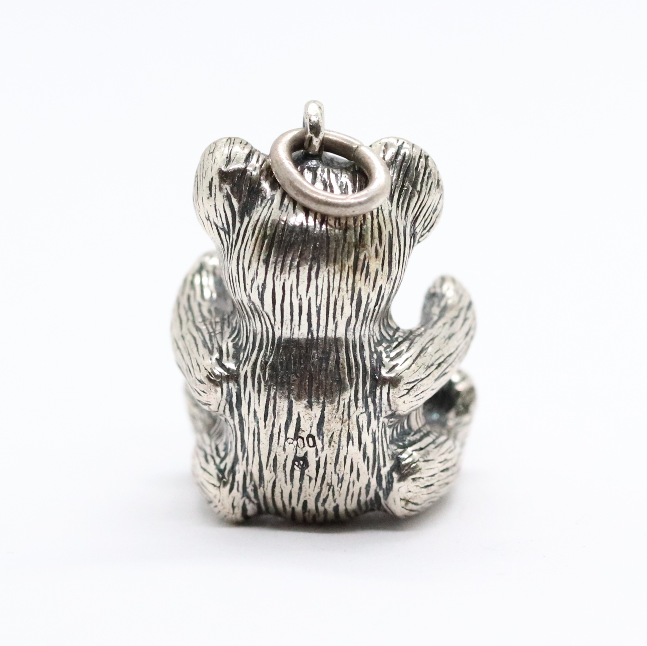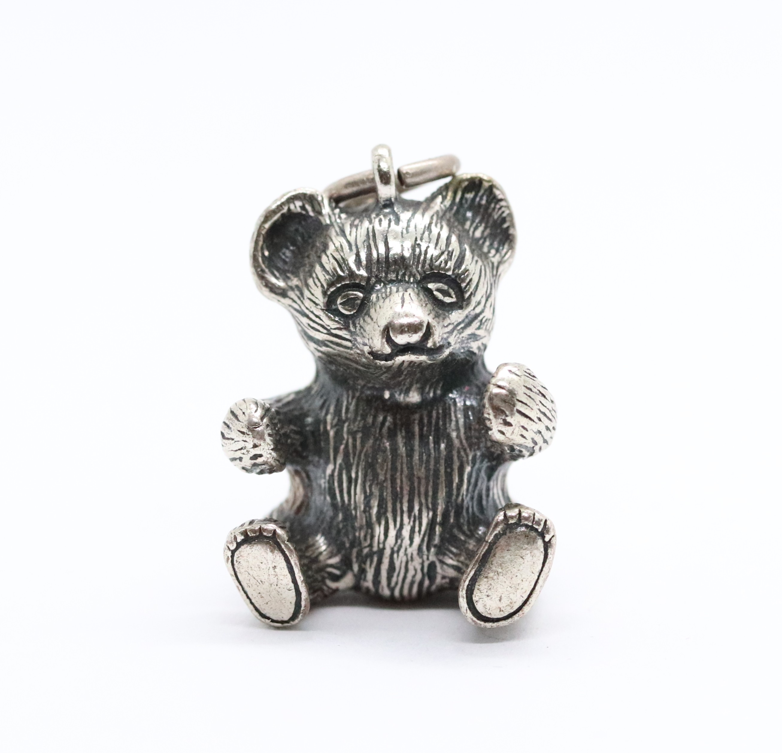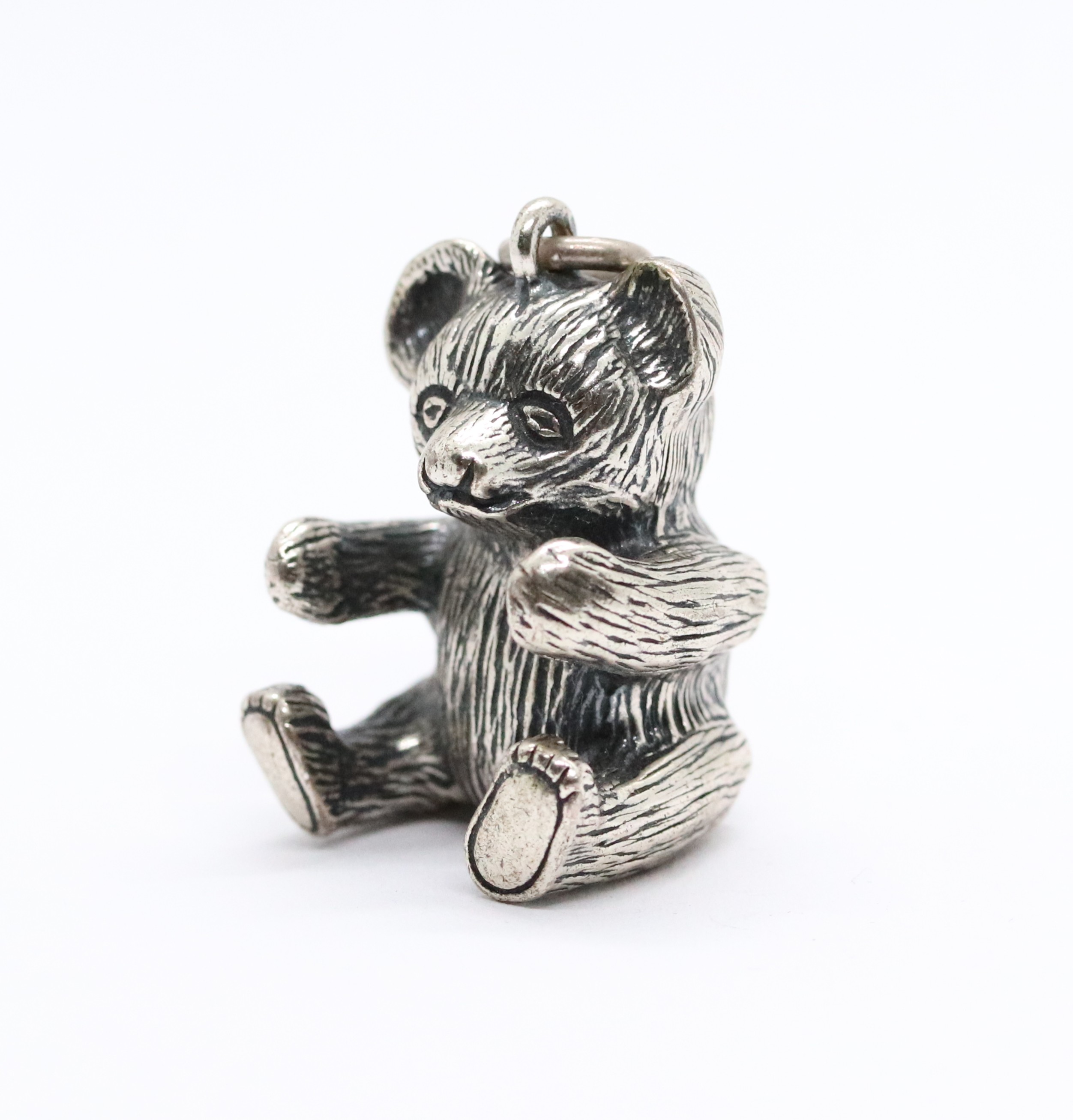 Starožitný stříbrný přívěsek v podobě medvídka, Ag 16,85g/800/1000, zdobený gilošováním, západní Evropa, 30. léta 20. století, atest puncovního úřadu; výška 2,5 cm, šířka 2 cm