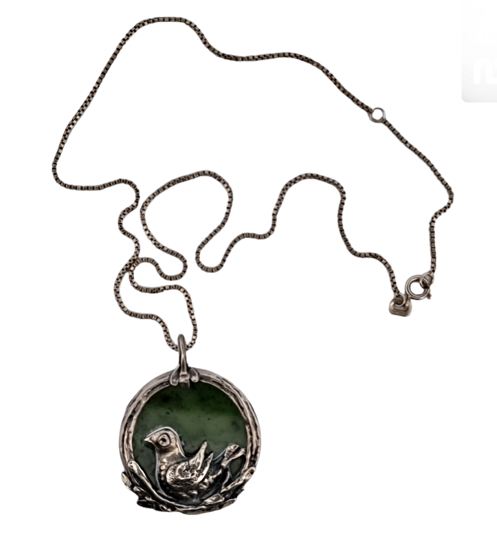 Popis: Stříbrný unikátní přívěsek – ptáček sedící na větvi, zpracováno na přírodním drahokamu, tzv. serpentinu. Vzácný šperk.