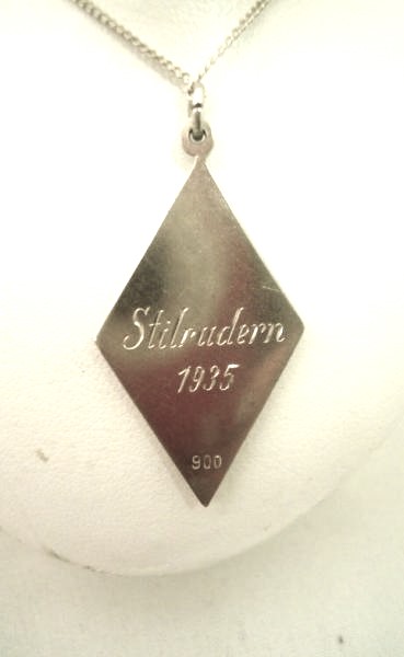 Starožitný stříbrný přívěsek + stříbrný řetízek, přívěšek zdobený barevnými smaltem s námětem lodní cesty. Pravděpodobně německé Kraft durch Freunde, stříbro v ryzosti Ag 900/1000 + stříbro v ryzosti AG 925/1000, váha celého kompletu je 5,58 gramů. Vyrobeno kolem roku 1930, v zadní části i dobová rytina.