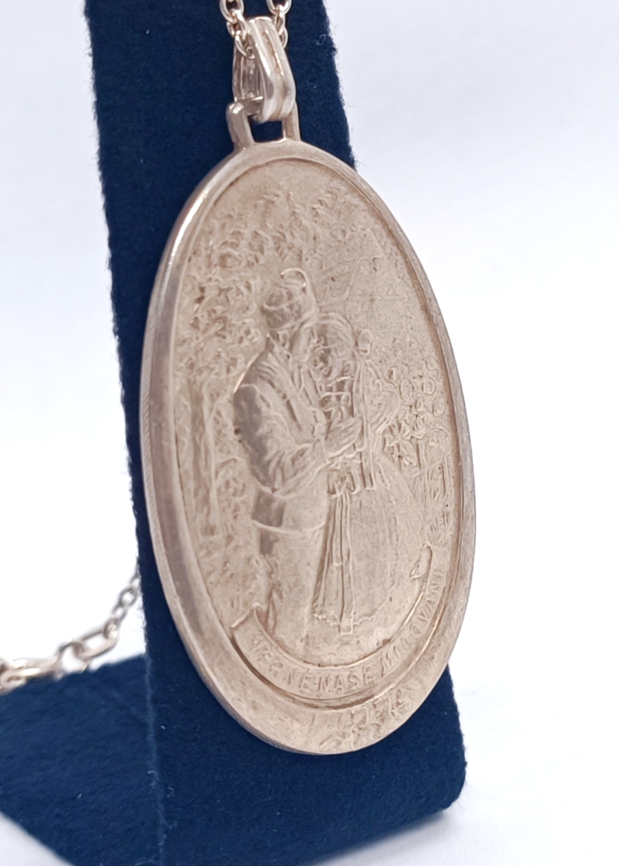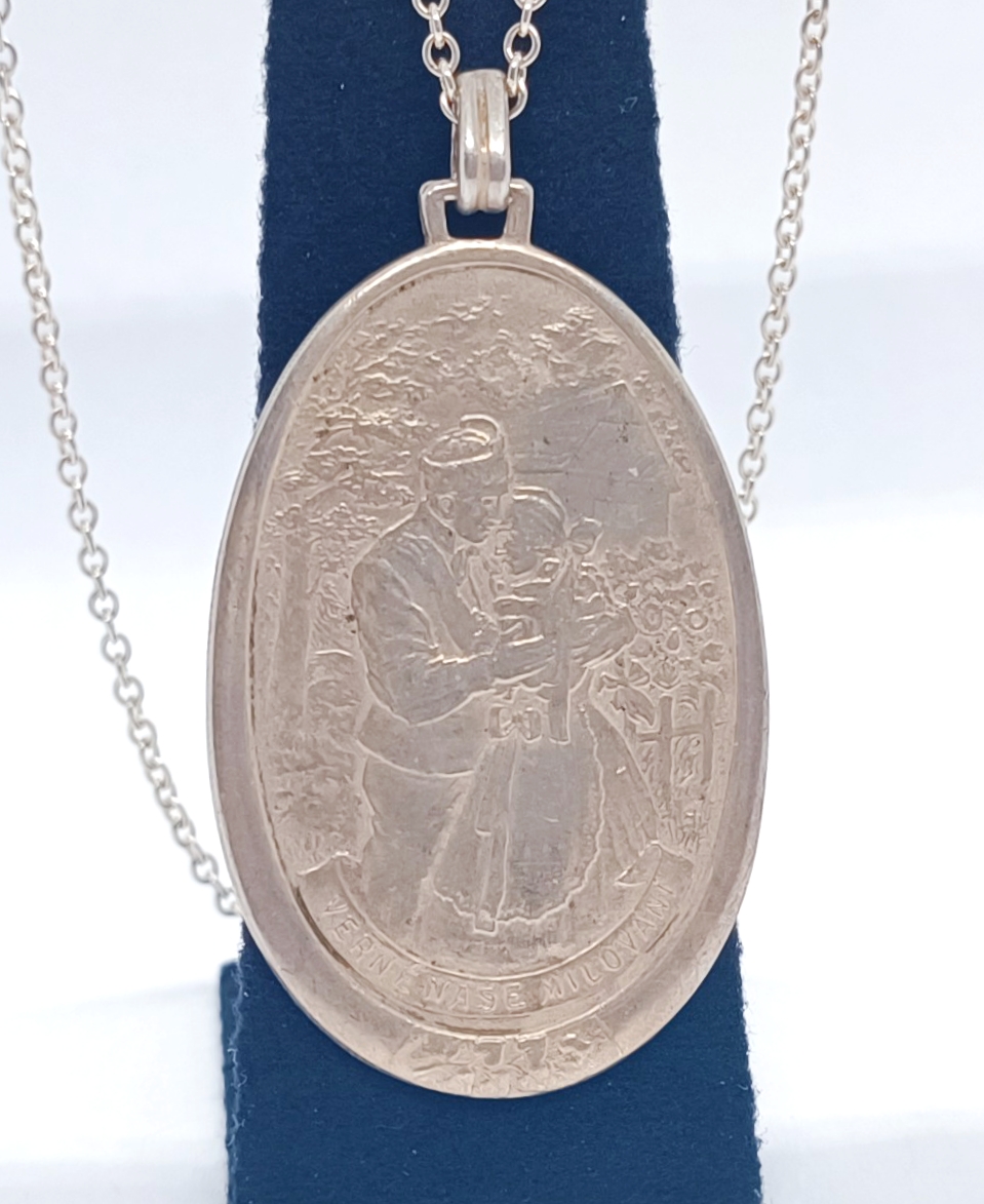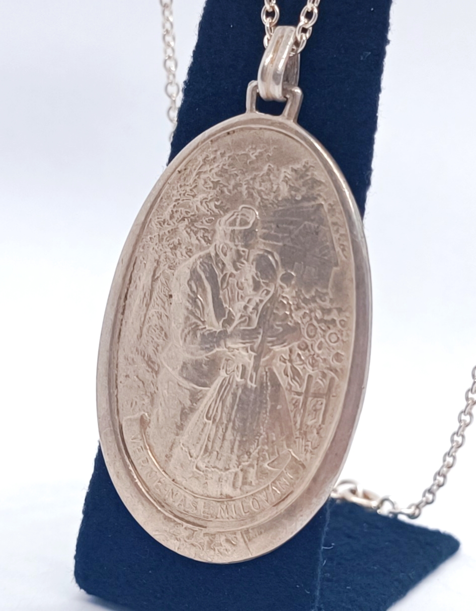 Stříbrný přívěsek reliéfně zdobené vyobrazení scény z Prodané nevěsty Věrné naše milování, Ag 14,06g/900/1000 (punc pro Protektorát Čechy a Morava, č. 3 v trojúhelníku); délka5,5 cm, šířka 3 cm, řetízek ryzosti 925/1000/4,90g; délka 63 cm