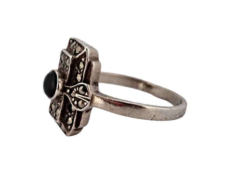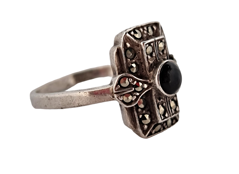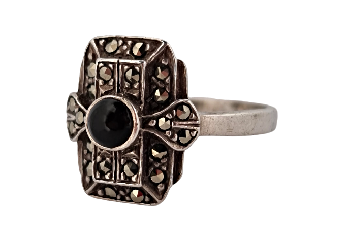 Popis: Nádherný Art Deco prsten stříbrný s přírodním onyxem a markazity.