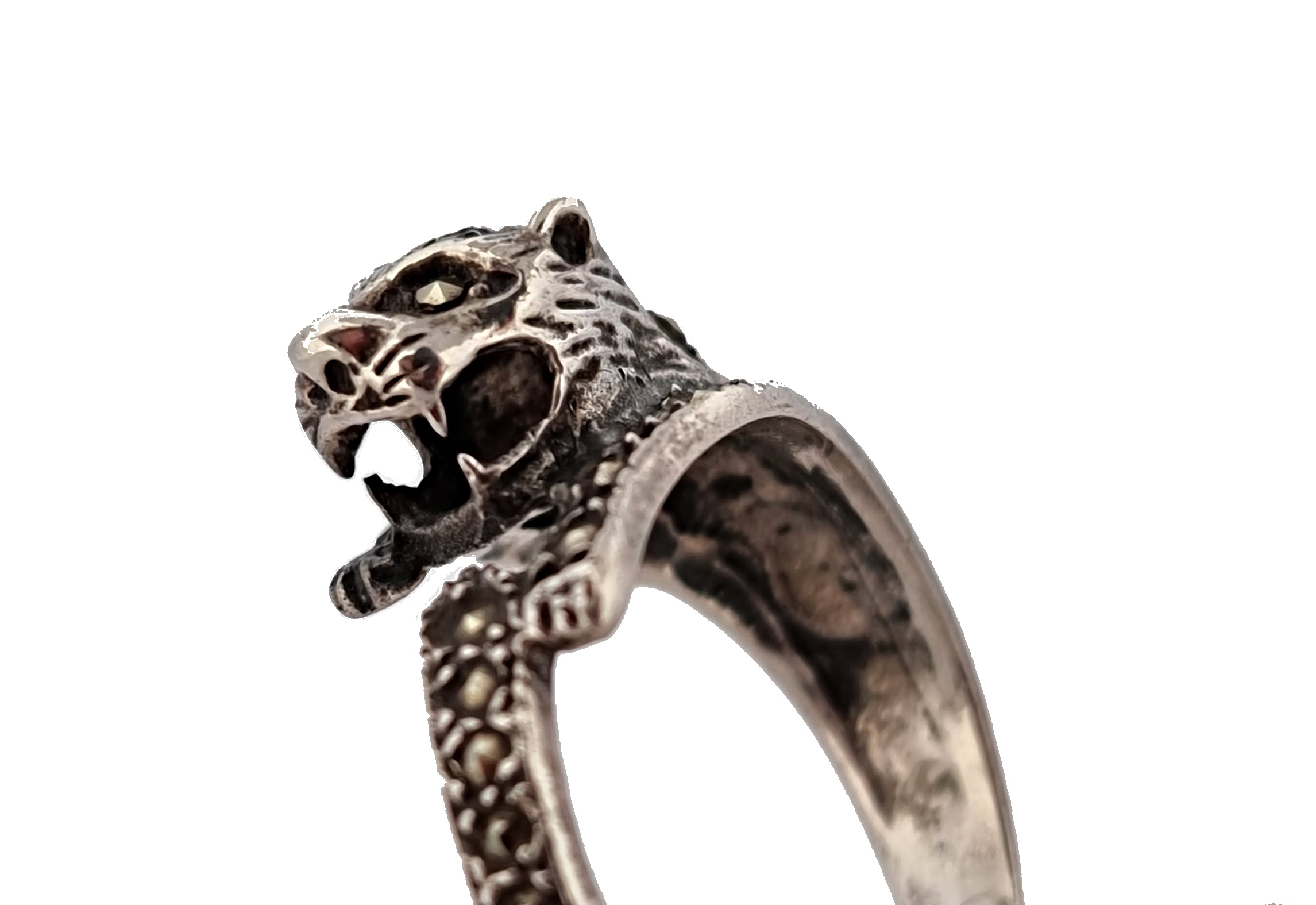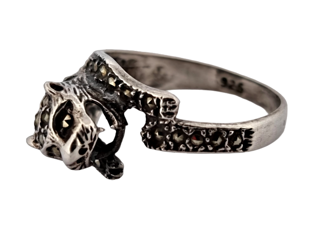 Popis: Stříbrný prsten \\\\\\\“divoká šelma\\\\\\\“ vykládaný markazity.