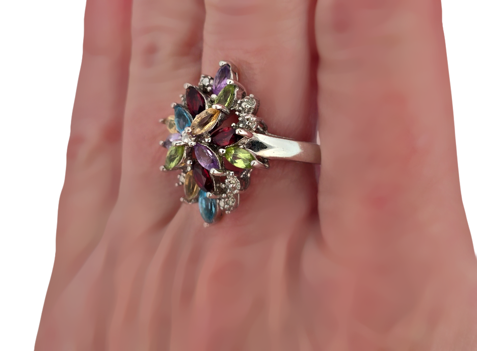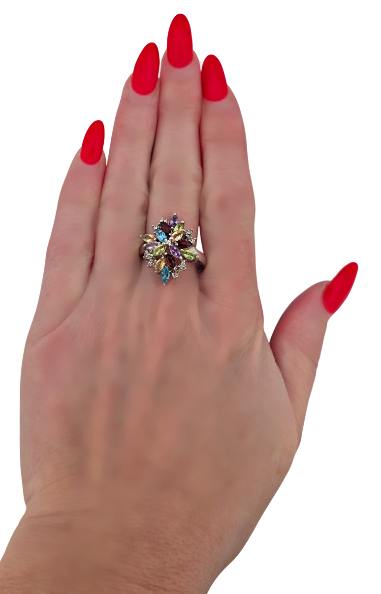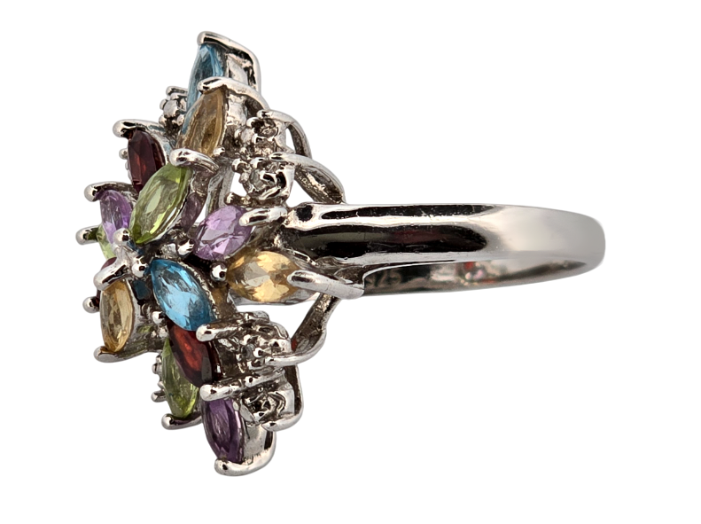 Popis: Stříbrný prsten ve tvaru květiny vykládané přírodními drahokamy – ametyst, citrín, granát, olivín a topaz. Všechny kameny jsou přírodní a mají tvar markýza s briliantovým brusem. Na prstenu jsou 3 kusy světle fialového ametystu, o váze cca 0,30 ct, 3 kusy žlutohnědého citrínu, o váze cca 0,30 ct, 3 kusy červeného granátu, o váze cca 0,45 ct, 3 kusy zelenožlutého olivínu, o váze cca 0,42 ct a 2 kusy modrého topazu, o váze cca 0,30 ct.