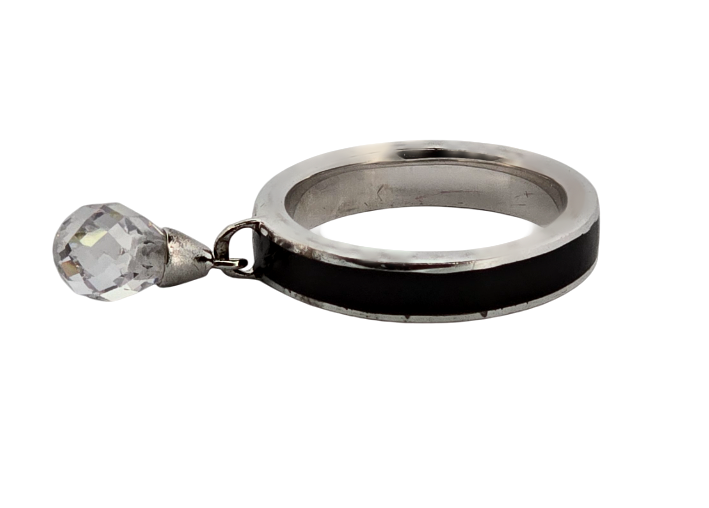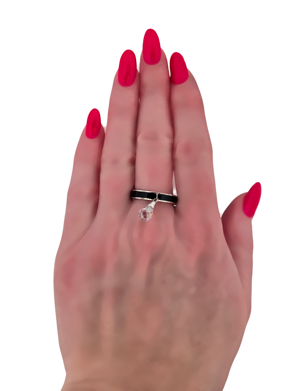 Popis: Velice zajímavý módní prsten s emailovým kroužkem a závěsem ve tvaru broušené kapky z křišťálu. Autorská práce. Signováno.