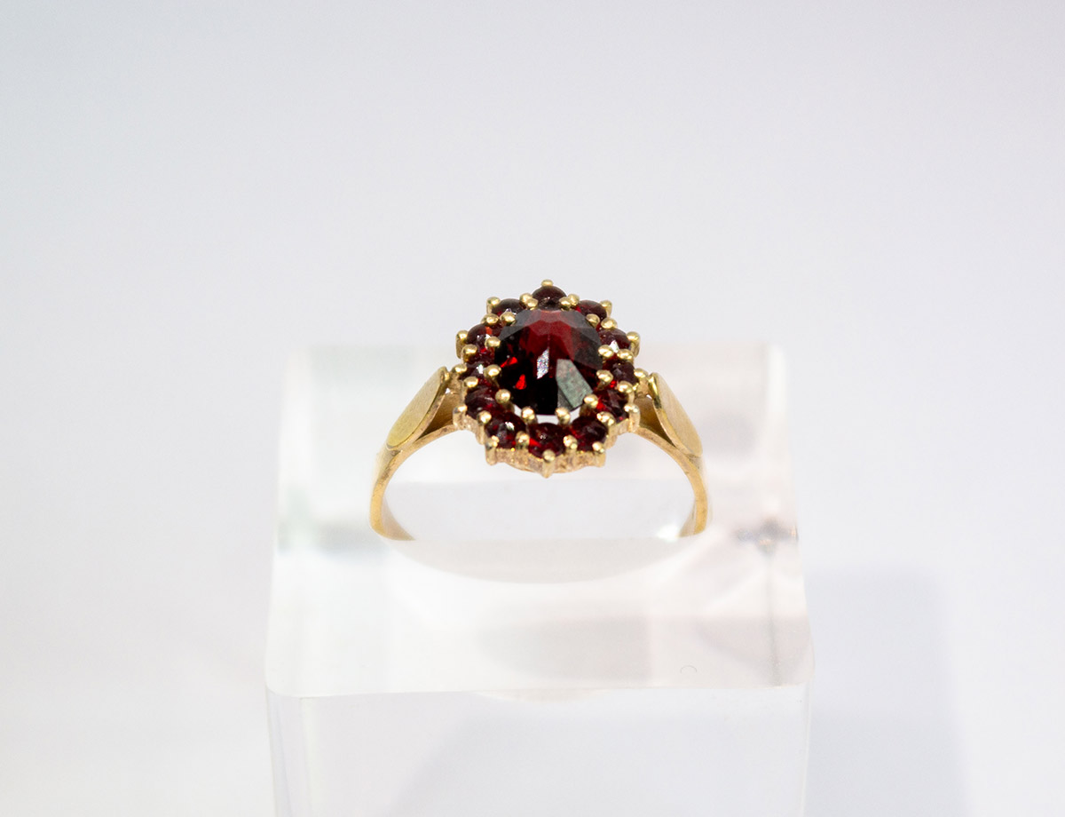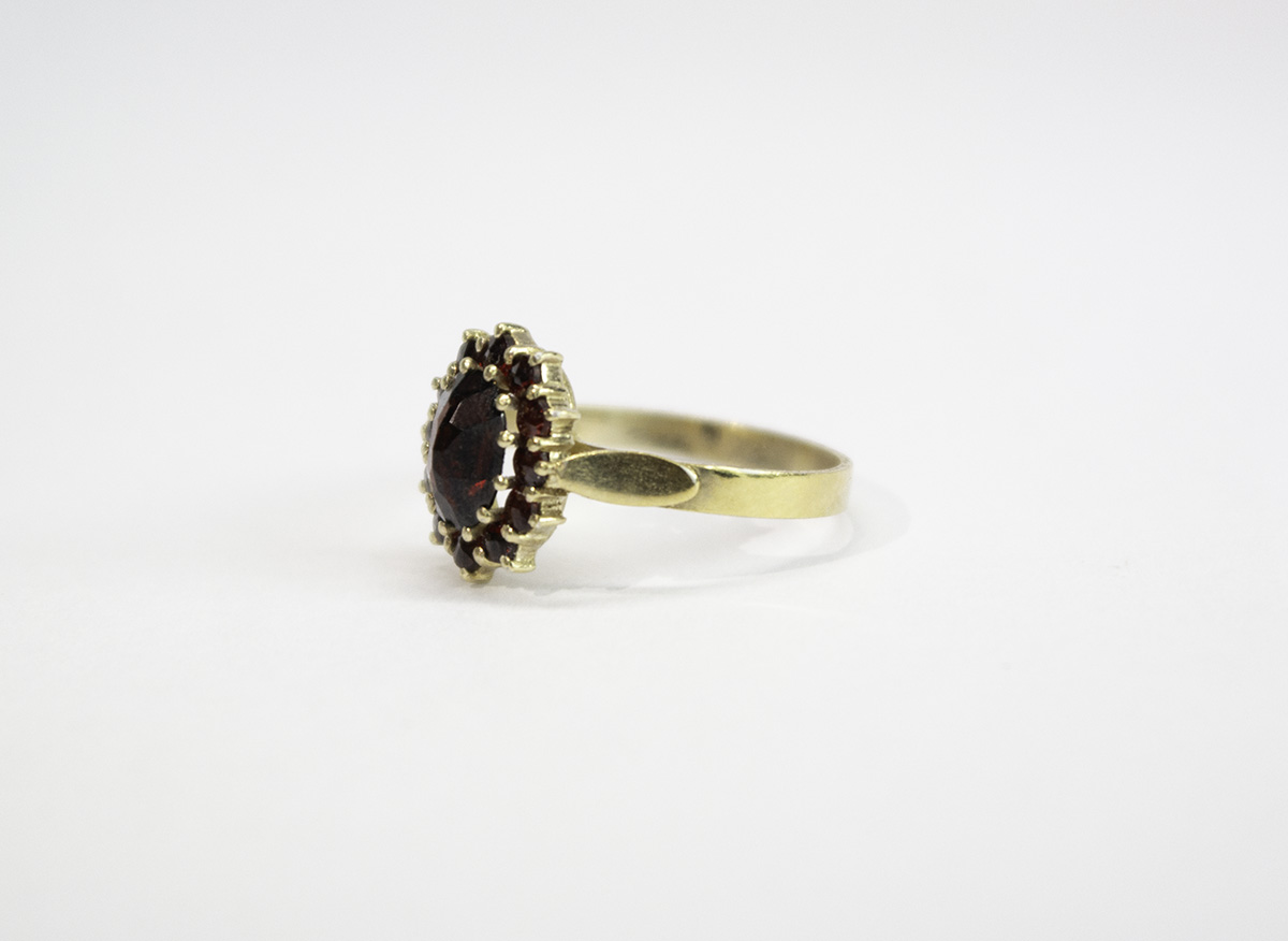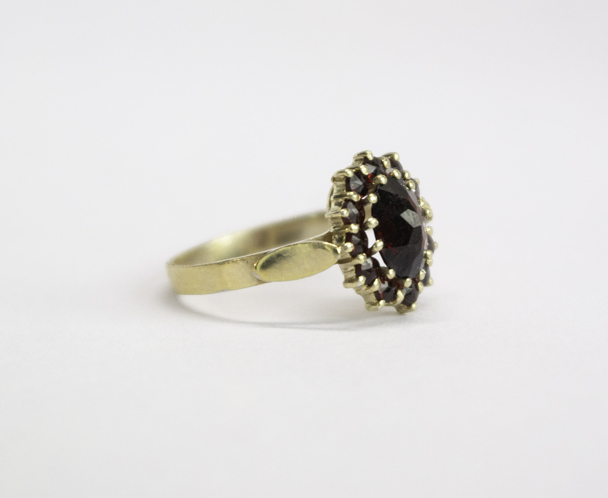 stříbrný zlacený prsten s granáty z české dílny Granát Turnov, 12 ks. českých granátů, centrální kámen je almandin o rozměru 6,6 x 8,7 mm, Ag btto 2,46 g/900/1000, Čechy, kolem r. 1965, rozměr hlavy 1,23 x 1,29 cm, velikost prstenu 55