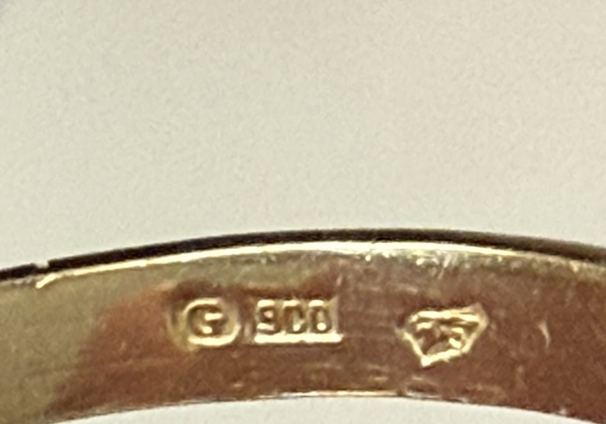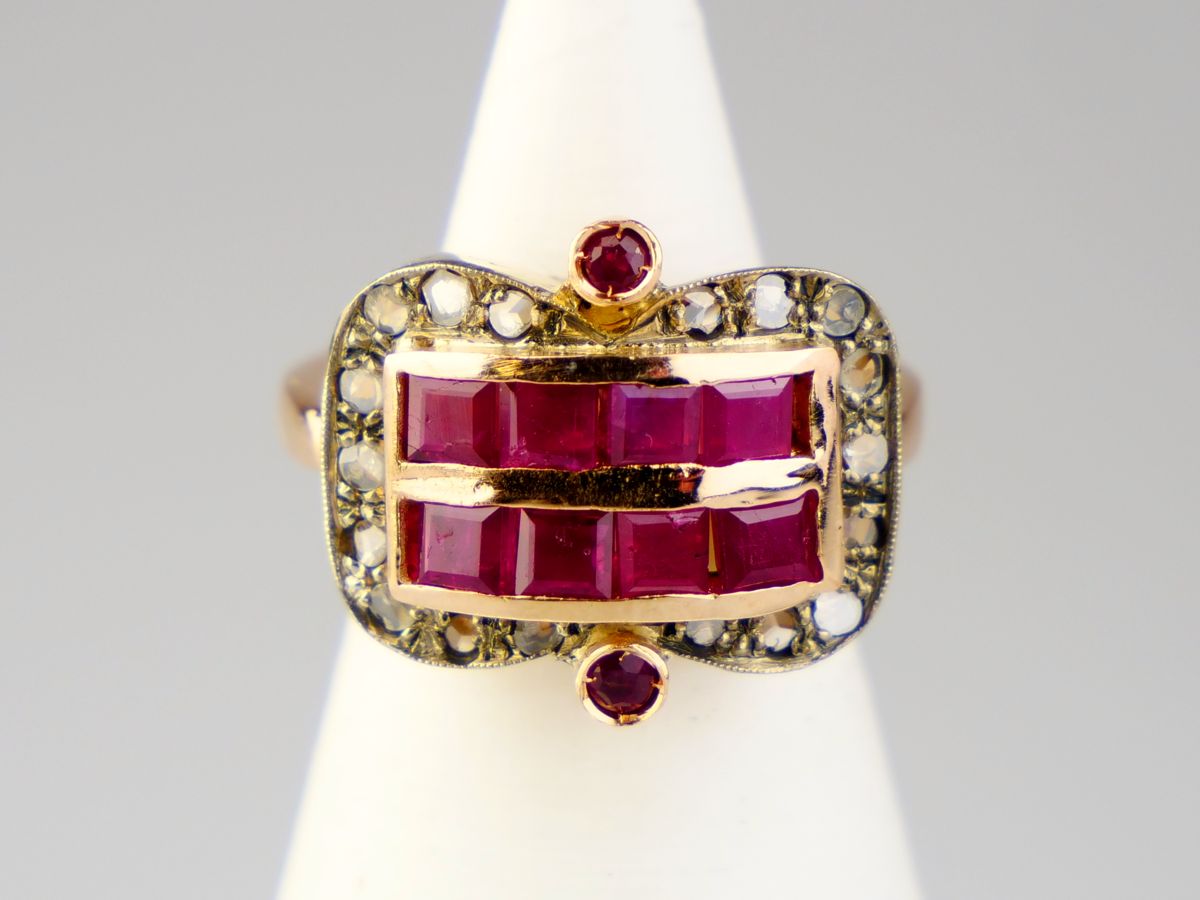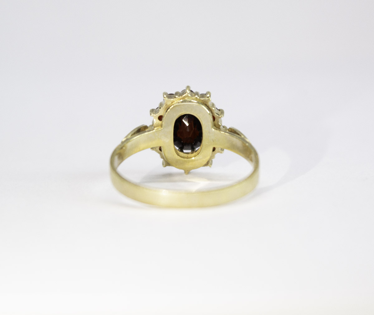 stříbrný zlacený prsten s granáty z české dílny Granát Turnov, 12 ks. českých granátů, centrální kámen je almandin o rozměru 6,6 x 8,7 mm, Ag btto 2,46 g/900/1000, Čechy, kolem r. 1965, rozměr hlavy 1,23 x 1,29 cm, velikost prstenu 55