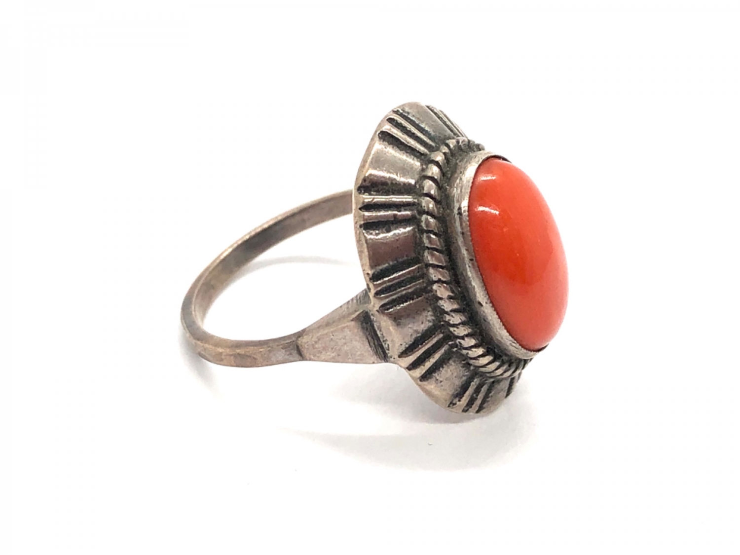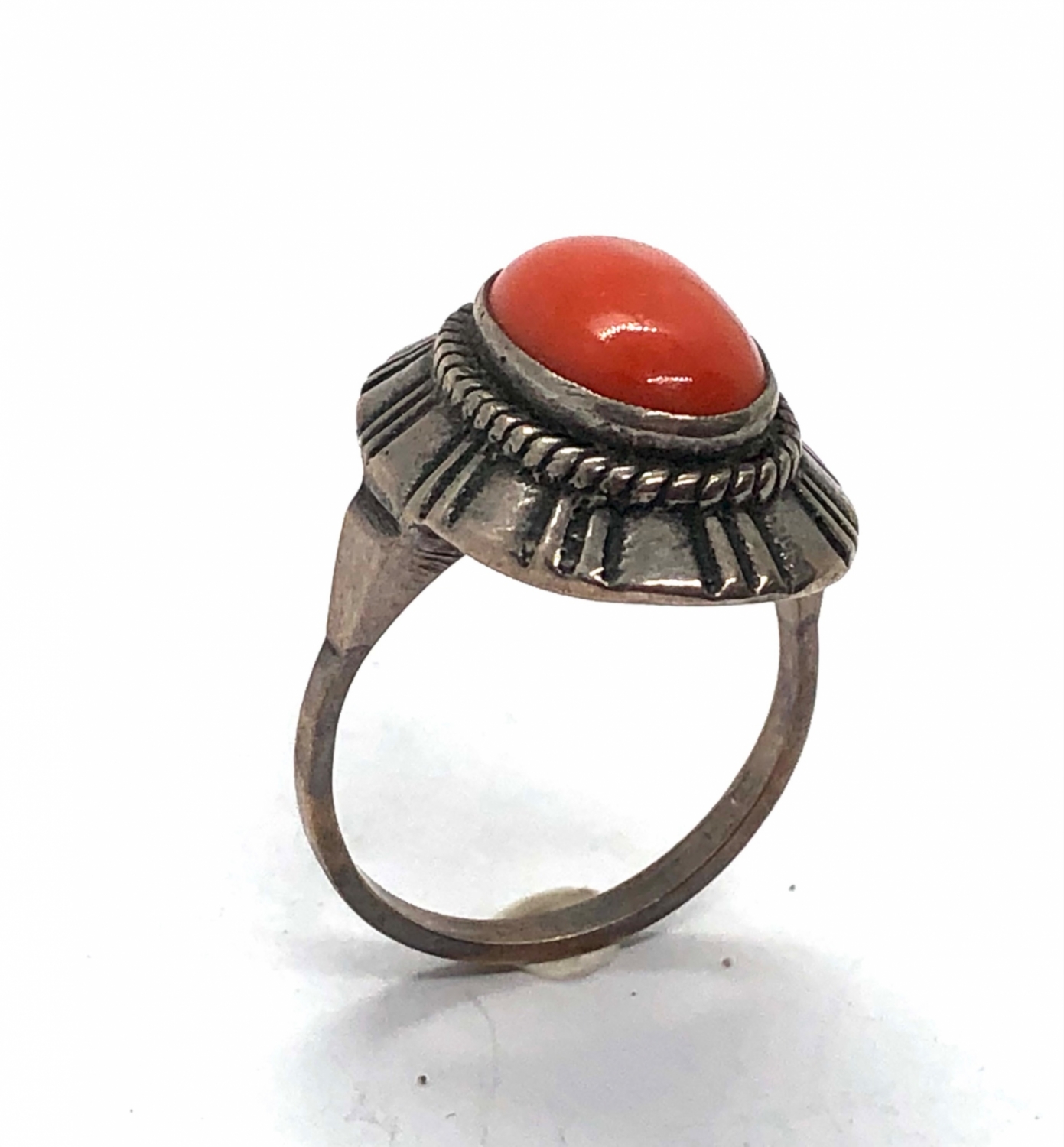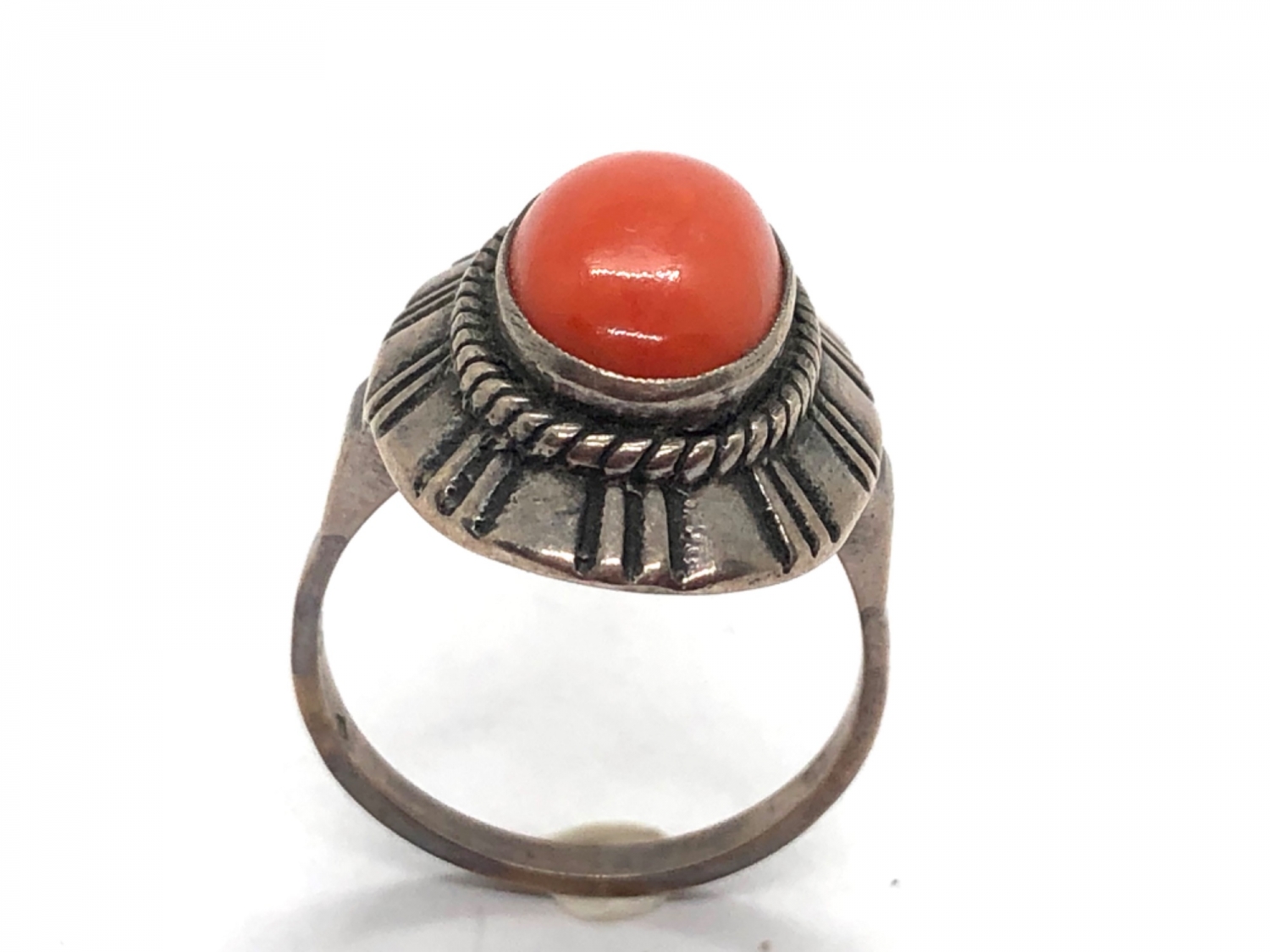 Stříbrný prsten s korálem ze 60. let minulého století, velikost prstenu 52; Ag btto 4,4g/800/1000.