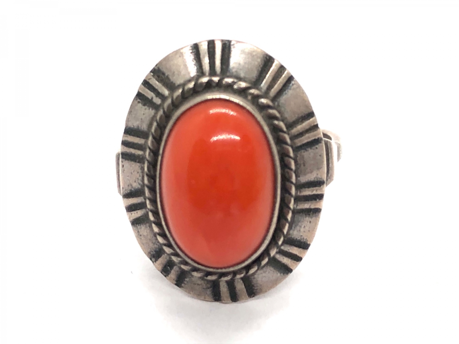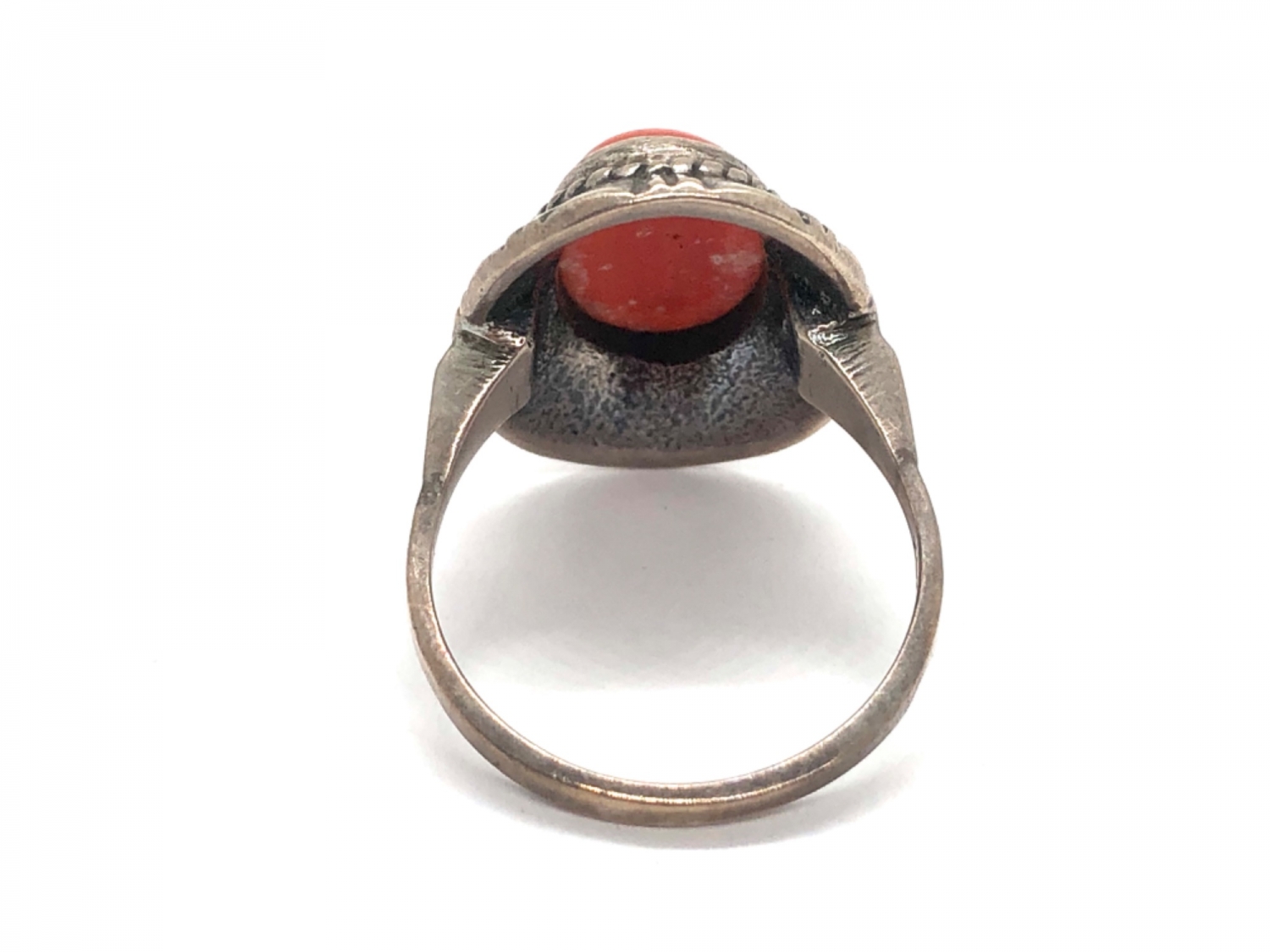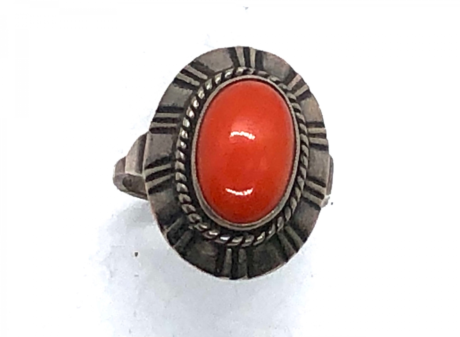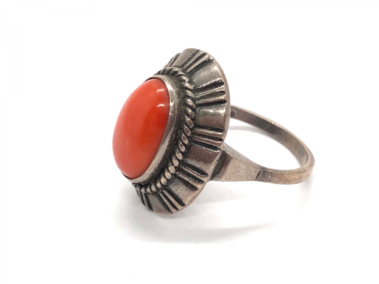 Stříbrný prsten s korálem ze 60. let minulého století, velikost prstenu 52; Ag btto 4,4g/800/1000.