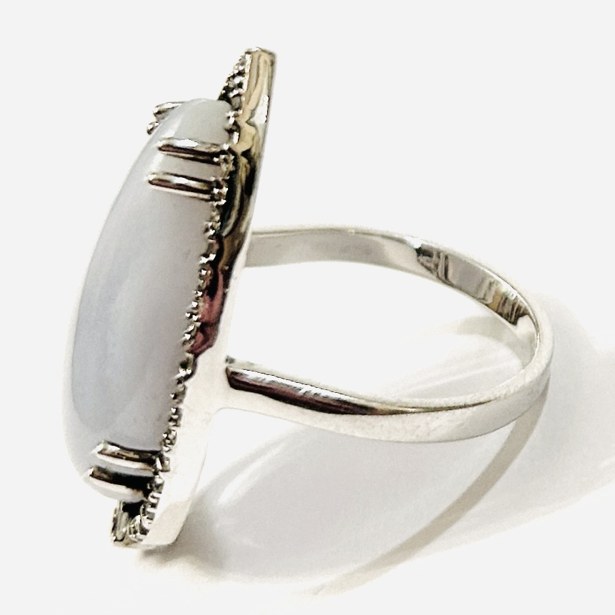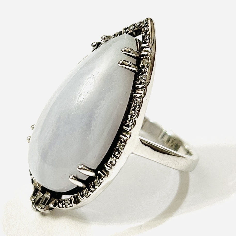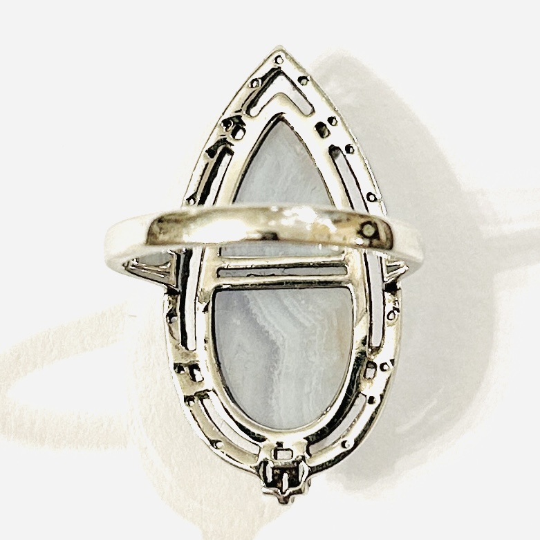 Výrazný prsten koktejlového typu, kterému vévodí kapková mugle přírodního modrého achátu fasovaná zdvojenými krapnami, v rámečku decentně osazeno čirými kameny kulatého a bagetového brusu. Solidní západoevropská práce z 1. čtvrtiny 21. století.
