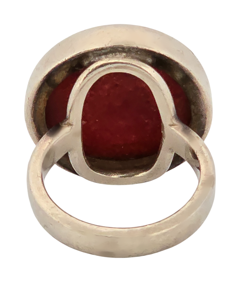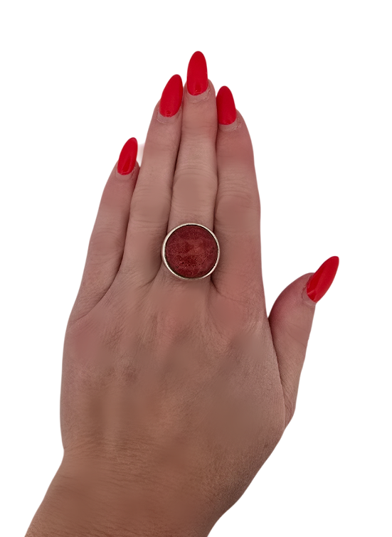 Popis: Stříbrný masivní prsten s přírodním žíhaným korálem sytě červené barvy.