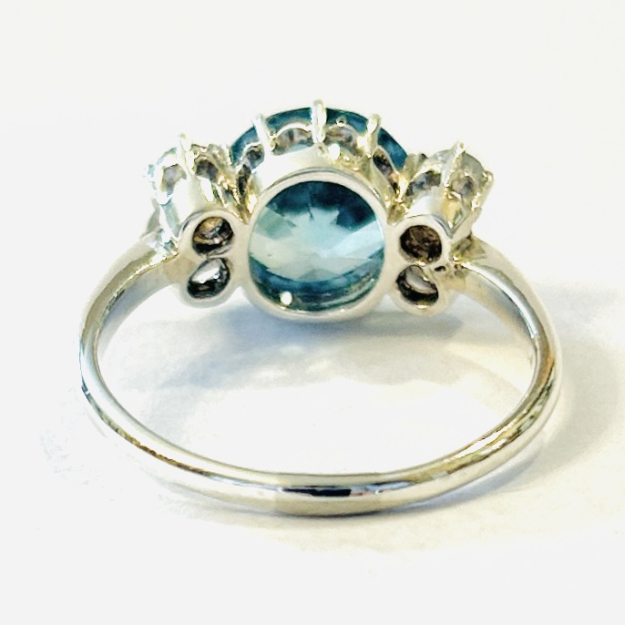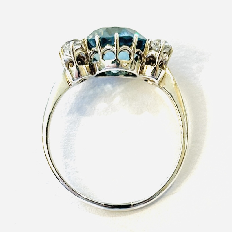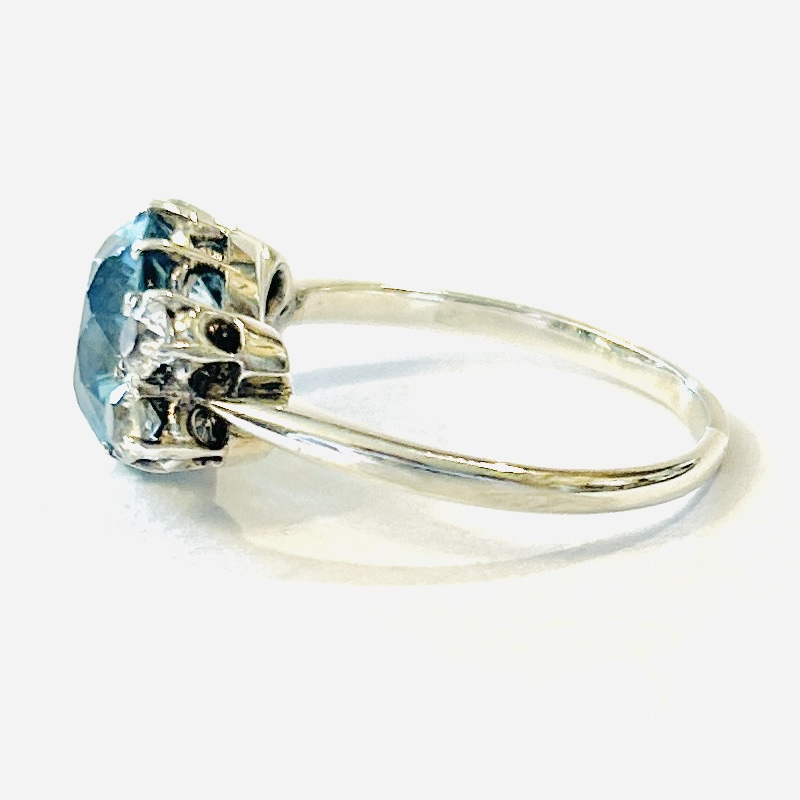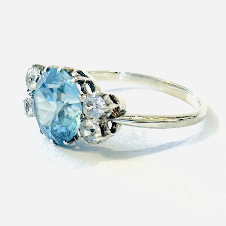 Elegantní, starožitný prsten, jemuž vévodí přírodní modrý spinel kulatého brusu, po každé straně doplněno vždy 2 přírodními křišťály kulatého brusu. Kameny jsou velmi dobré kvality a jsou fasovány v mnohokrapnové prořezávané koruně. Precizní západoevropská klenotnická práce z počátku 20. století.