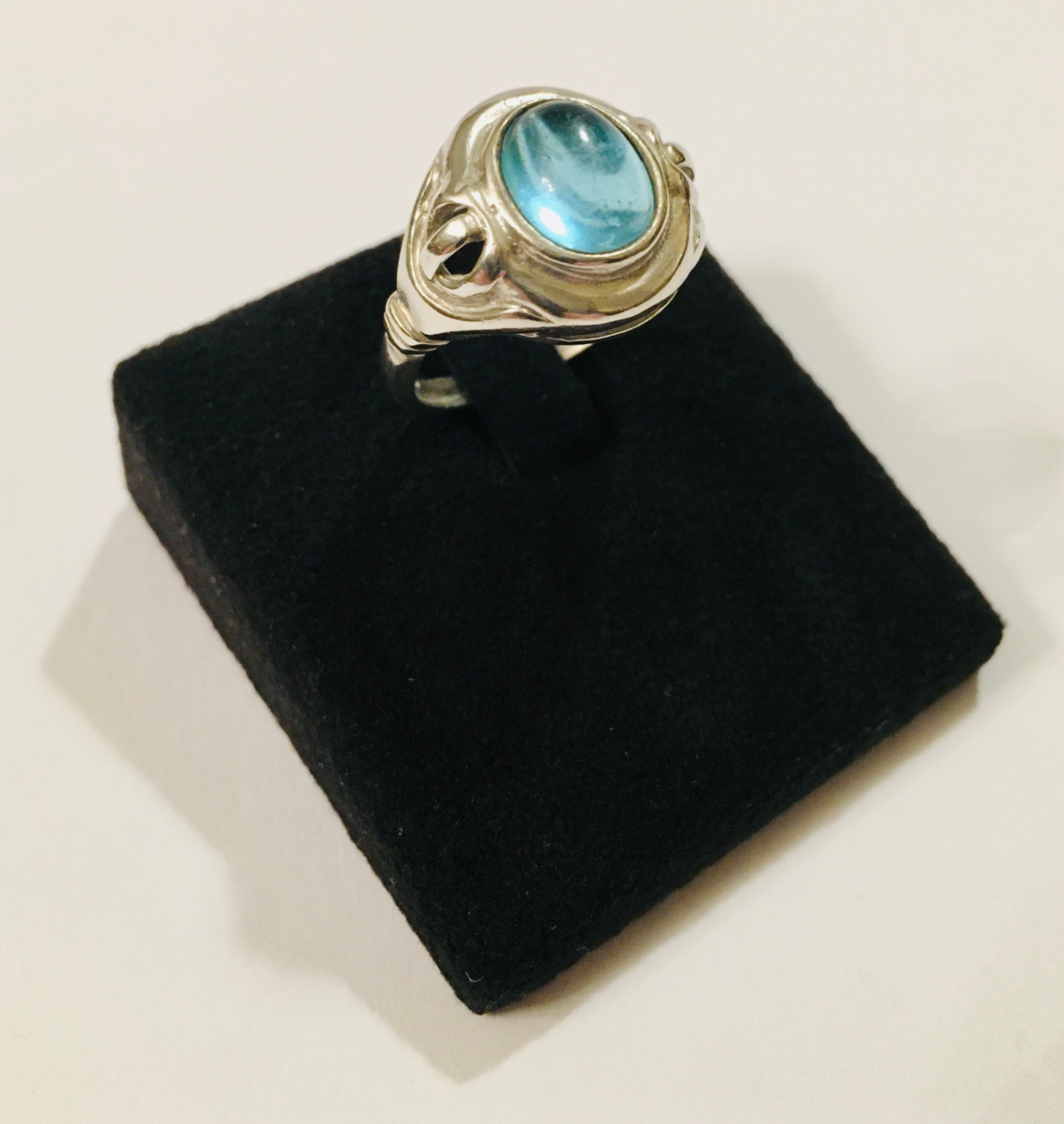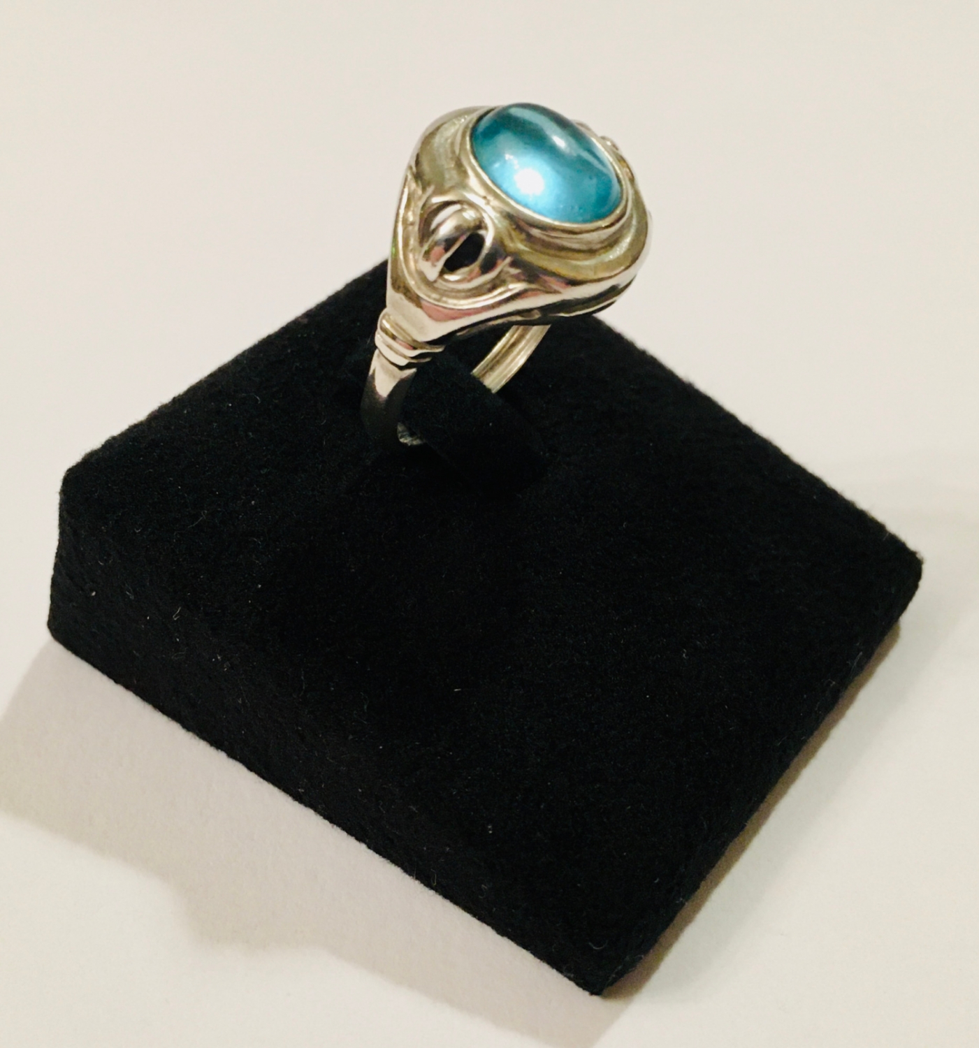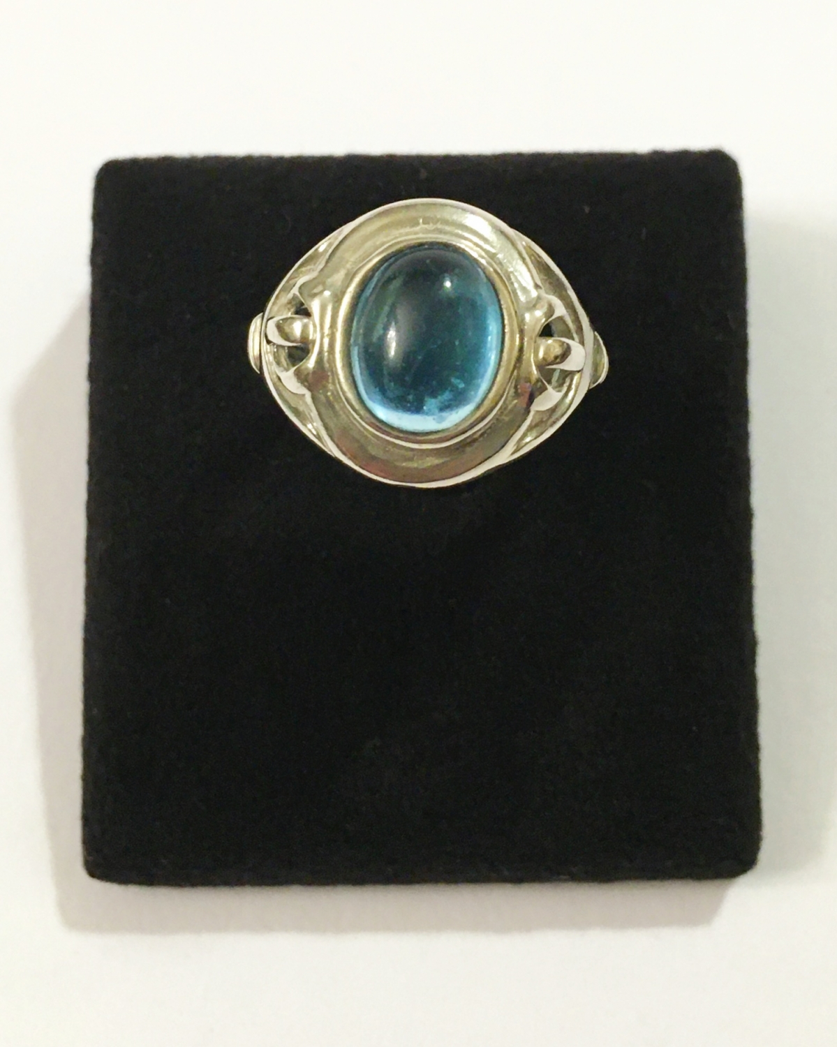 Osobitý stříbrný prsten s robusnější hlavicí osazenou přírodním topazem ve tvaru oválné mugle. Hlavice na několika místech odlehčena zdobnými otvory. Vkusný a nápadný šperk. Zhotoveno ze stříbra o ryzosti 925/1000; nově opatřeno puncem S-61 (kozlík 2) z vnitřní strany. Hmotnost je 3,88 g. Velikost prstenu je 56. Délka hlavice je 14 mm. Ve velmi dobrém stavu.